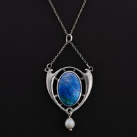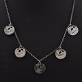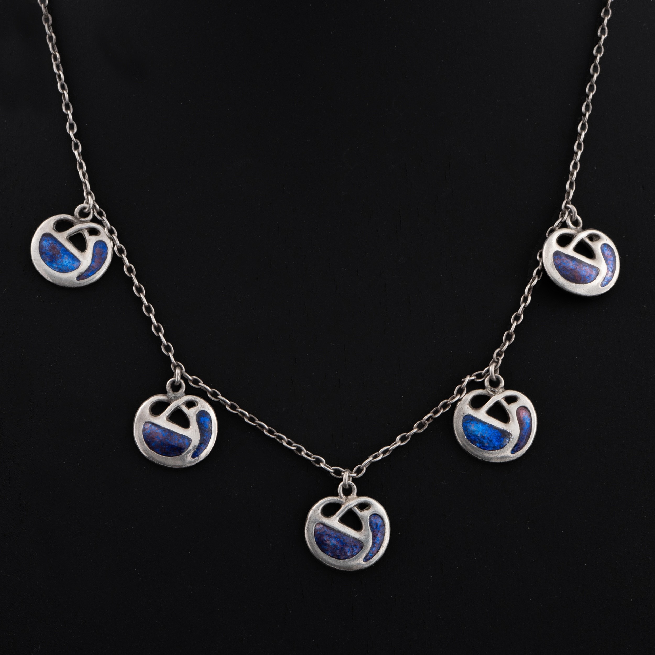 A Charles Horner Arts and Crafts silver and enamel necklace, decorated with five identical silver knot-type designs infilled with violet and blue enamel, with 'CH' maker's mark and Chester hallmarks for 1909, total chain length 43.9cm, total weight 9g. (LDC14911)