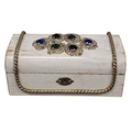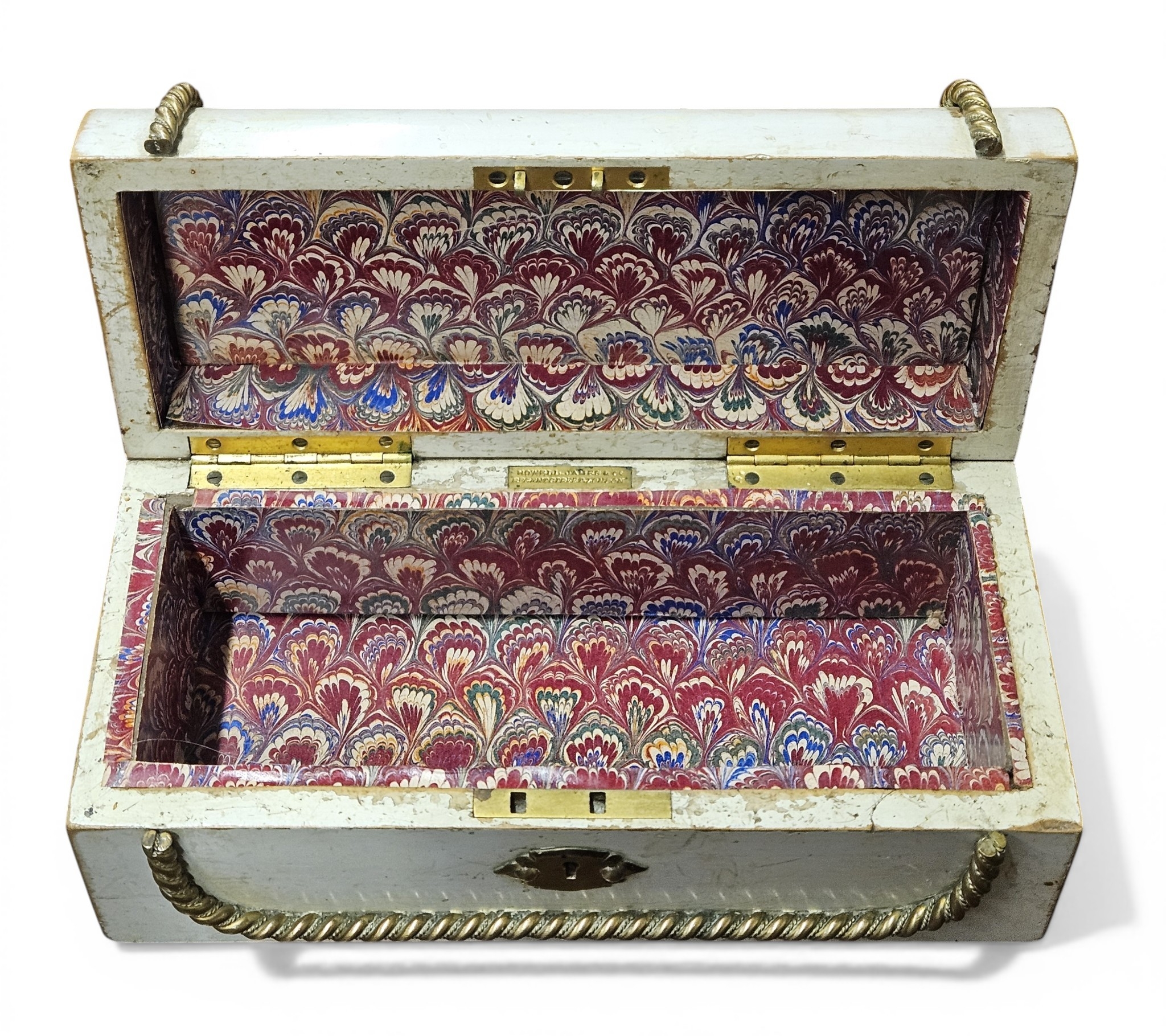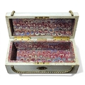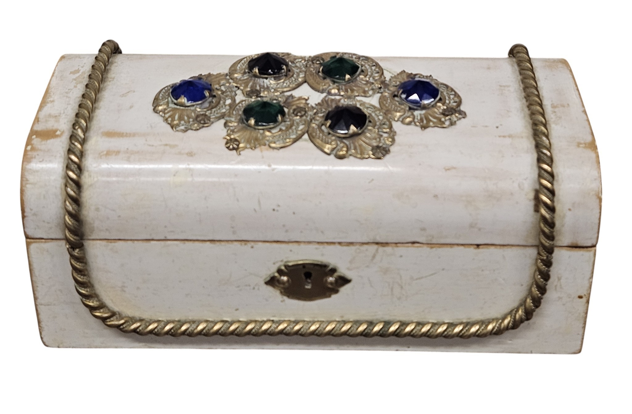 A superb Howell and James Regent St London late 19th Century Jewellery Casket in original colour with rope edge gilded brass strap decoration with coloured stones. Name plate inside with details of maker. 25 x 11 x 11 cm approx.