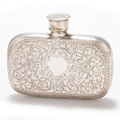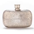 by Josiah Williams & Co, Exeter 1875, of rounded rectangular form, with screw cap, engraved with scrolling foliage and flowers, two vacant cartouches. 8cm by 9.5cm, 4 troy ounces