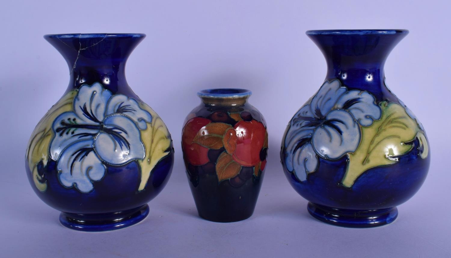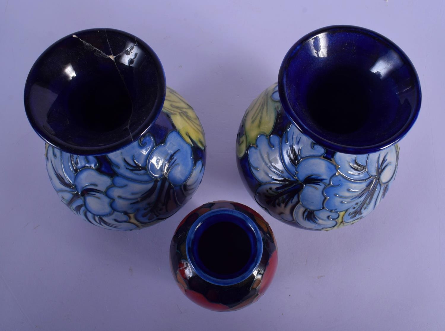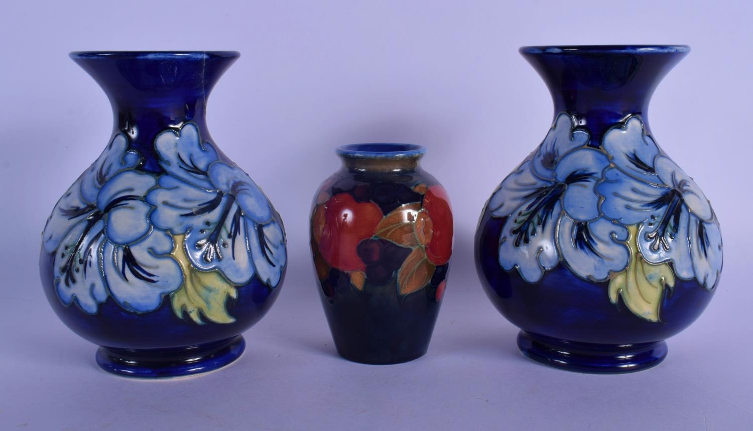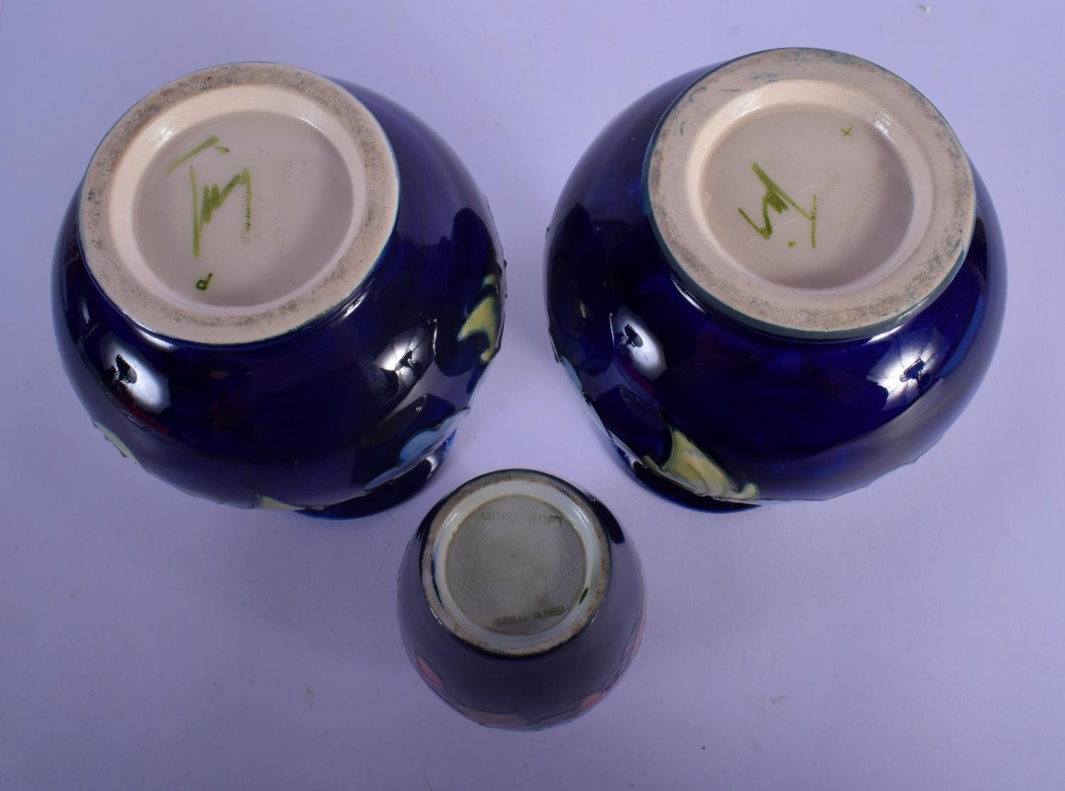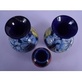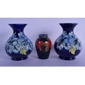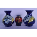 A PAIR OF MOORCROFT VASES and a William Moorcroft pomegranate vase. Largest 15 cm high. (3)