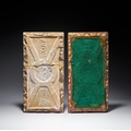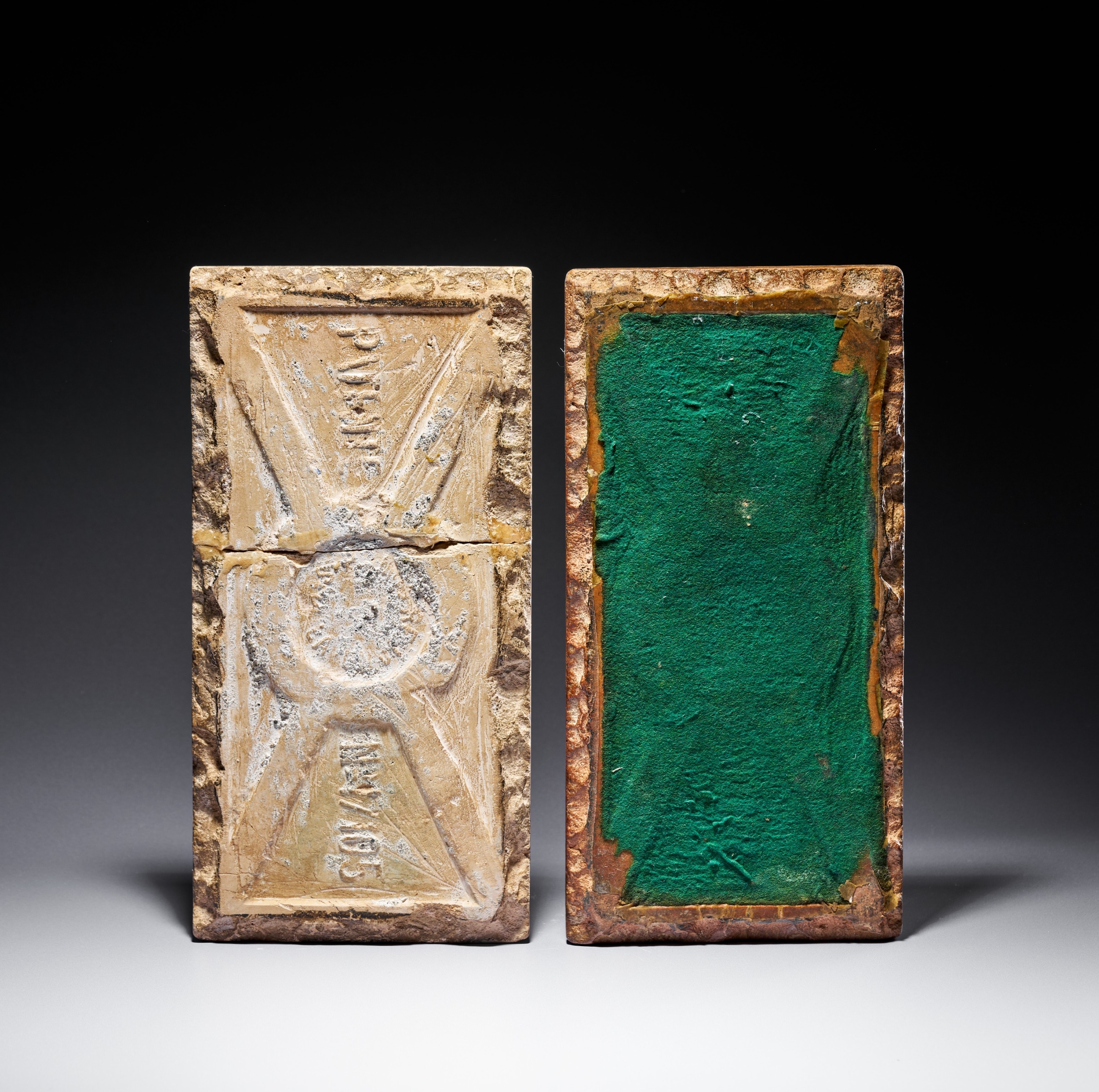 A pair of rectangular glazed earthenware tiles produced in the arista or cuenca technique, characterized by raised molded ridges that separate the colored glazes. The decorative program features a polychrome geometric interlacing pattern known as laceria, centered on eight-pointed stars and strapwork forming octagonal and diamond-shaped cells. The color palette includes cobalt blue, emerald green, honey-amber, and manganese purple-black glazes against a cream-white ground. The reverse of one tile features molded panels with the raised letters PUBING in the upper section and the model number No 7405 in the lower section. A circular mark is present in the center but is illegible due to wear. The second tile is backed with green felt.