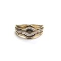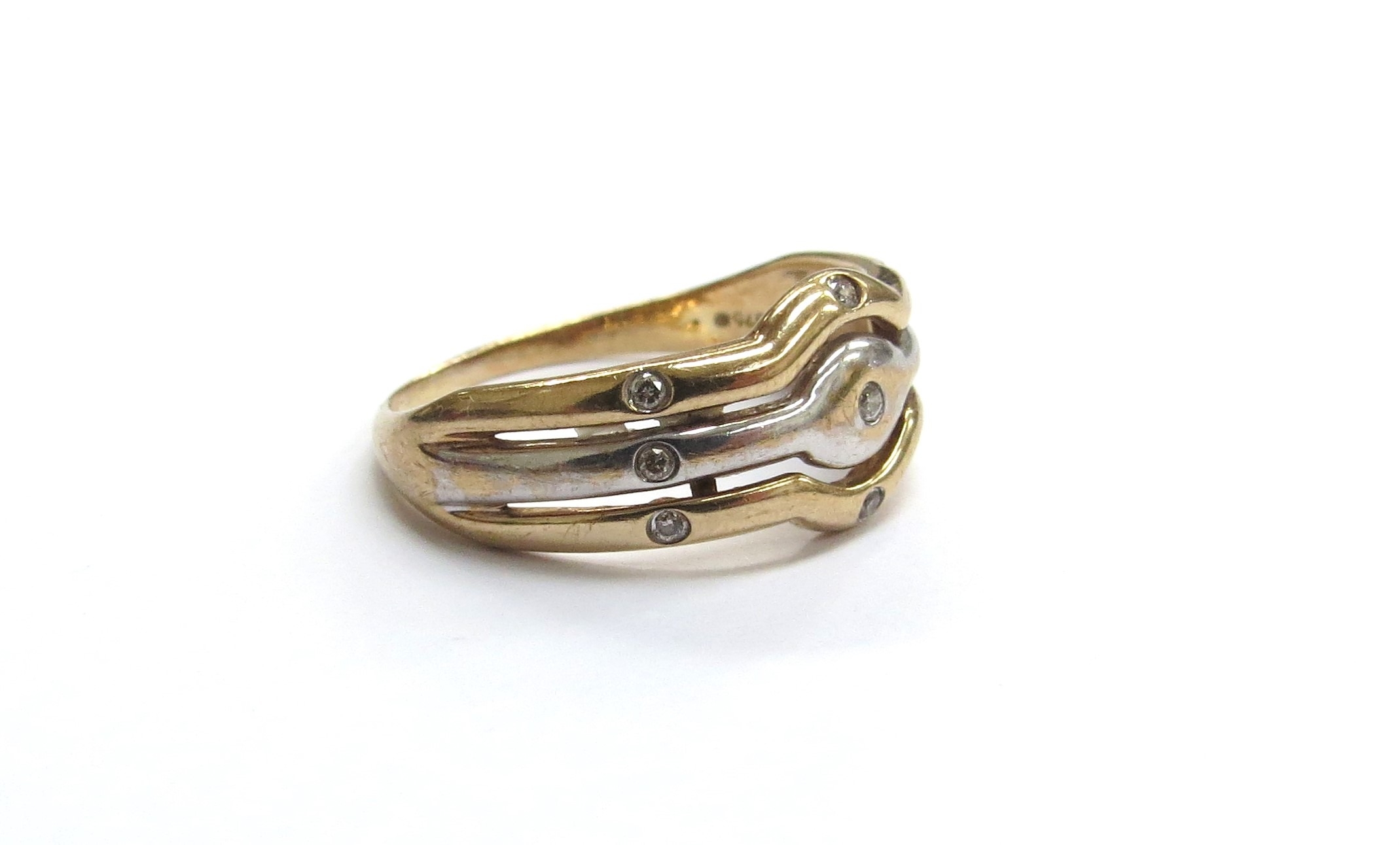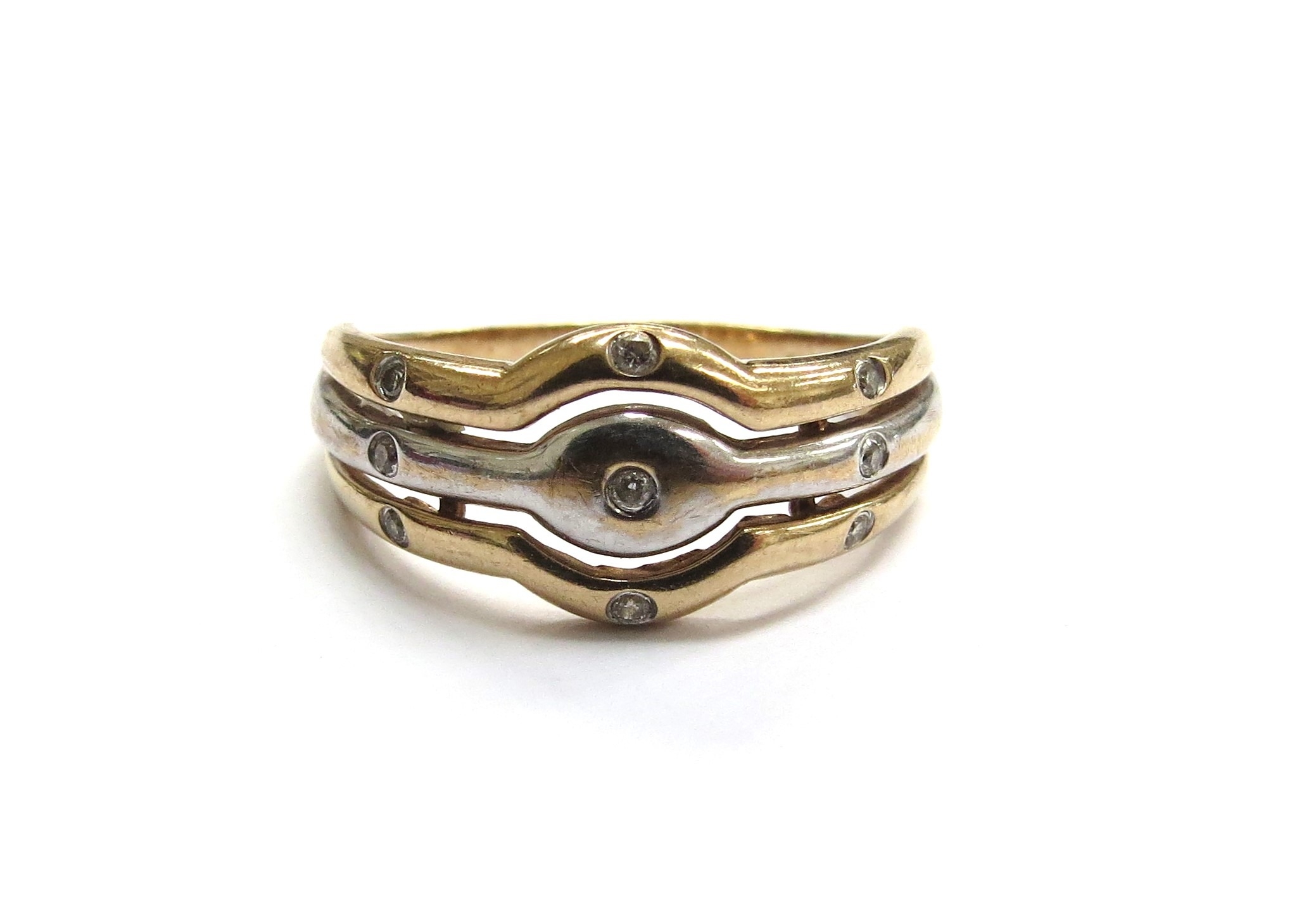 A 9ct gold two tone ring with three open bands set with small diamonds. Size S/T, 3.7g