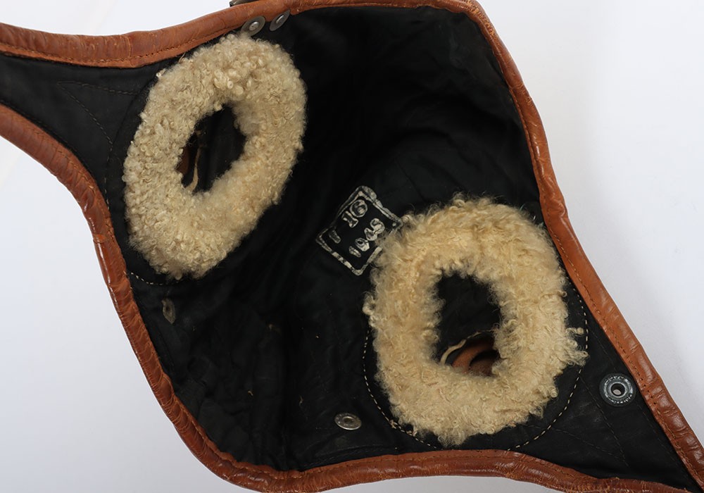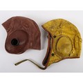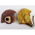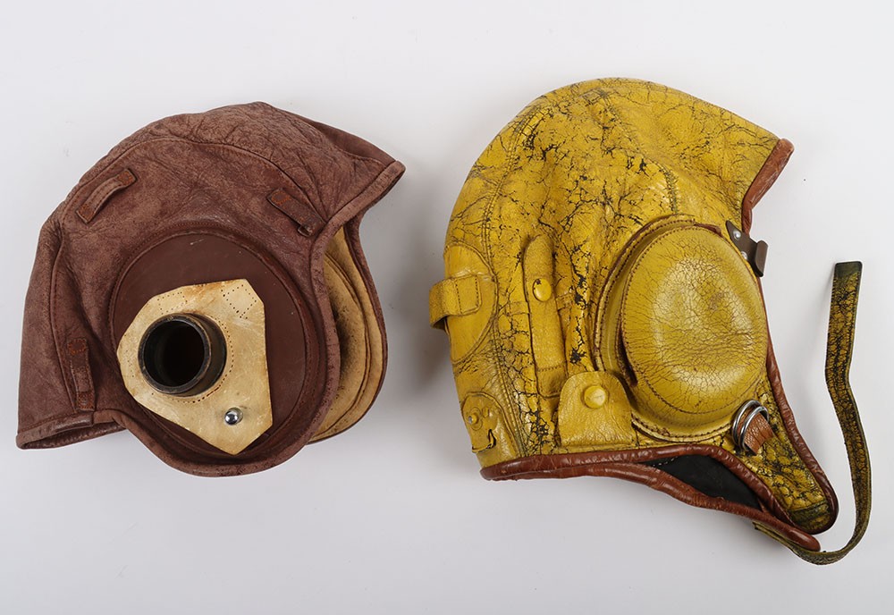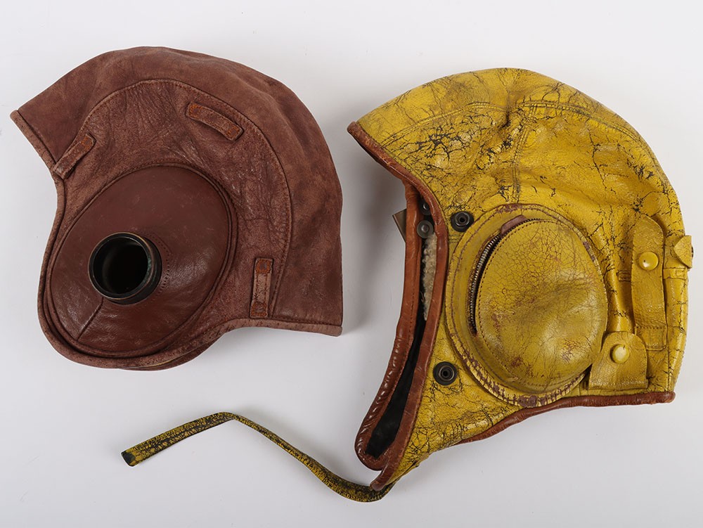Two Flying Helmets, One Swedish 1945 and One US Navy Gosport Type. Two flying helmets, a yellow painted leather helmet dated 1945 with the Swedish crown trio inside. The other a US Navy gosport type. Both in used condition with age related wear.
