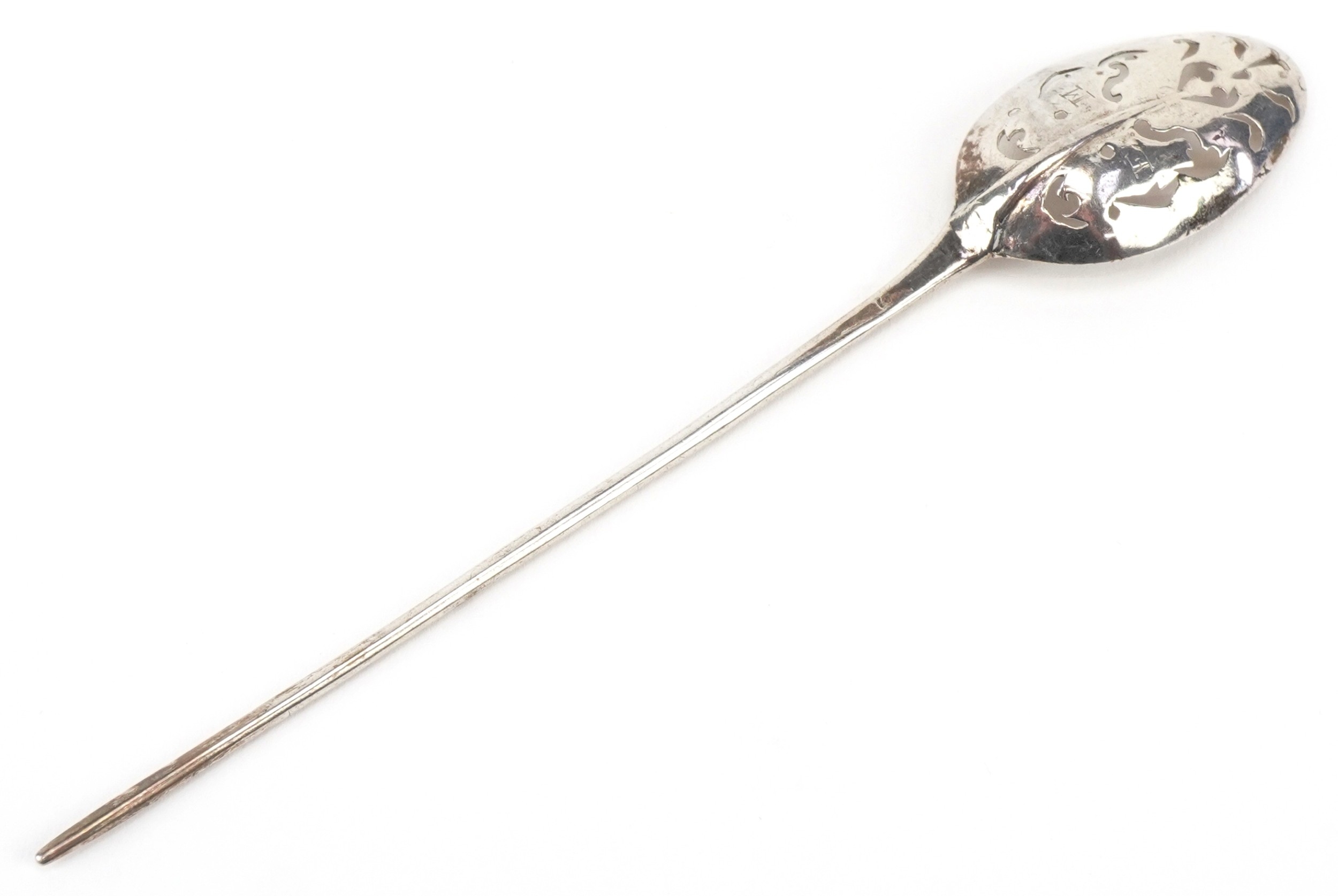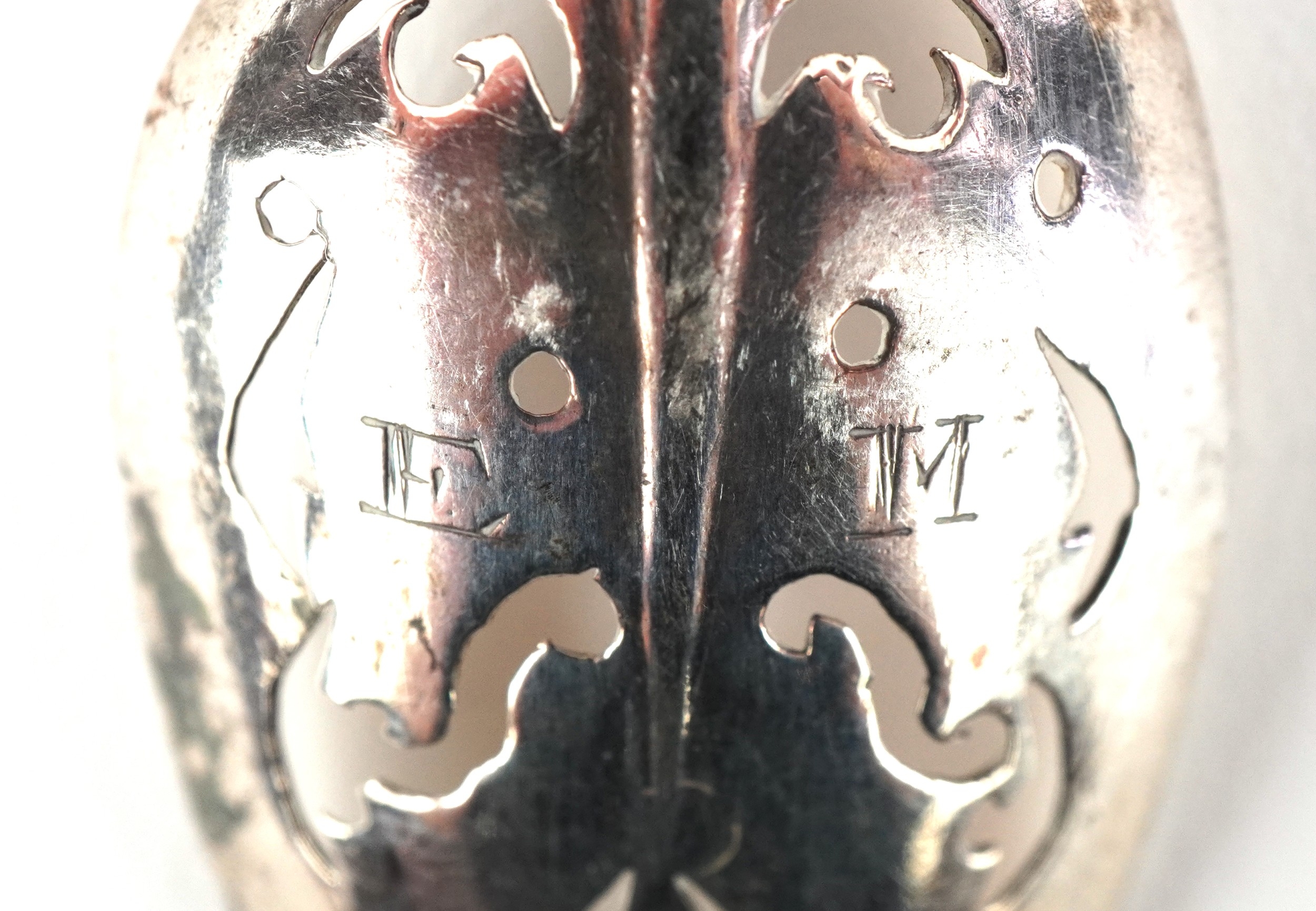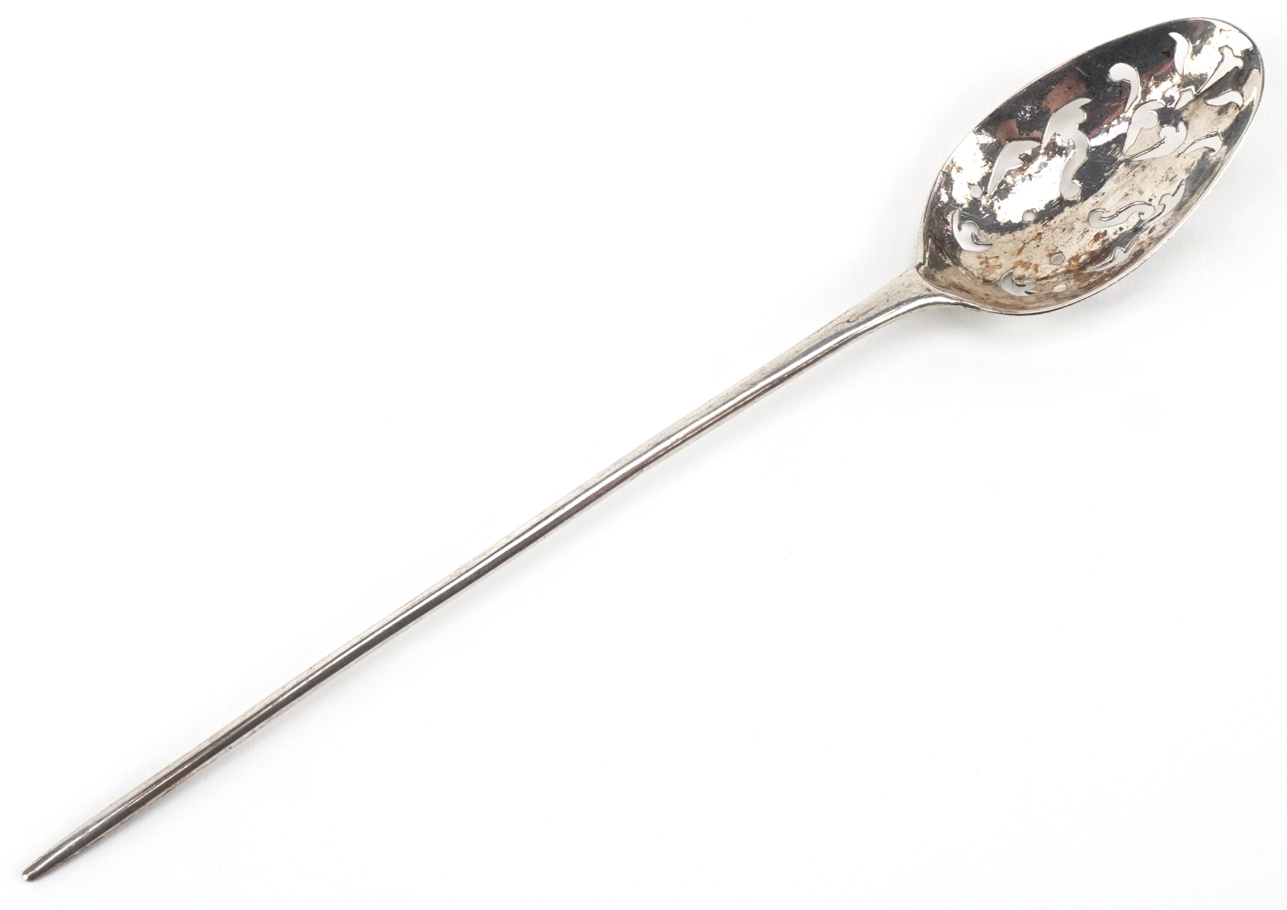 An 18th century silver mote spoon, the bowl pierced with scroll decoration, 15cm in length, 9.2g.