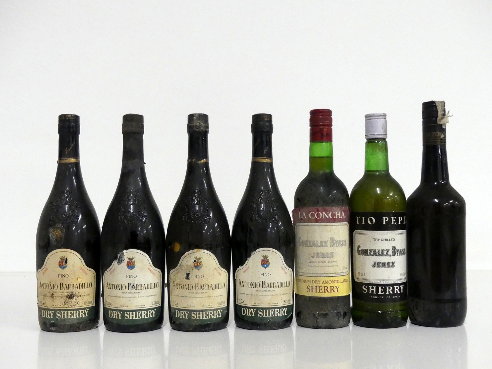 4 bts Antonio Barbadillo Fino Dry Sherry NV bs 1 bt Gonzalez Byass La Concha Medium Dry Amontillado NV bs 1 bt Gonzalez Byass Tio Pepe NV 1 bt Don Zollo Unknown Sherry NV bs, missing label Above 7 bottles