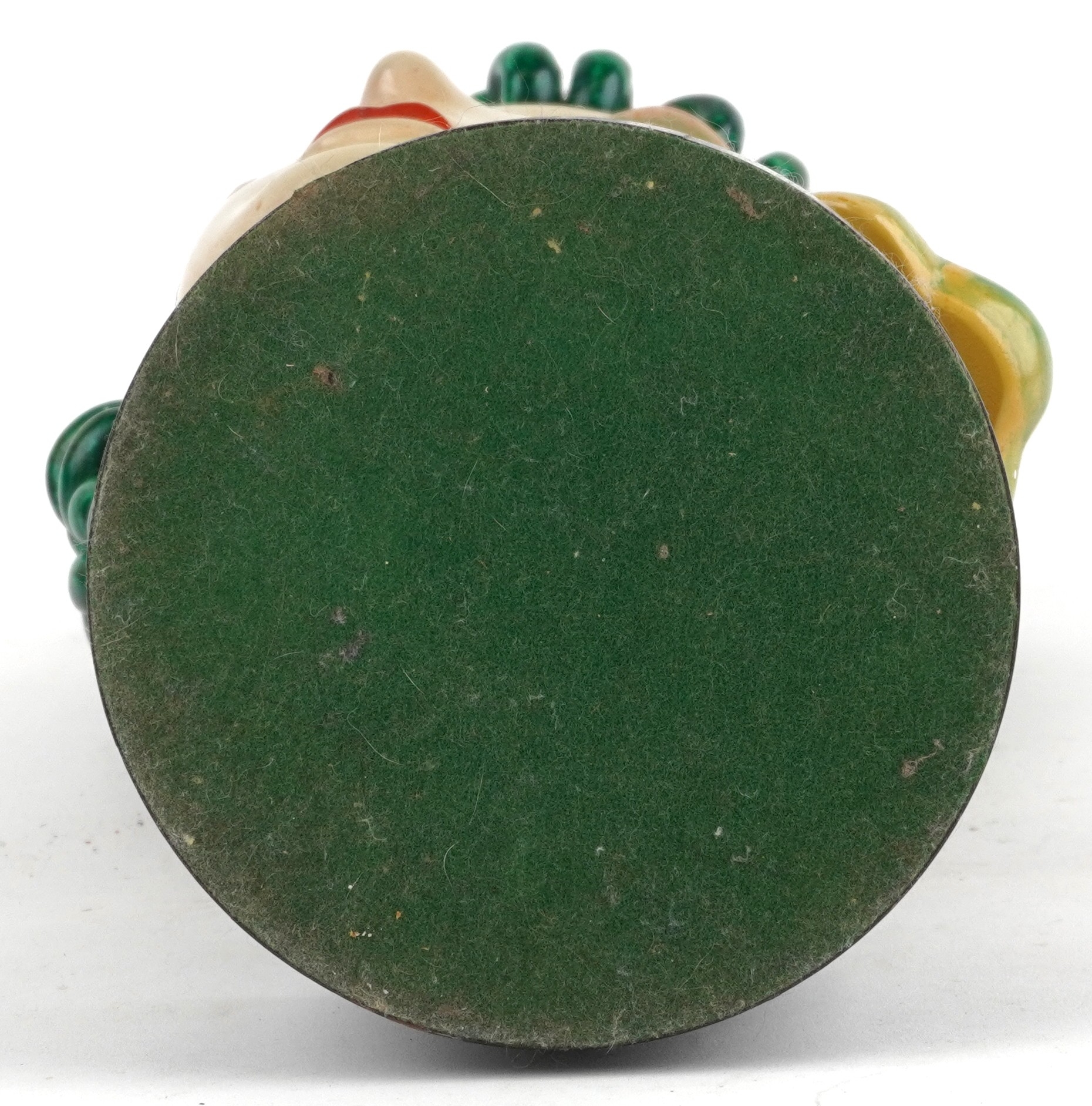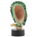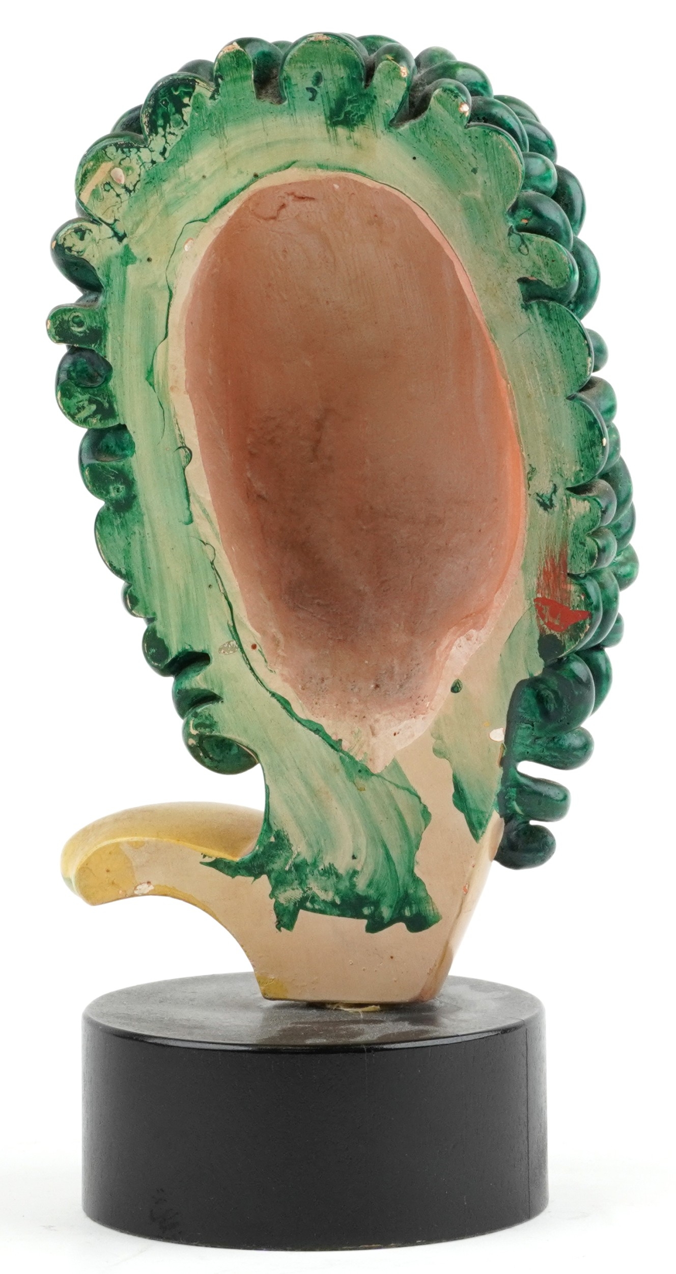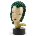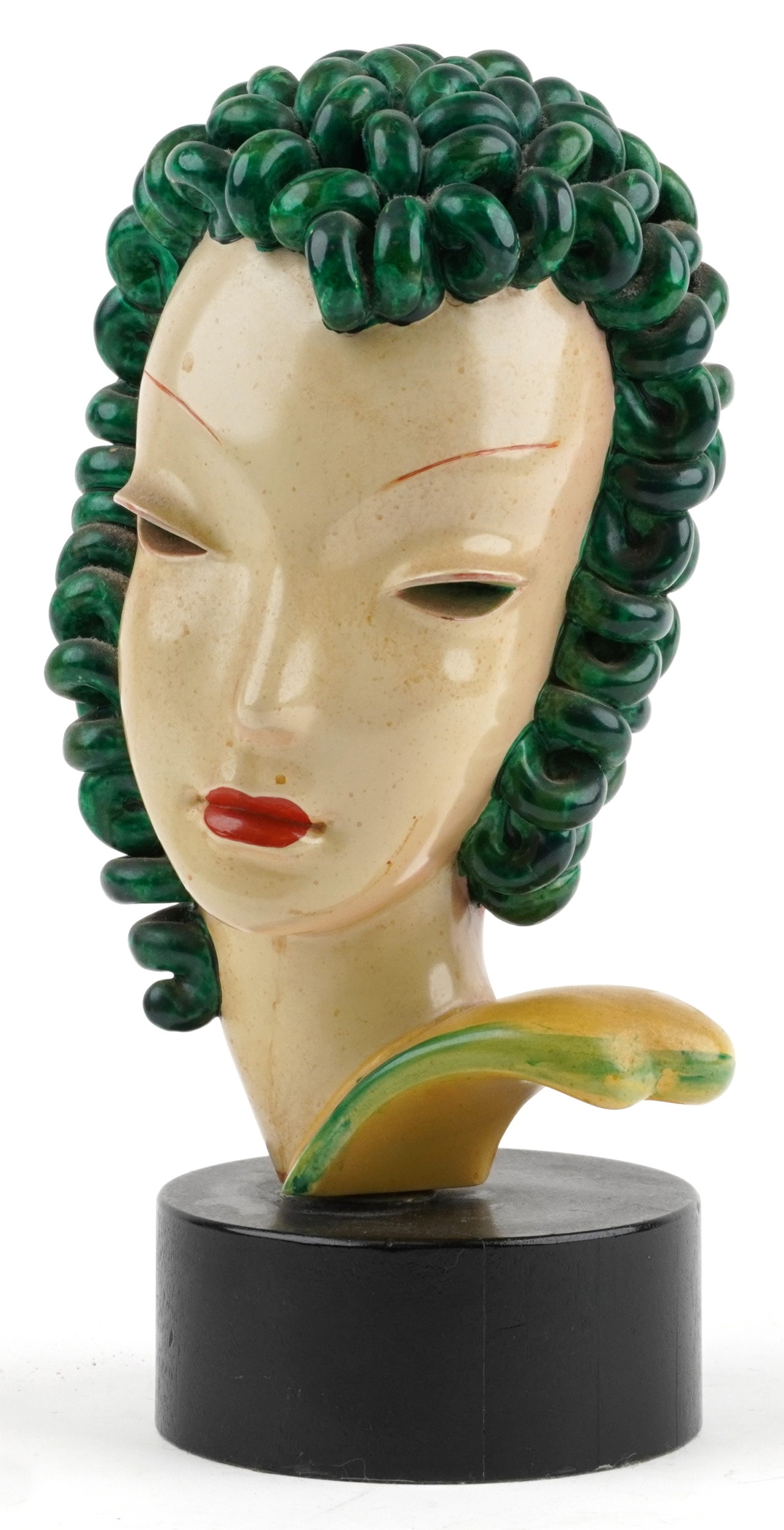 An Art Deco terracotta female mask raised on a circular base, probably Goldscheider, 31cm high.