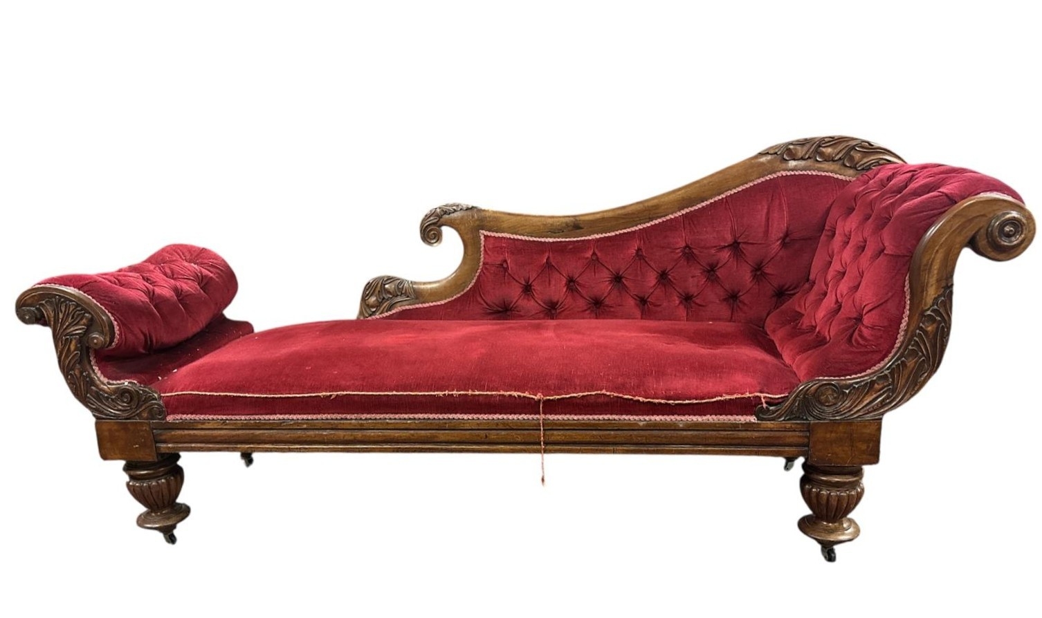 A WILLIAM IV CARVED MAHOGANY AND UPHOLSTERED CHAISE LONGUE the shaped top rail with foliate carving above a buttoned upholstered back and seat with scroll over arms with foliate carved arm supports on lobed and turned legs 83cm (h) x 214cm (w) x 67cm (d)