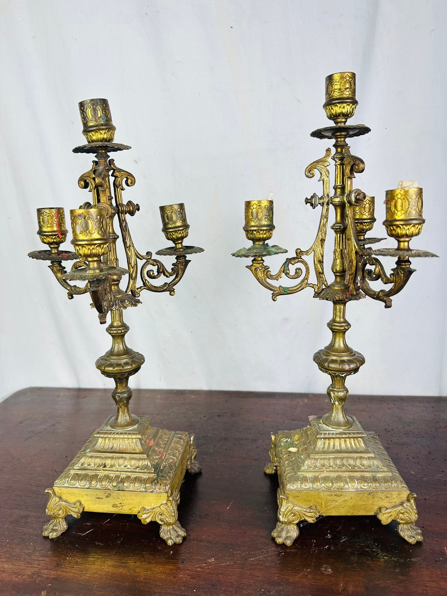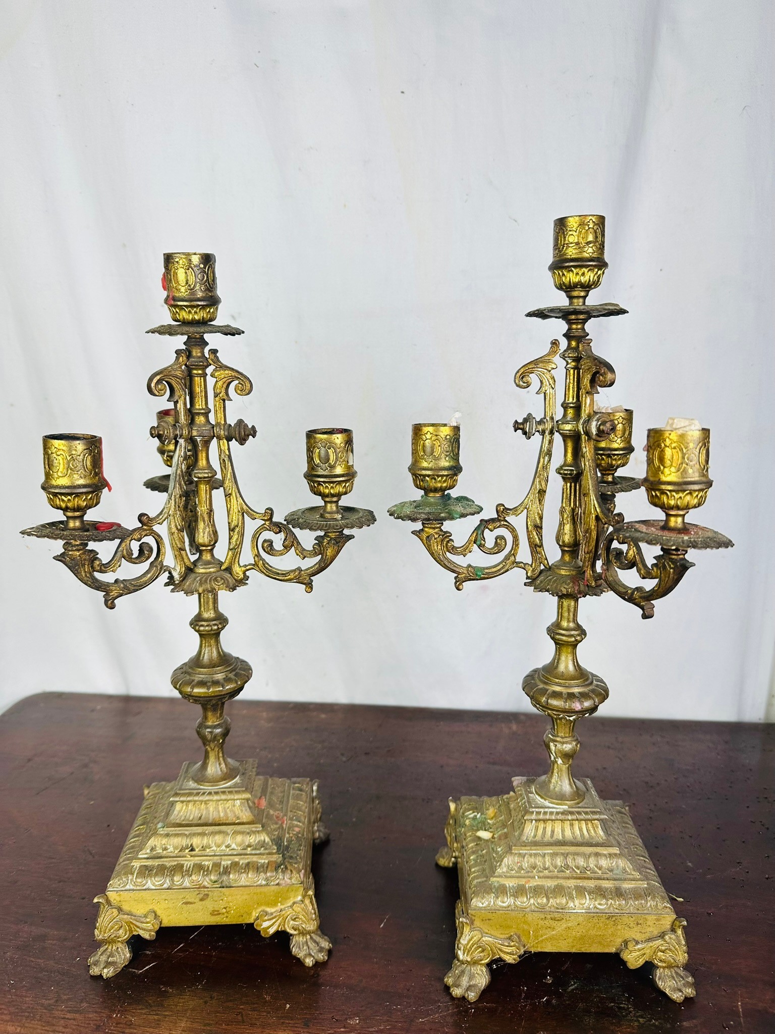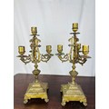 A pair of French brass 5 branch candelabras, 16''h, possibly 18th century