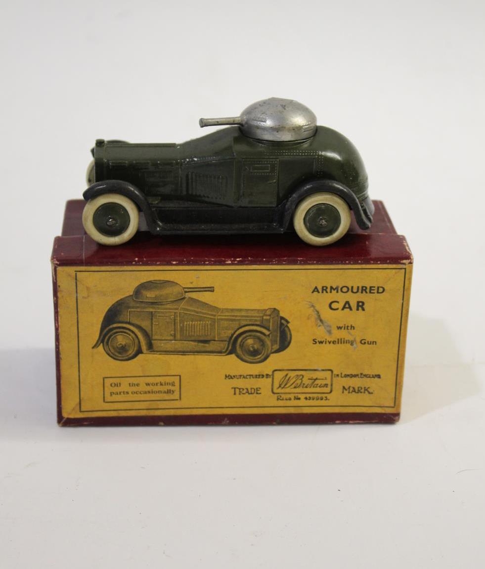 BRITAINS - BOXED ARMOURED CAR No 1321, the armoured car in gloss green finish with black running boards, silver turret and white smooth rubber tyres. Boxed.