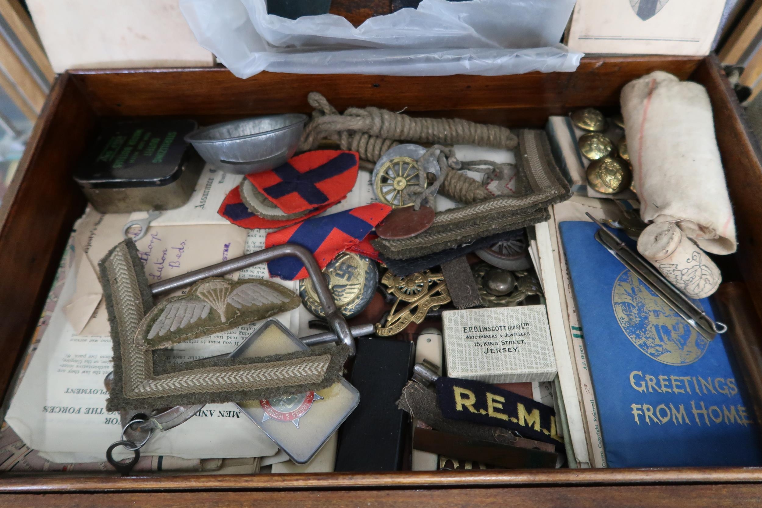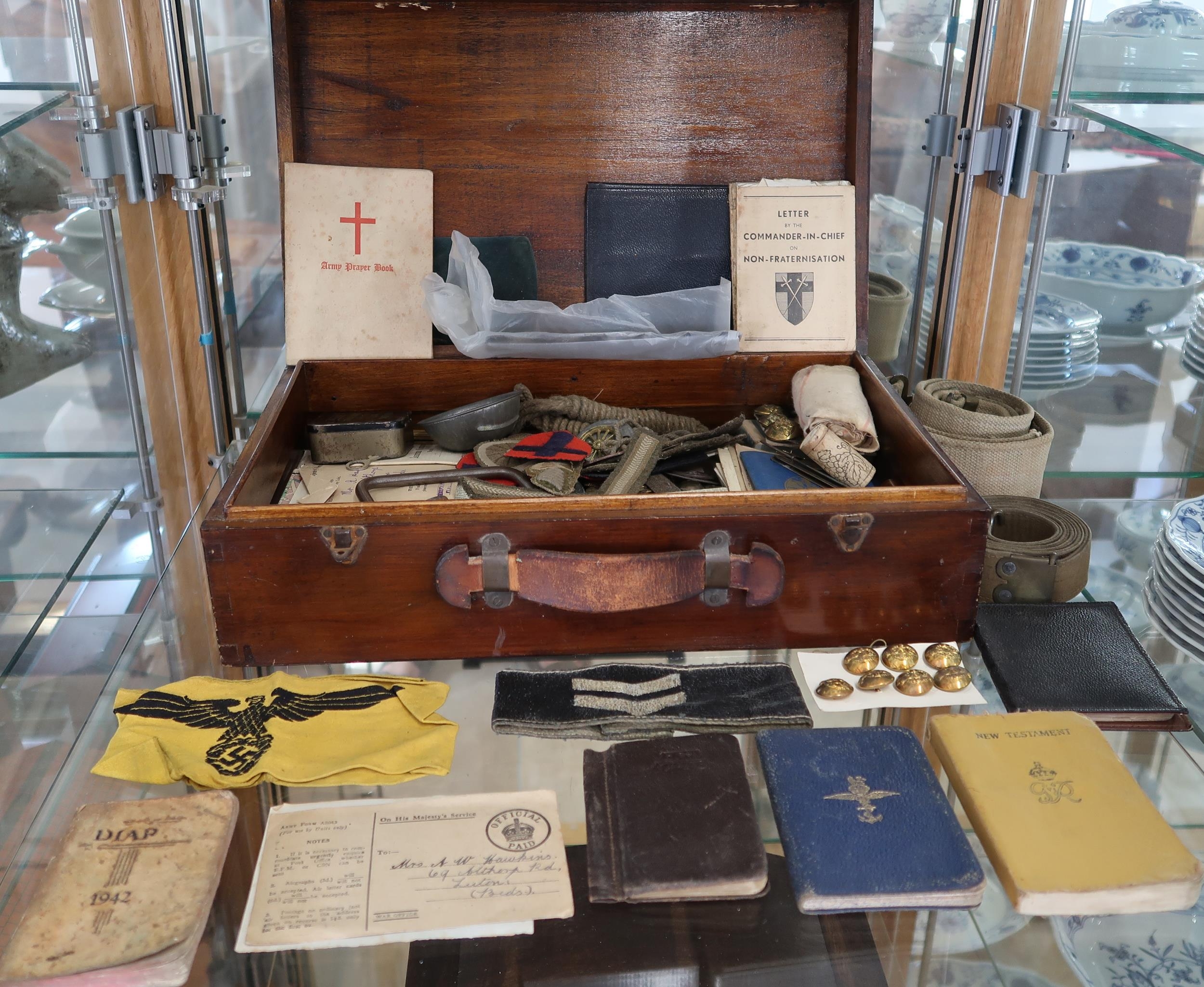 A wooden box containing a large quantity of personal Military items, letters, diaries, medals, badges, German armbands etc