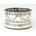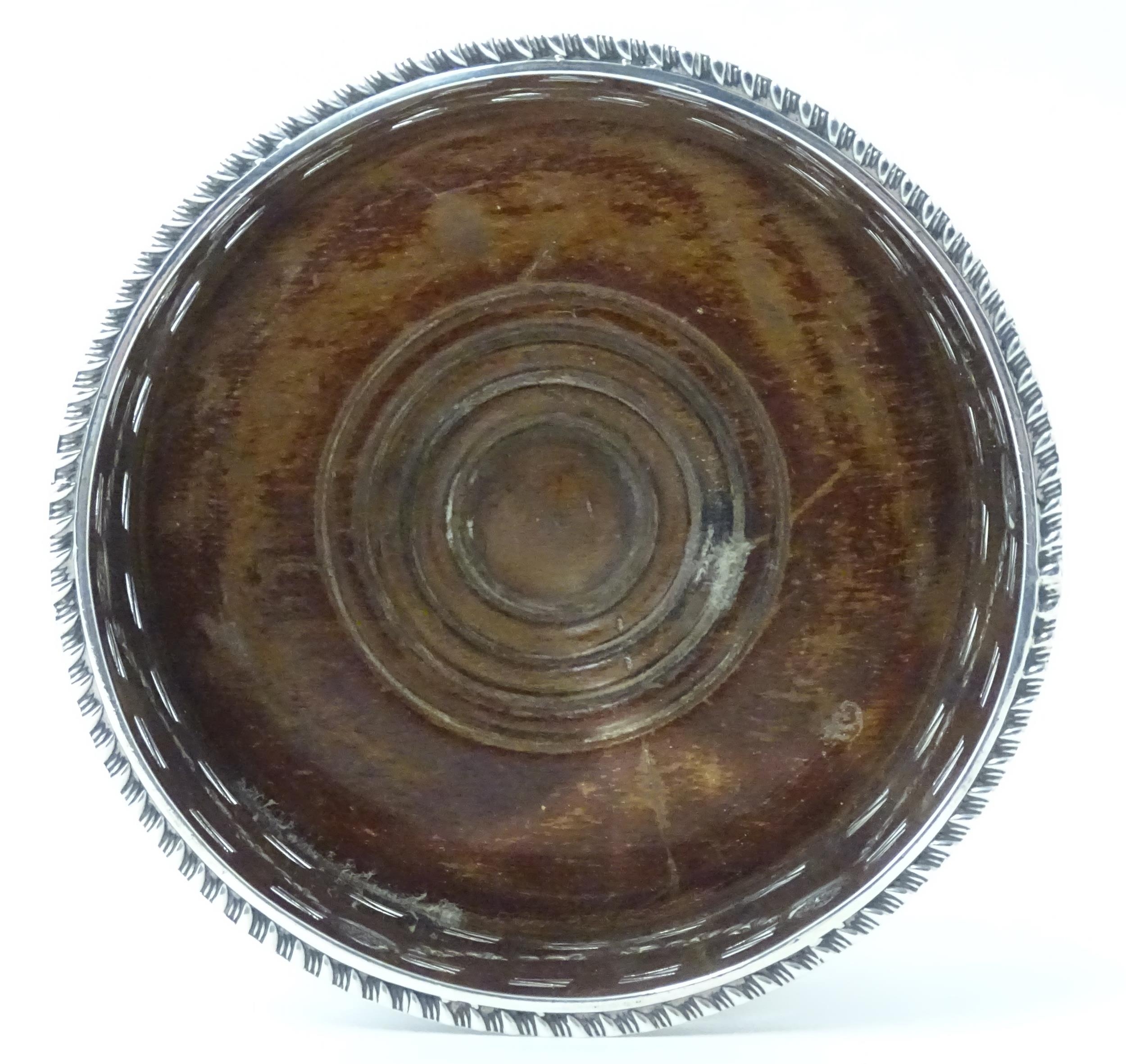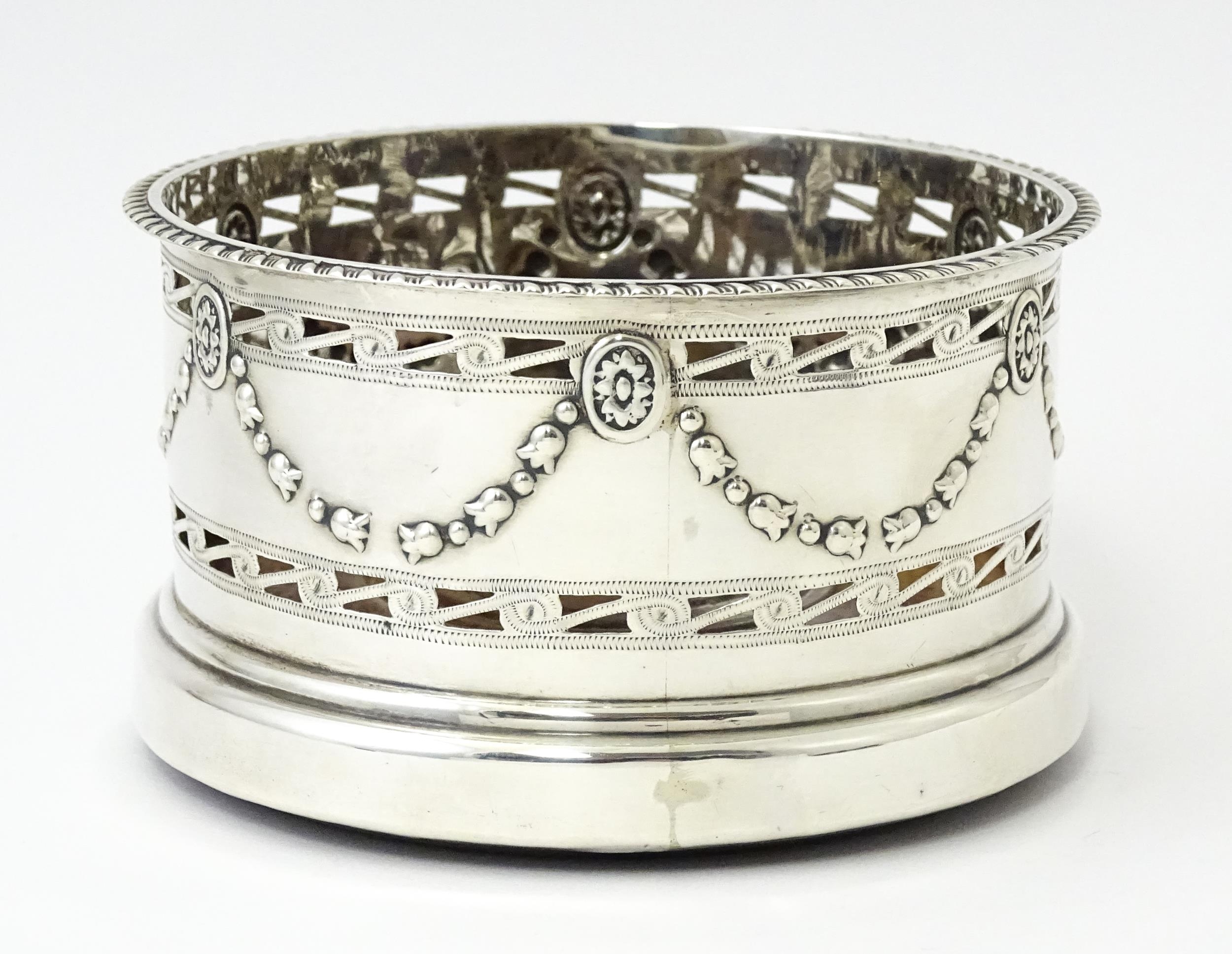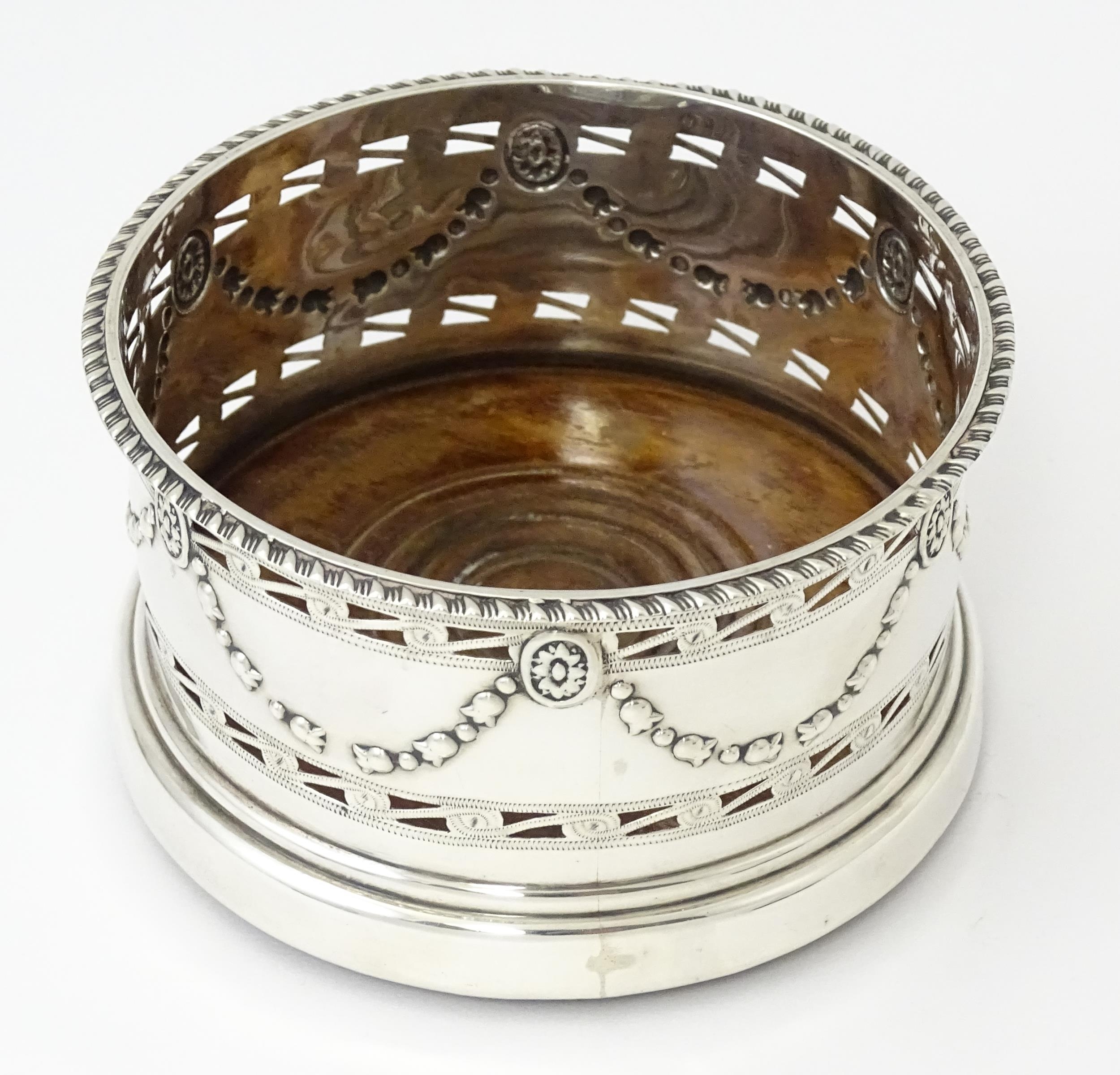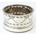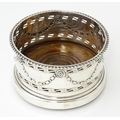 A silver wine coaster with turned wooden base and swag detail, hallmarked Chester 1905, maker George Nathan & Ridley Hayes. Approx. 4 1/4" wide x 2 1/2" high