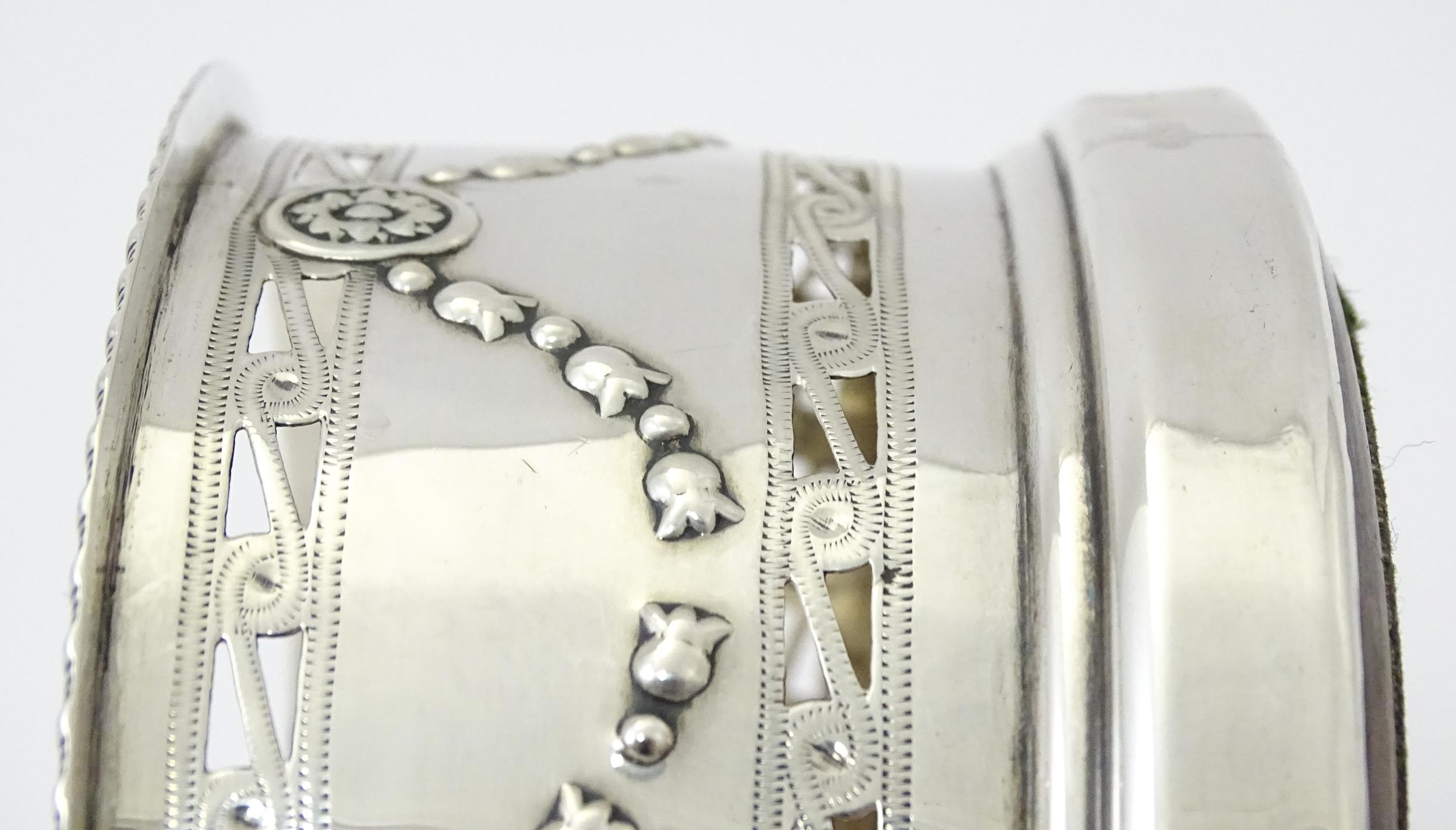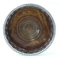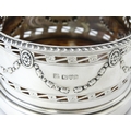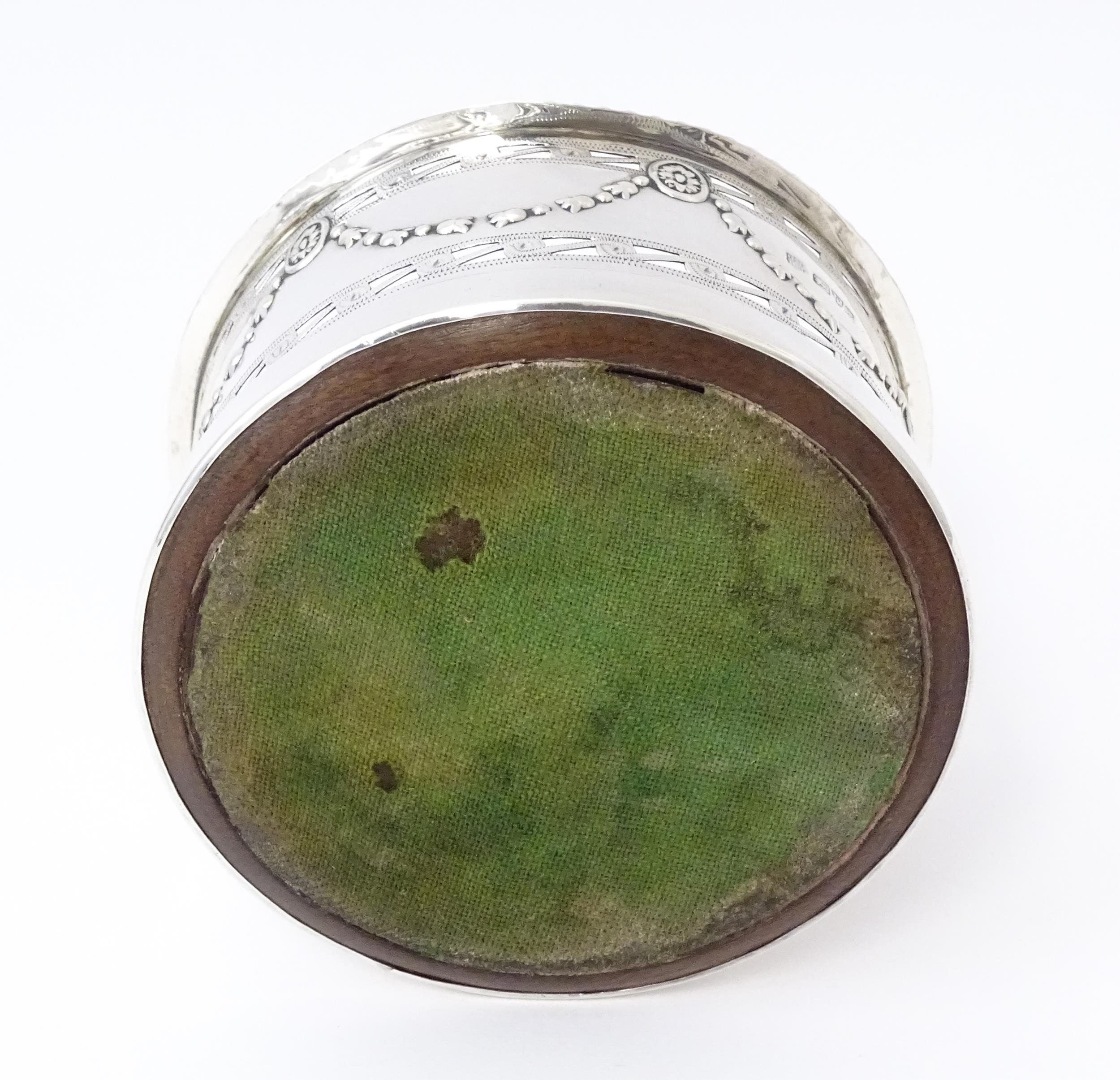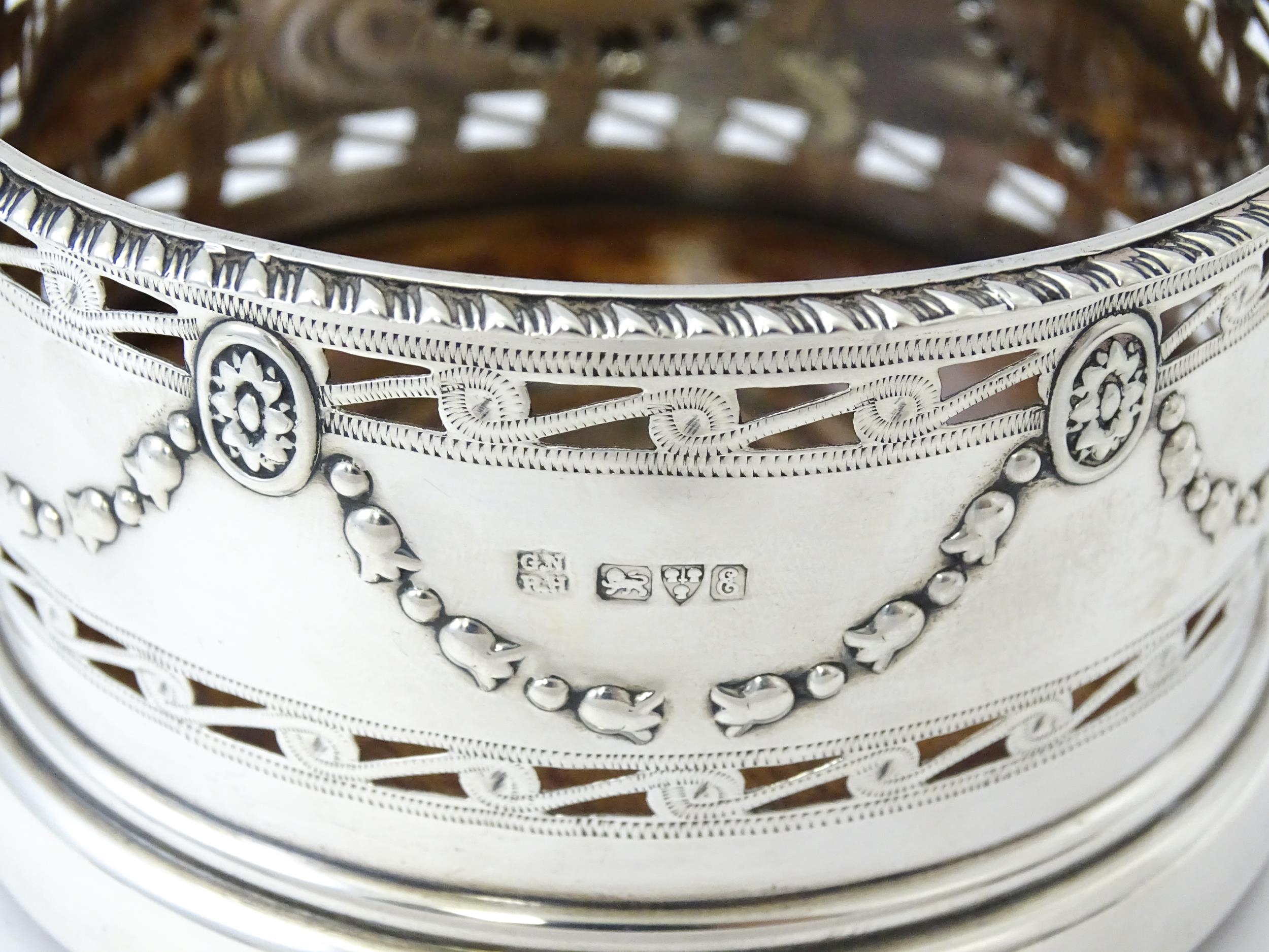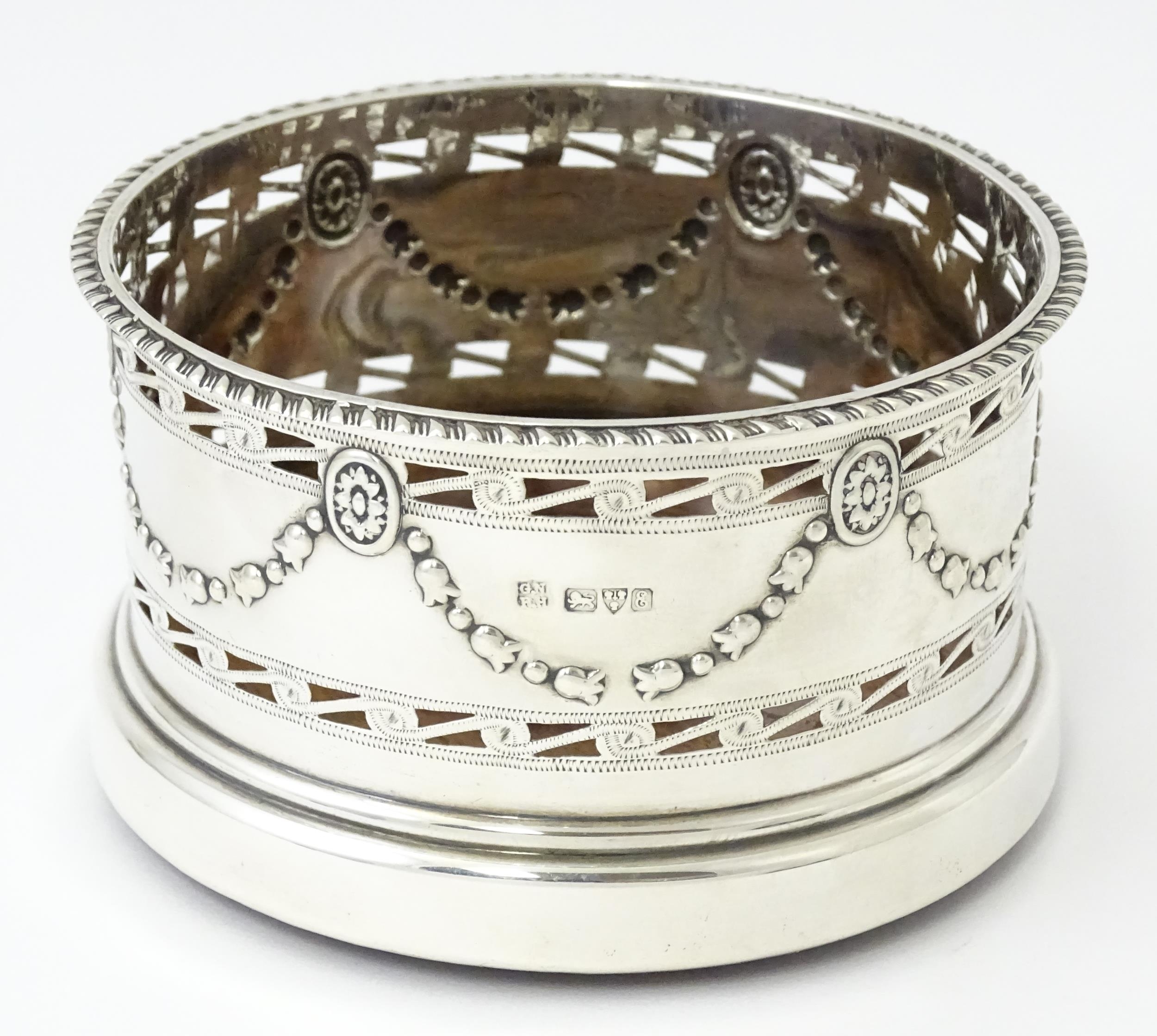 A silver wine coaster with turned wooden base and swag detail, hallmarked Chester 1905, maker George Nathan & Ridley Hayes. Approx. 4 1/4" wide x 2 1/2" high