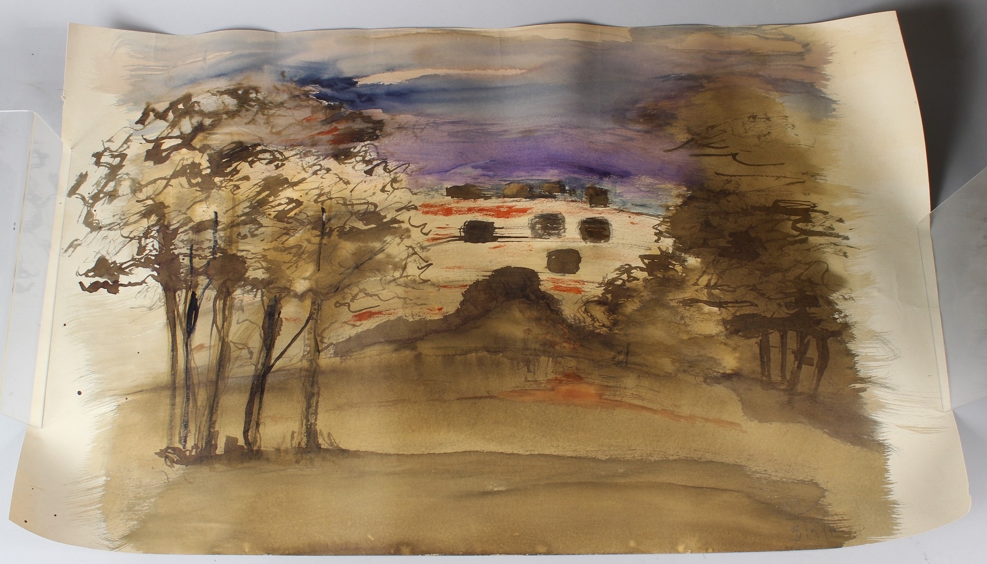 20TH CENTURY POSSIBLY MIDDLE EASTERN Trees and buildings watercolour signed and dated indistinctly unframed 55 x 92cm