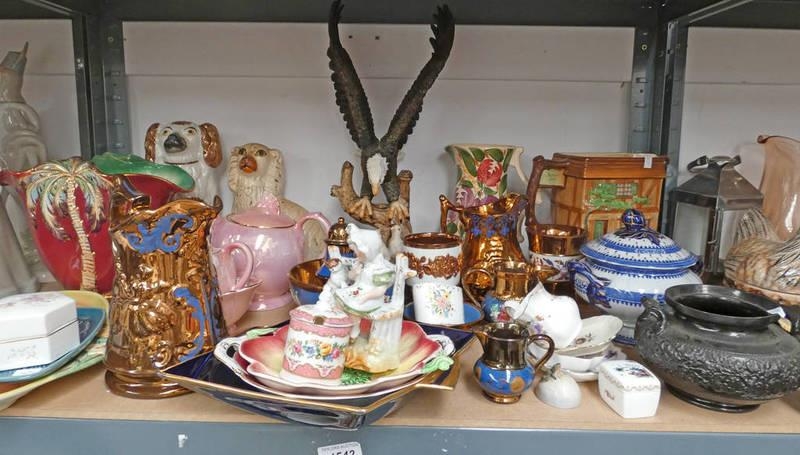 VARIOUS 19TH CENTURY LUSTRE WARE FALCON WARE JUG, ETC ON ONE SHELF