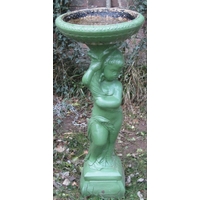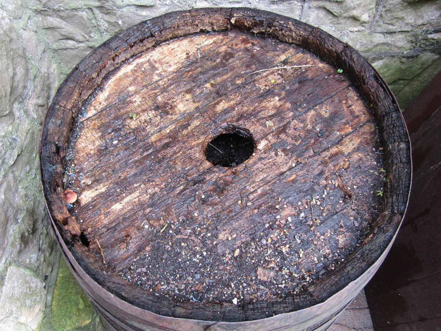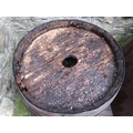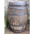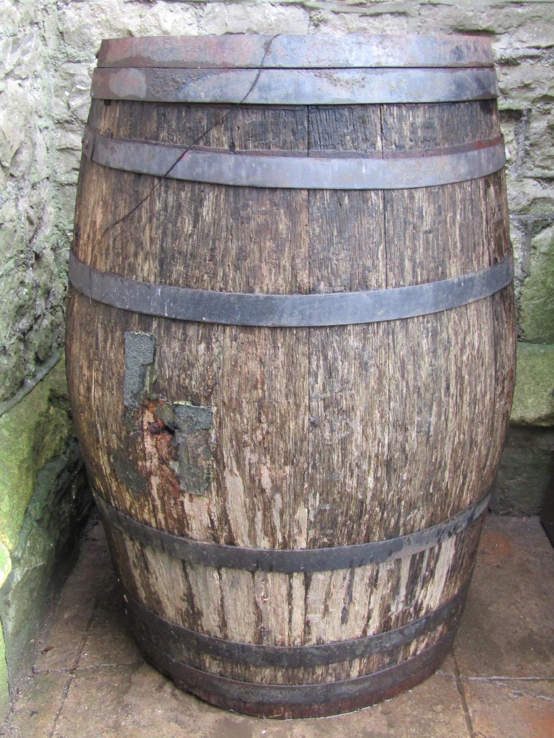 A weathered coopered oak and steel banded beer or cider barrel 98 cm high (af)