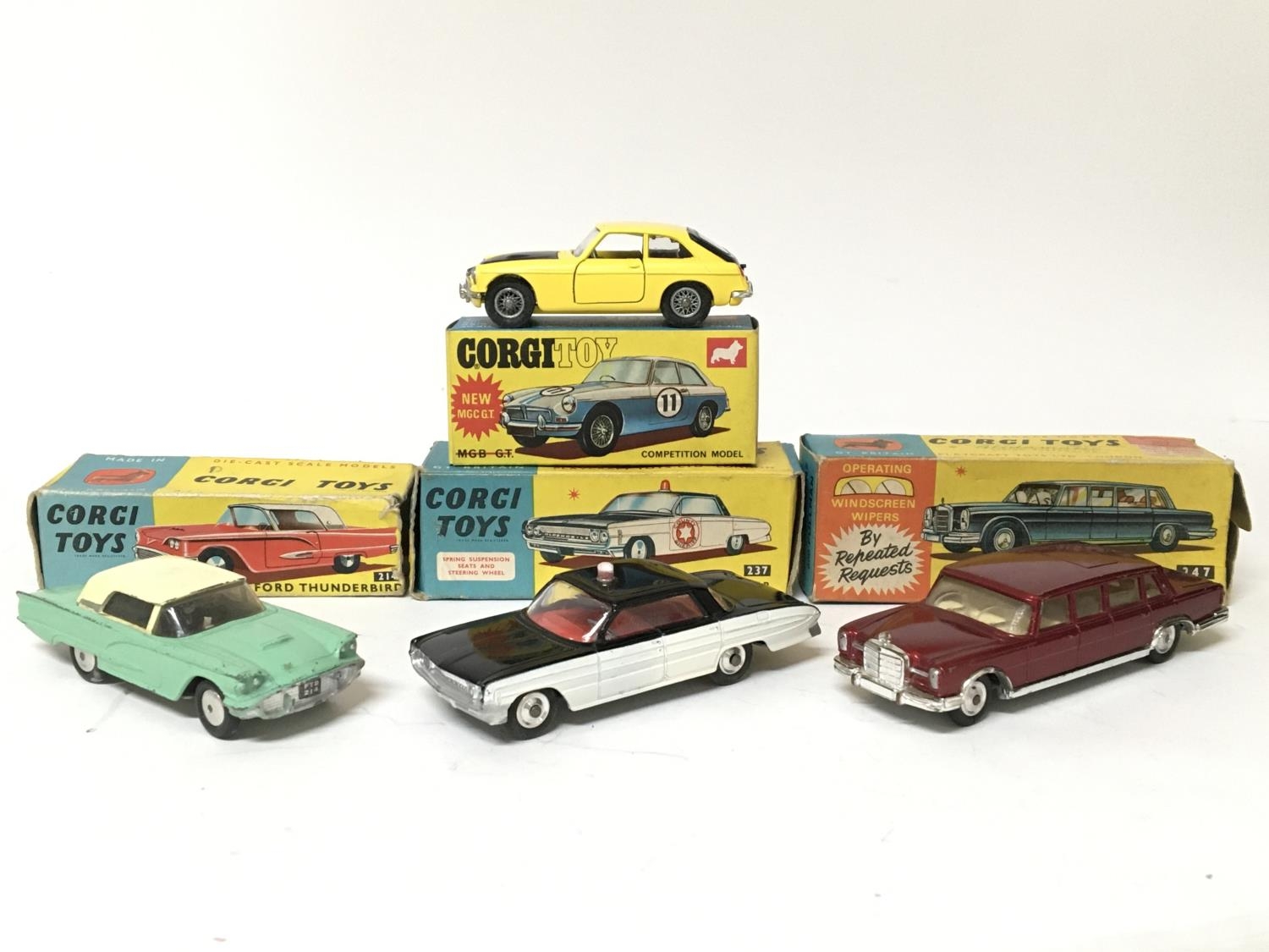 Corgi toys, #214 Ford Thunderbird, #247 Mercedes Benz 600 Pullman, #237 Oldsmobile Sheriff car and #345 MGC GT, boxed