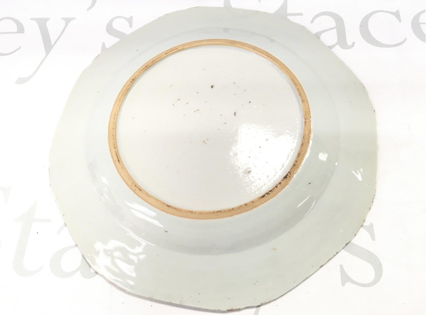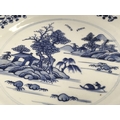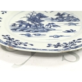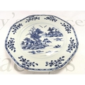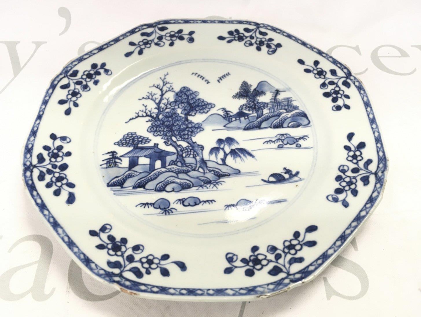 An 18th century Chinese octagonal blue and white plate decorated with a river scene , 23cm wide. Chips seen on plate. This lot cannot be posted