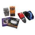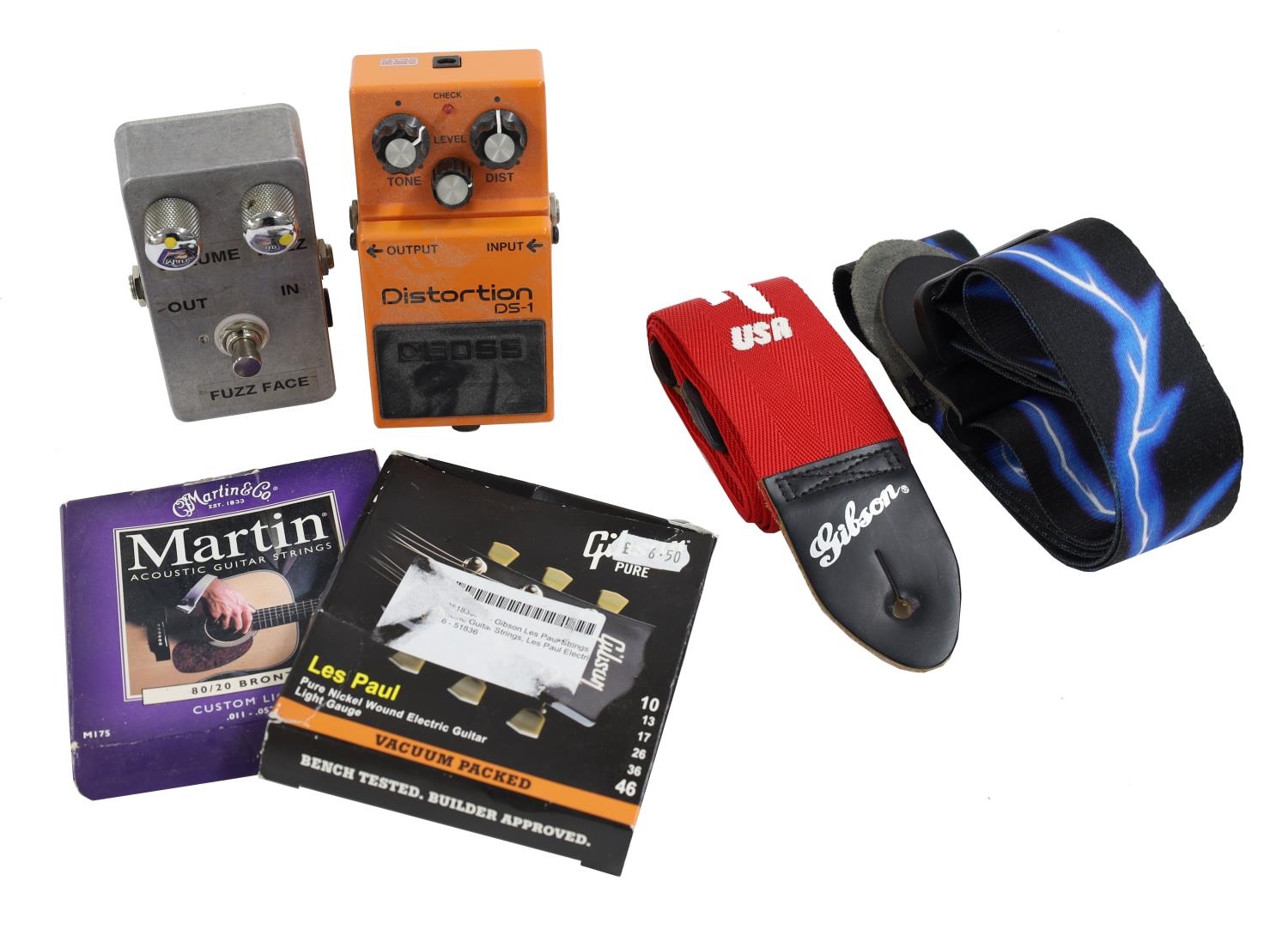 Boss DS-1 Distortion guitar pedal, with a homemade Fuzz Face guitar pedal and two guitar straps