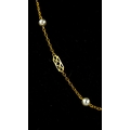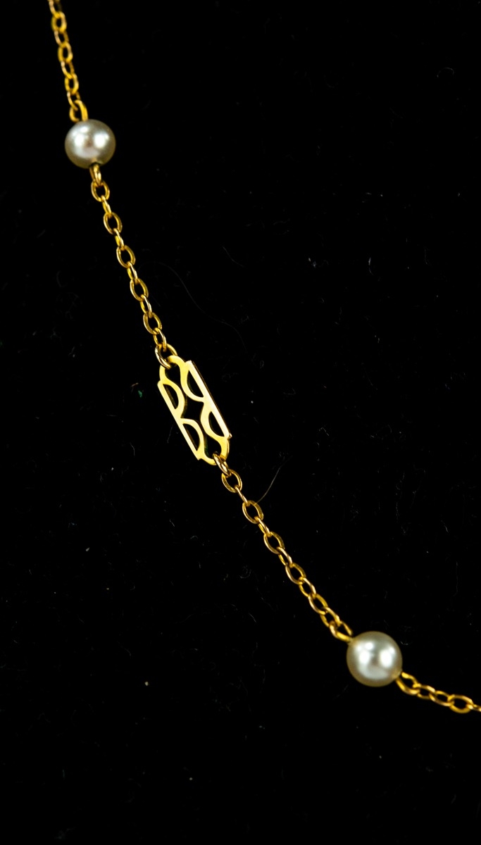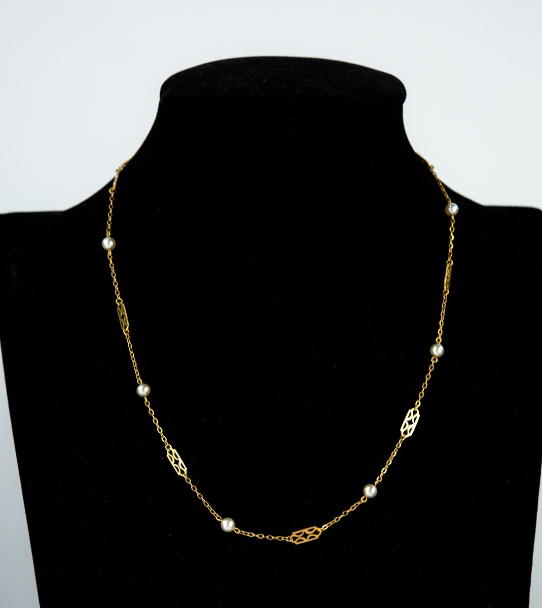 9ct GOLD FANCY LINK CHAIN NECKLACE set with imitation pearls, ring clasp, 3.2gms