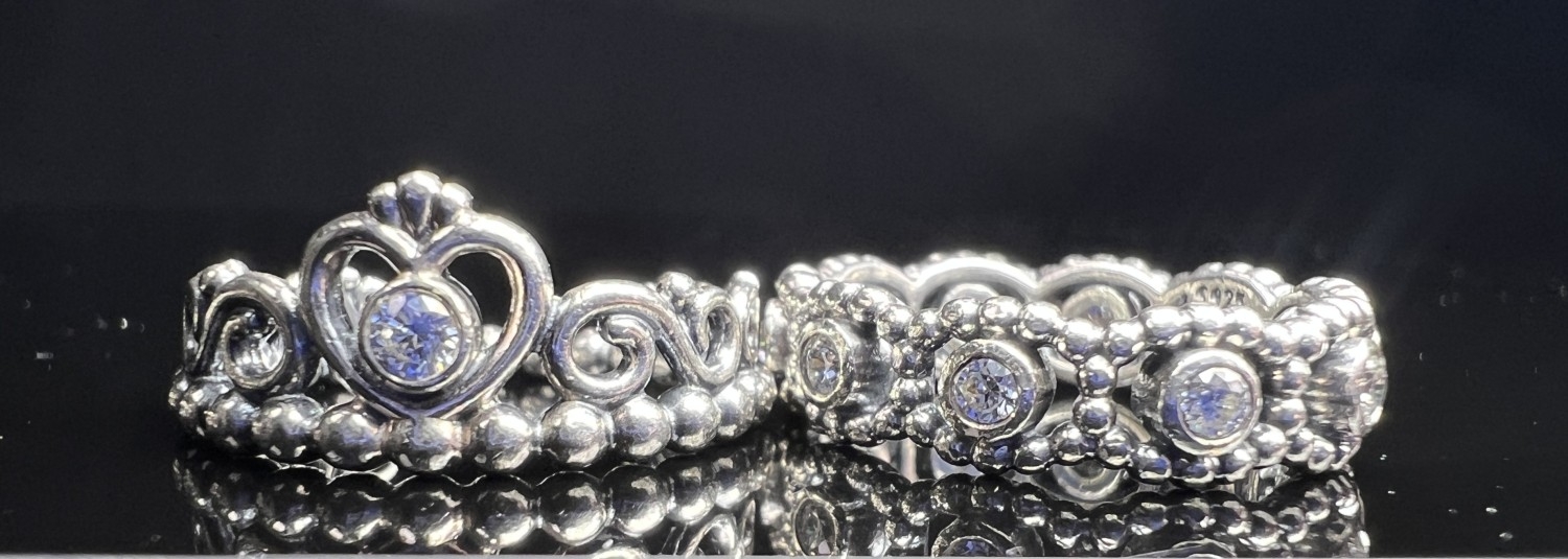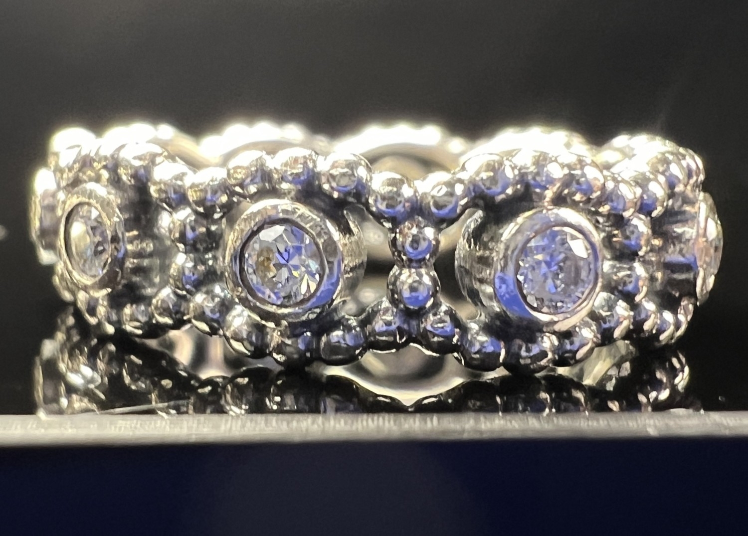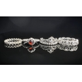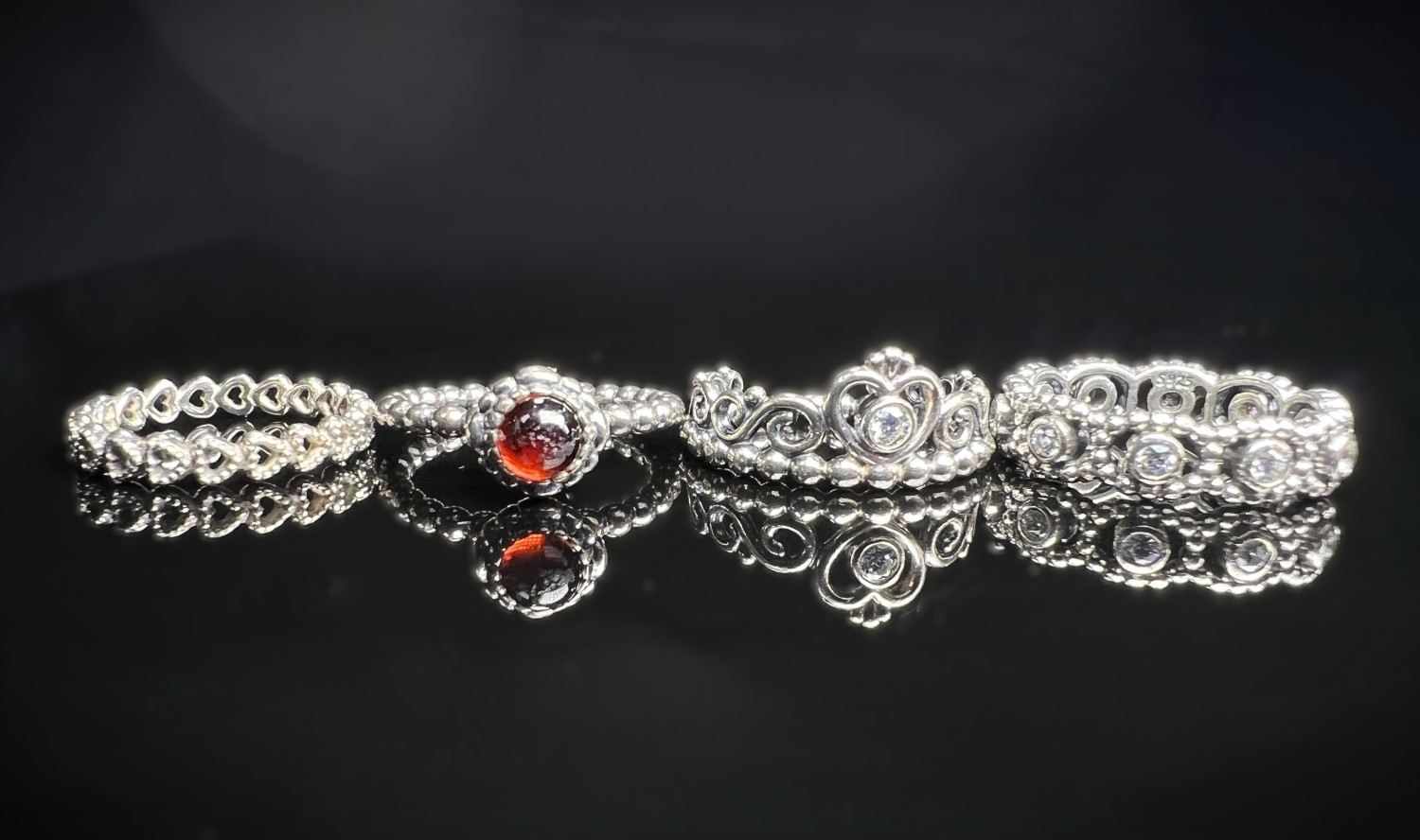 Four silver Pandora rings, 3 with clear stones, sizes J & K, 11.7 gms.