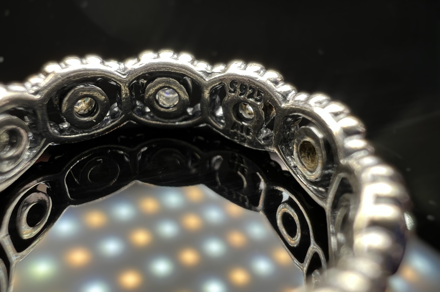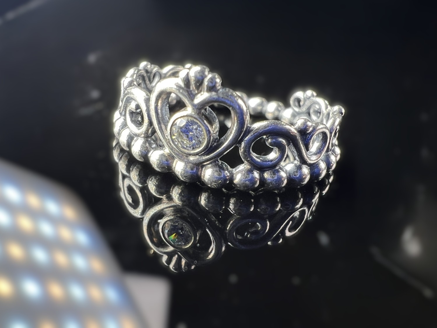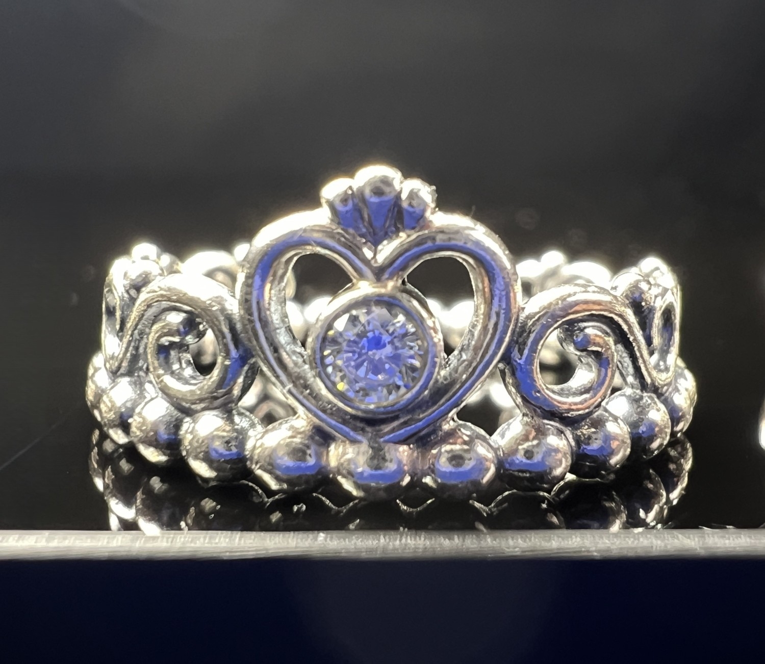 Four silver Pandora rings, 3 with clear stones, sizes J & K, 11.7 gms.