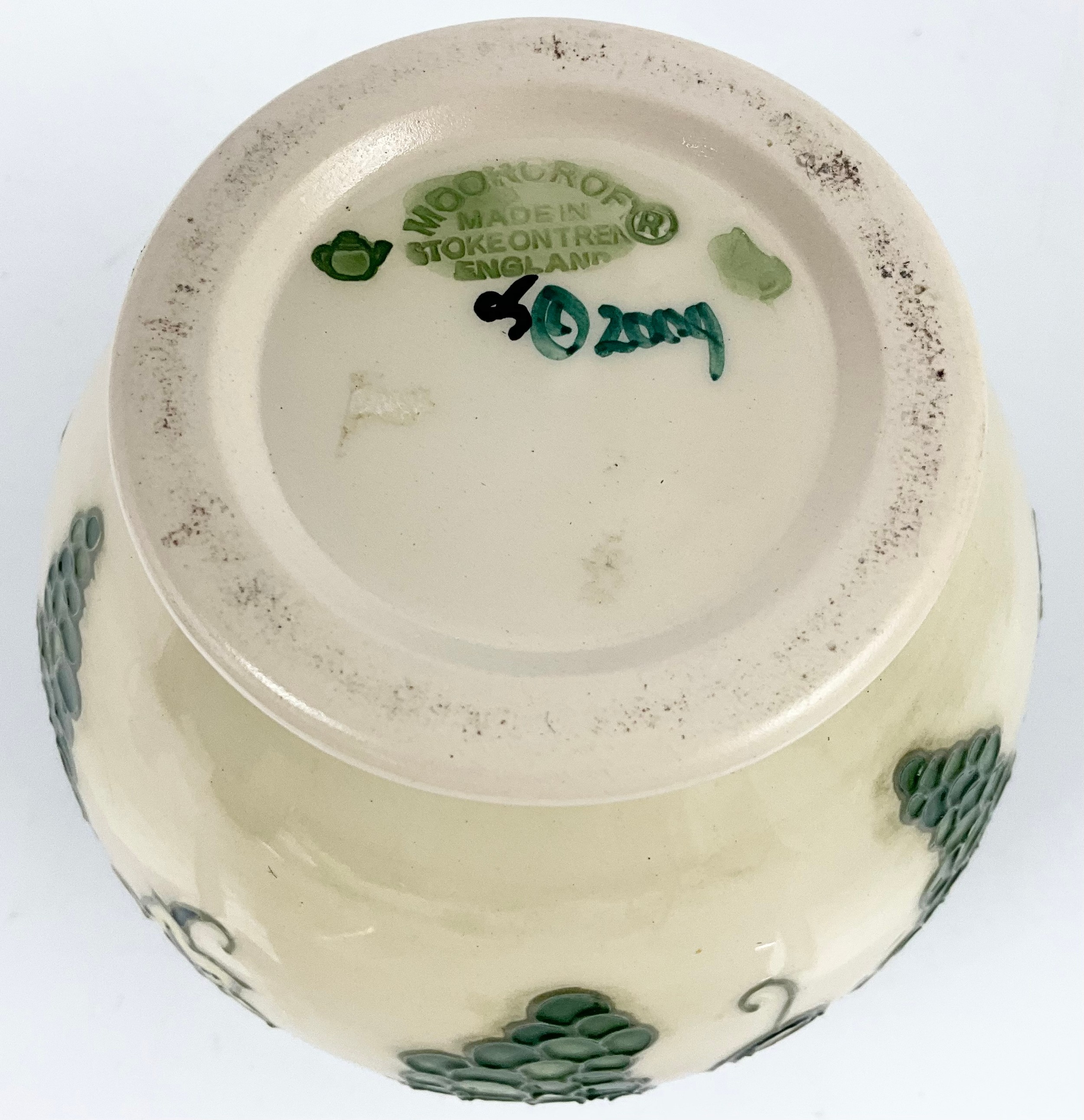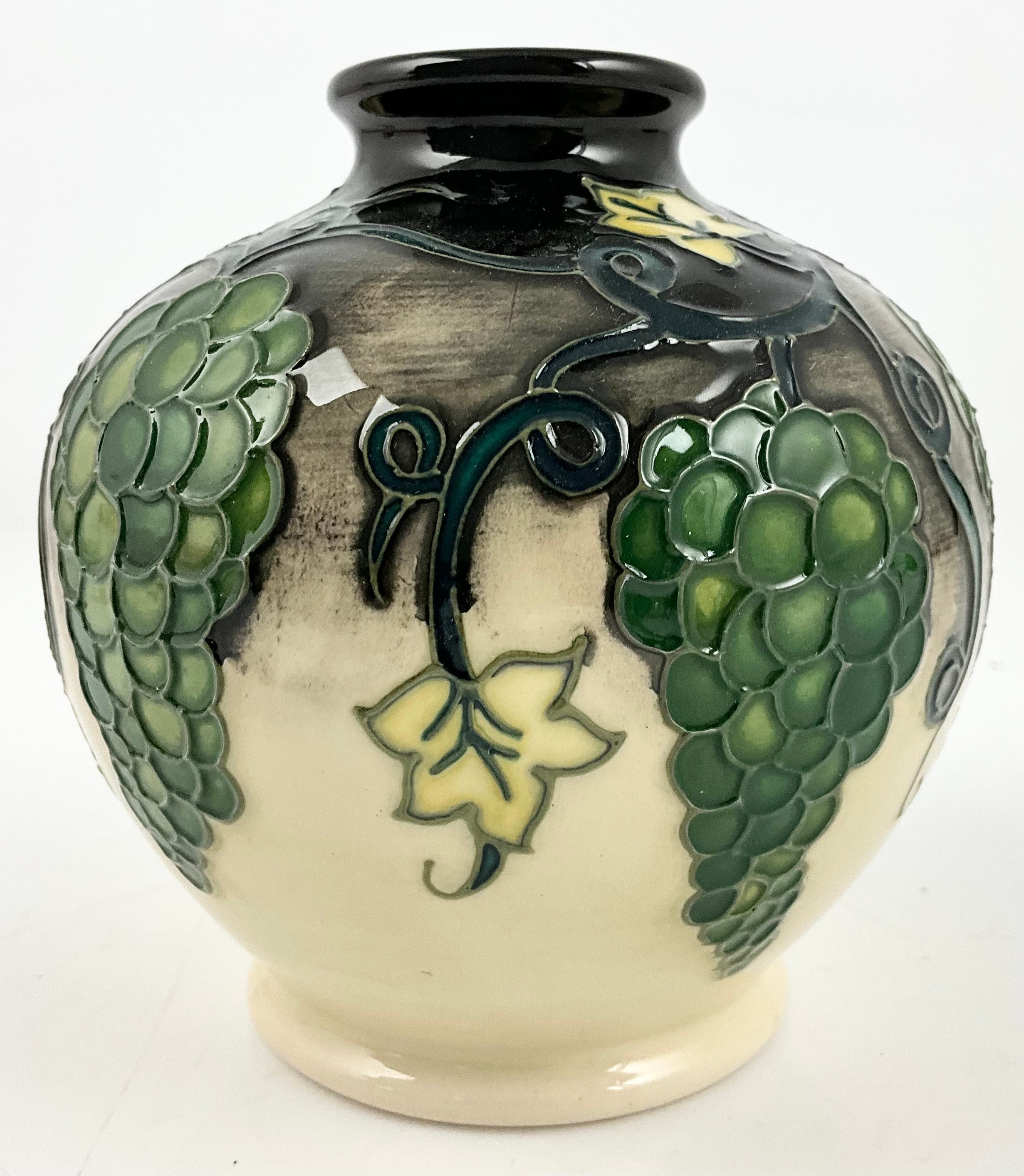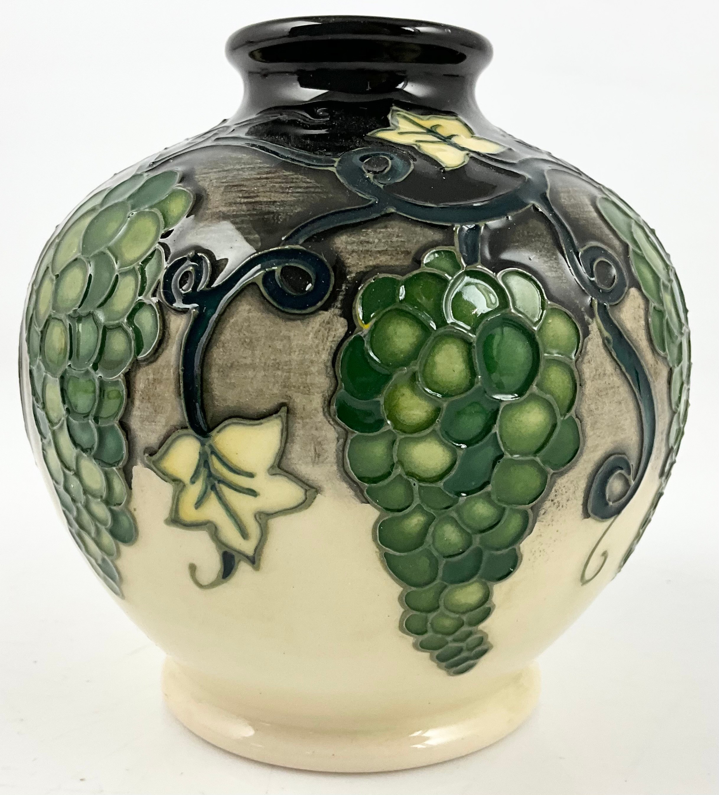 MOORCROFT POTTERY GLOBULAR VASE DECORATED IN THE QUISSAC VINEYARD PATTERN WITH IMPRESSED BACKSTAMP 11cm