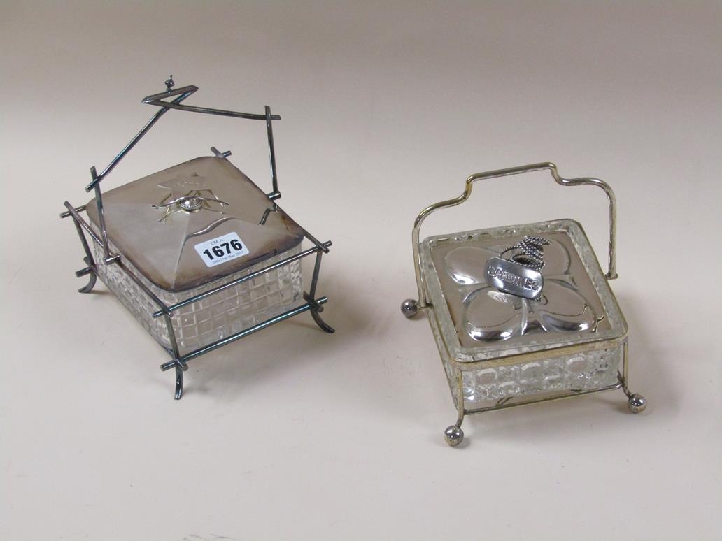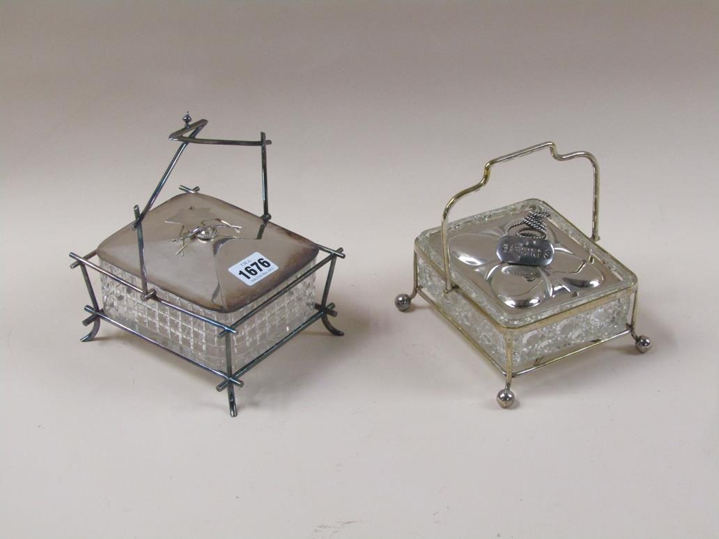 TWO CUT GLASS SARDINE DISHES ON STAND WITH SILVER PLATED MOUNTS AND LIFT OFF COVERS