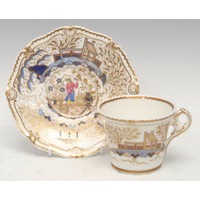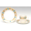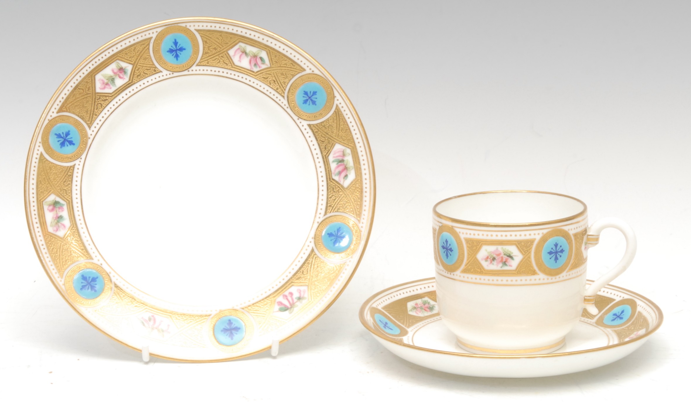 A Minton coffee cup, saucer and side plate, gilt acid borders with alternating floral reserves and turquoise roundels, the saucer 16.5cm diameter, impressed mark, late 19th century