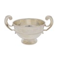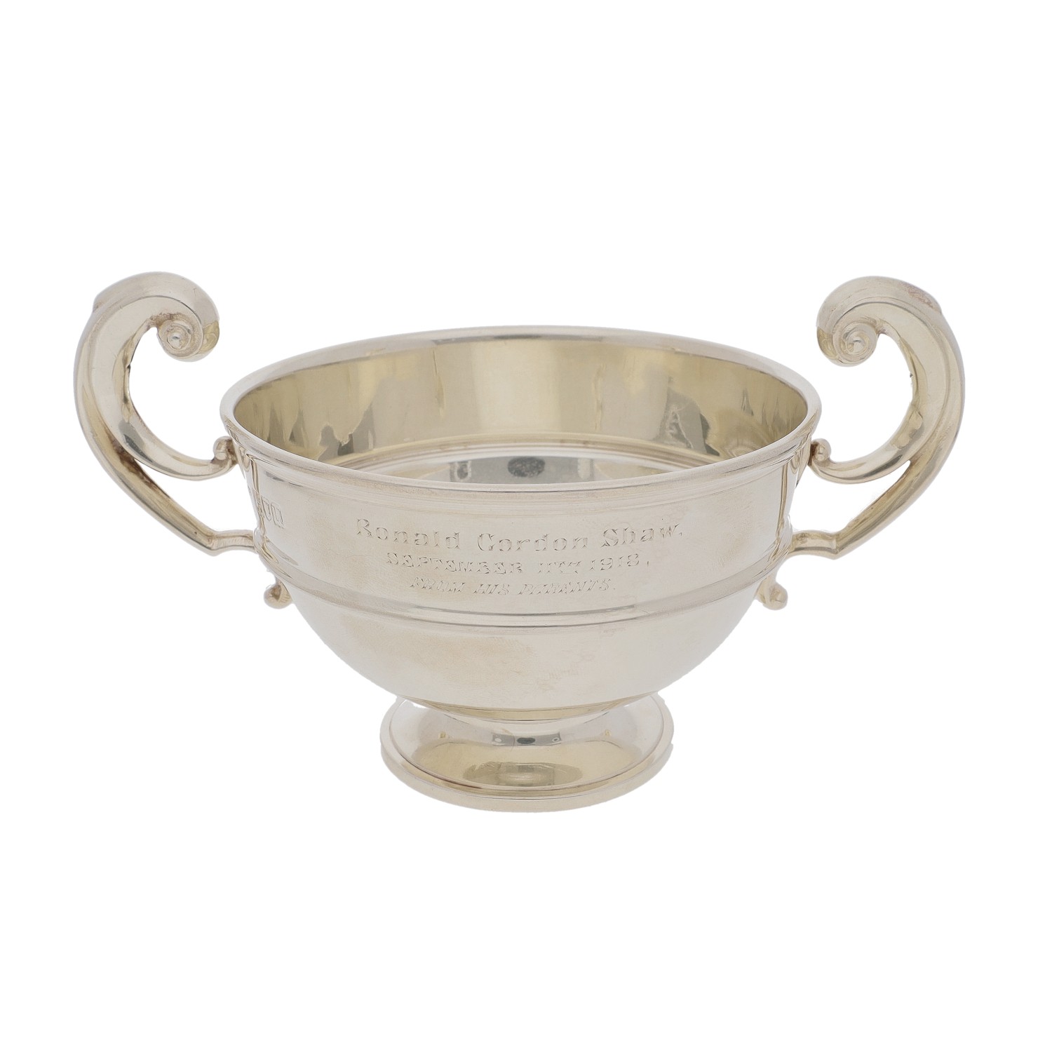 George V silver low trophy cup, of squat circular form with scroll handles, presentation inscription dated 1918, maker's mark rubbed, London 1915, 6" wide, 181gm