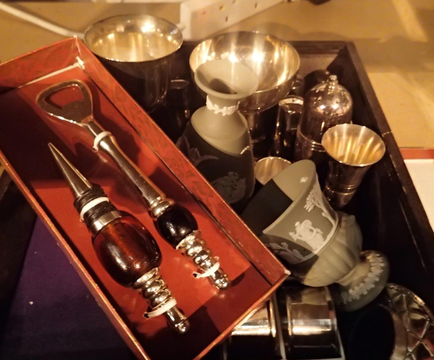 Box of mixed ceramics and silver plate to include Wedgwood. Not available for in-house P&P, contact Paul O'Hea at Mailboxes on 01925 659133