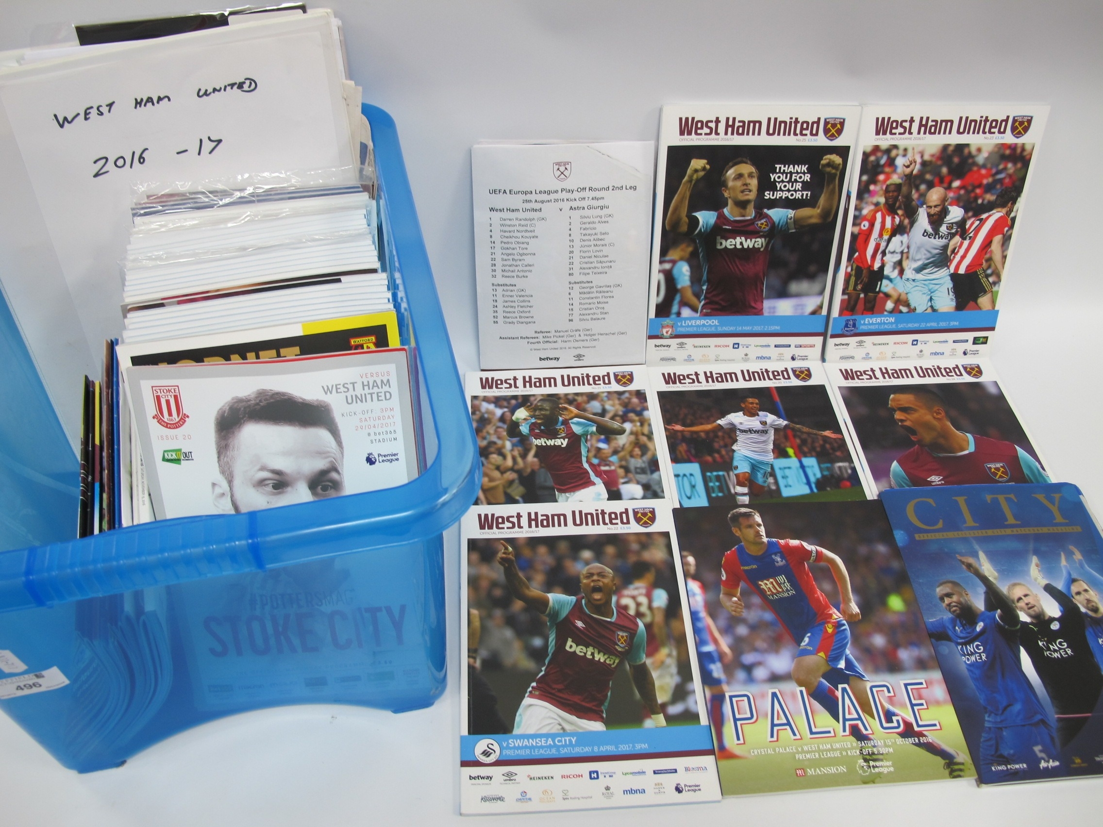 West Ham United 2016-17 Programmes, homes (x 34) aways (x 14), six reserves, team sheets, fanzines, binder, etc:- One Box.