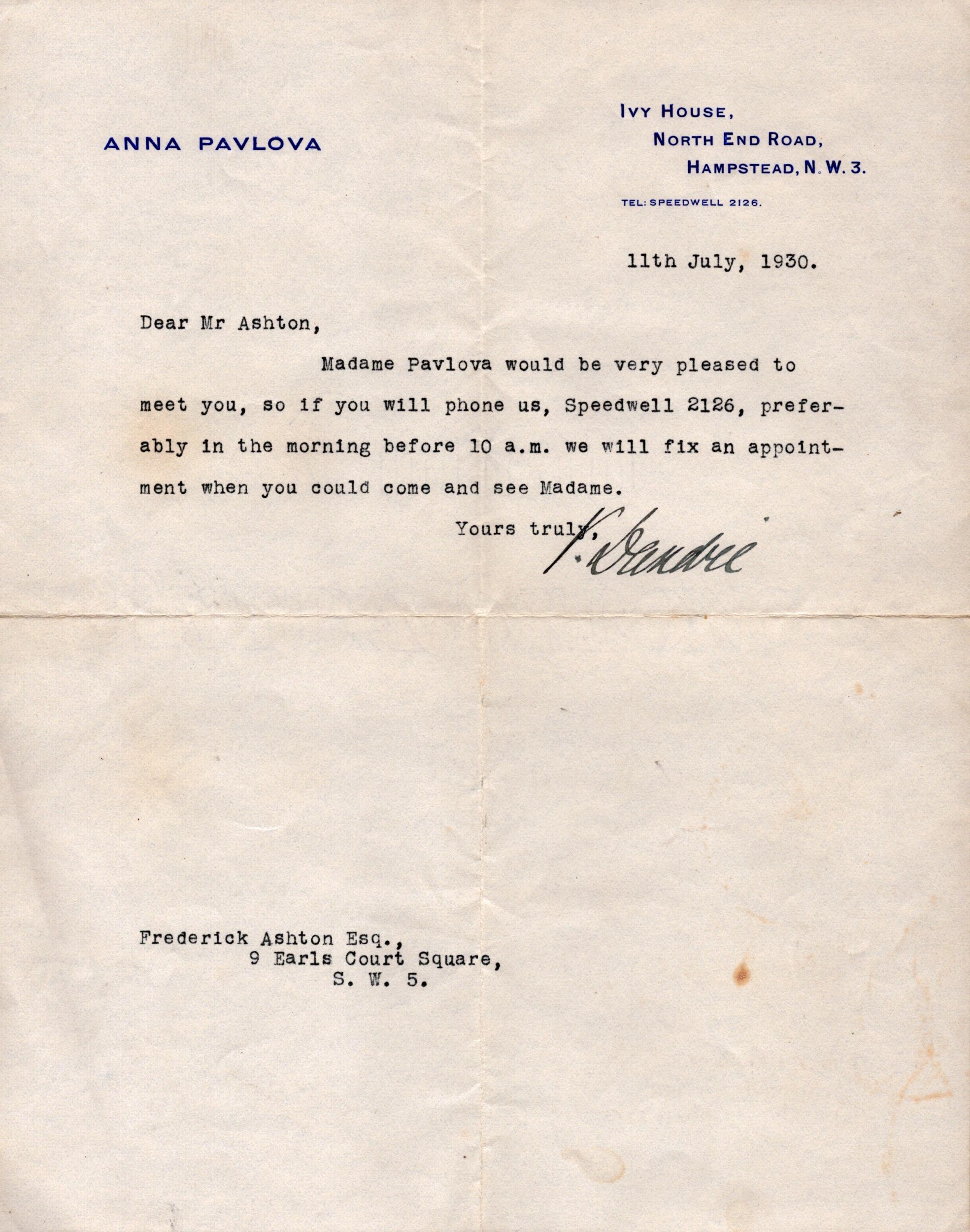 Anna Pavlova typed letter, re Pavlova desiring to meet Frederick Ashton. Signed by her husband Victor Dandre dated 11 Jul 1930.