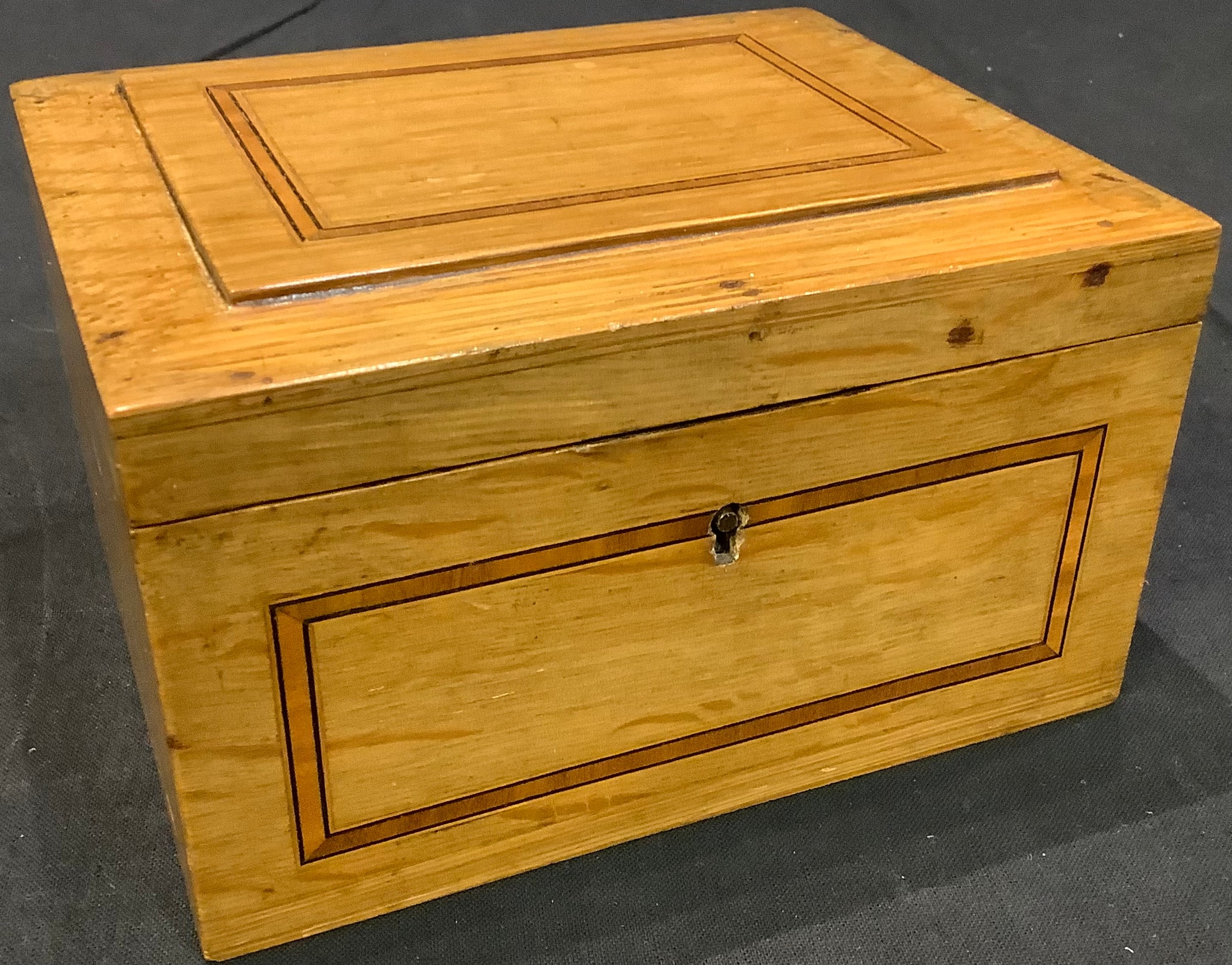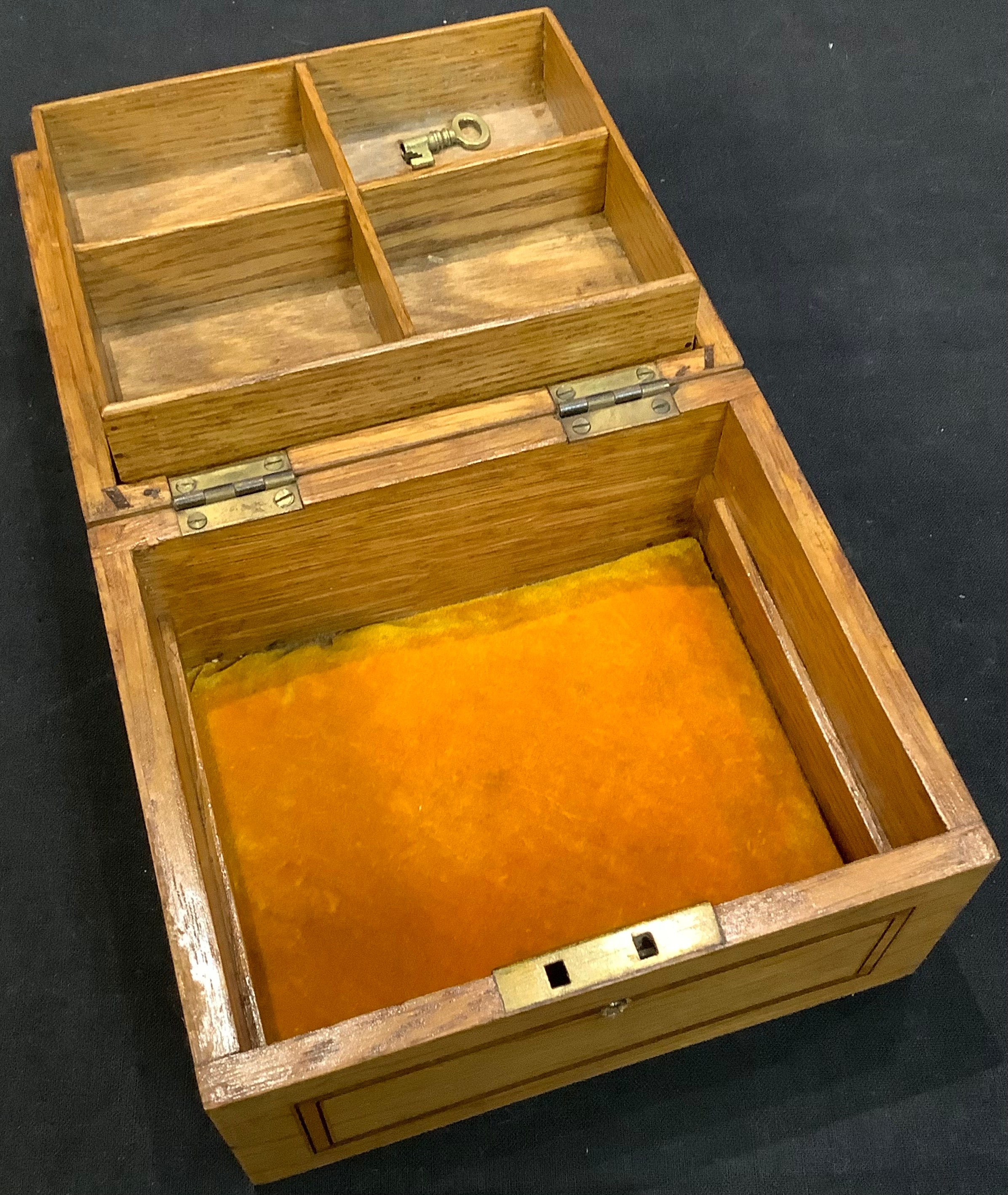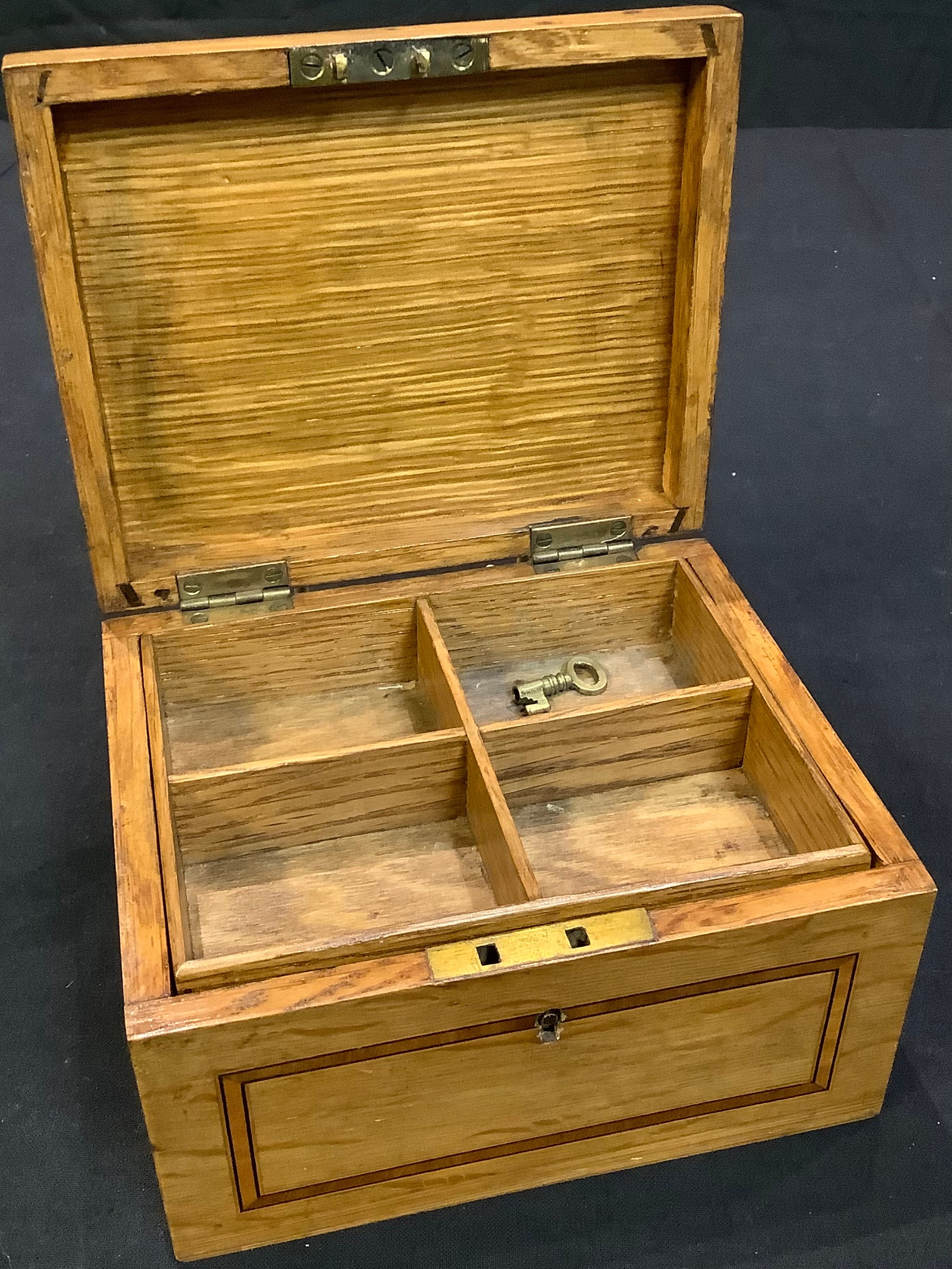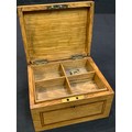 An early 20th century satinwood banded oak jewellery or collectors box, hinged cover enclosing a fitted tray, 15.5cm wide