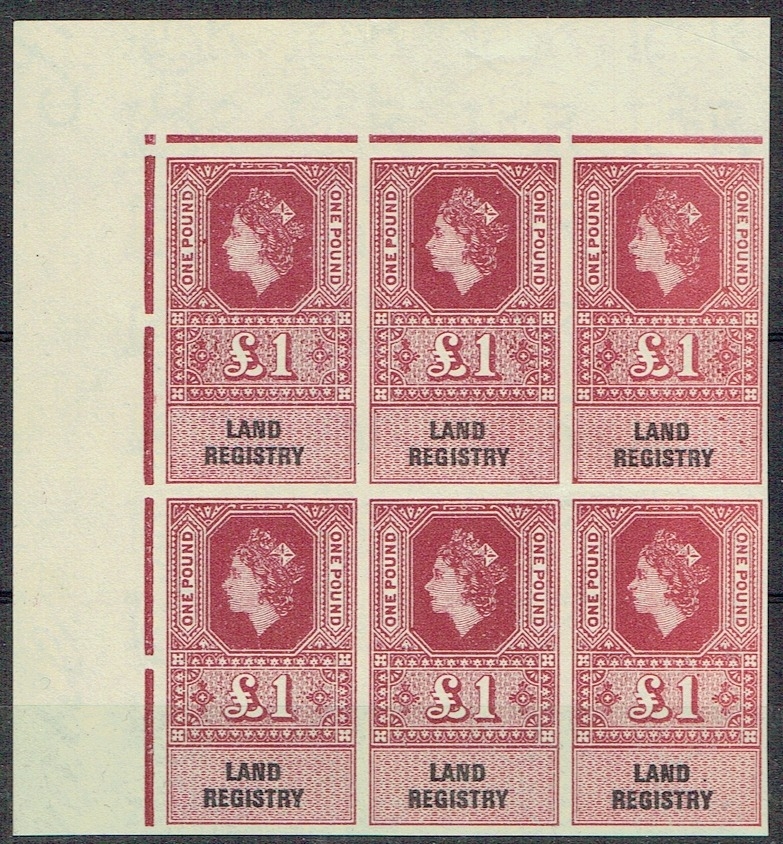 REVENUES & CINDERELLA - Great Britain: 1971 QEII Land Registry top left corner marginal imperf £1 claret and black proof block of six unmounted mint, very fine.
