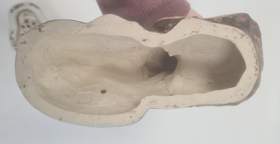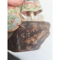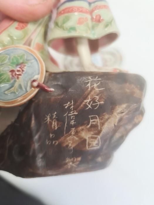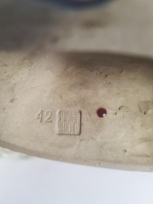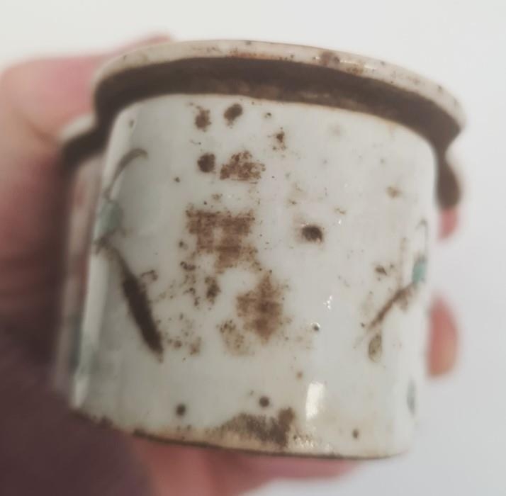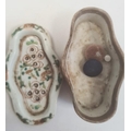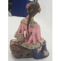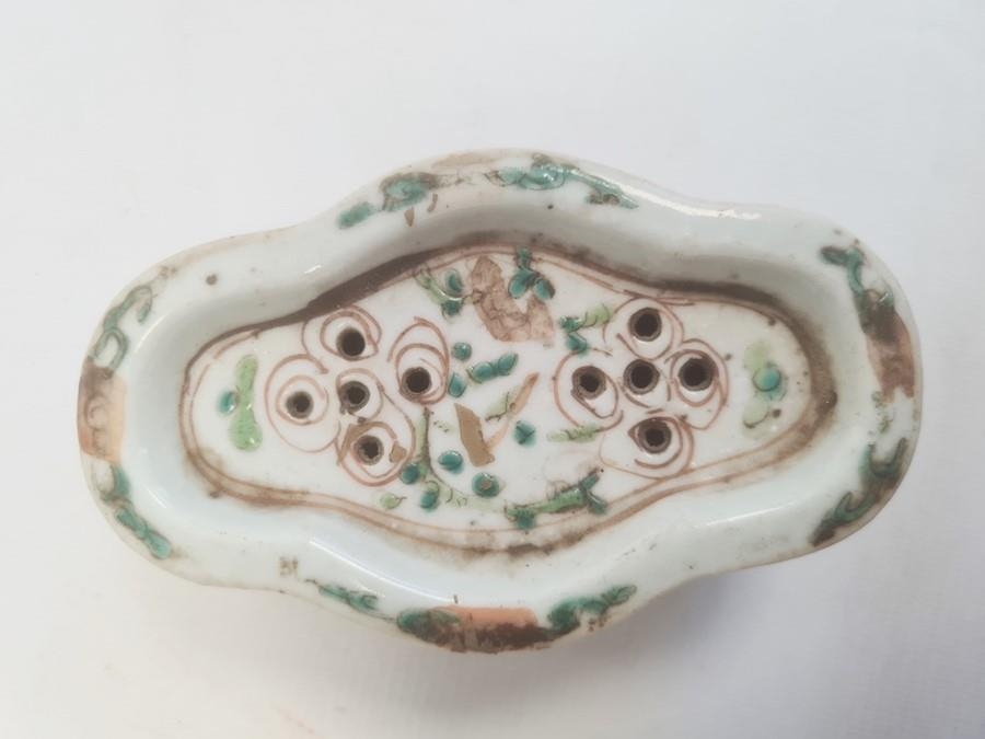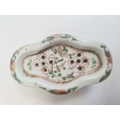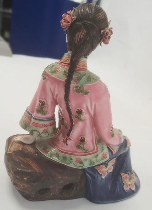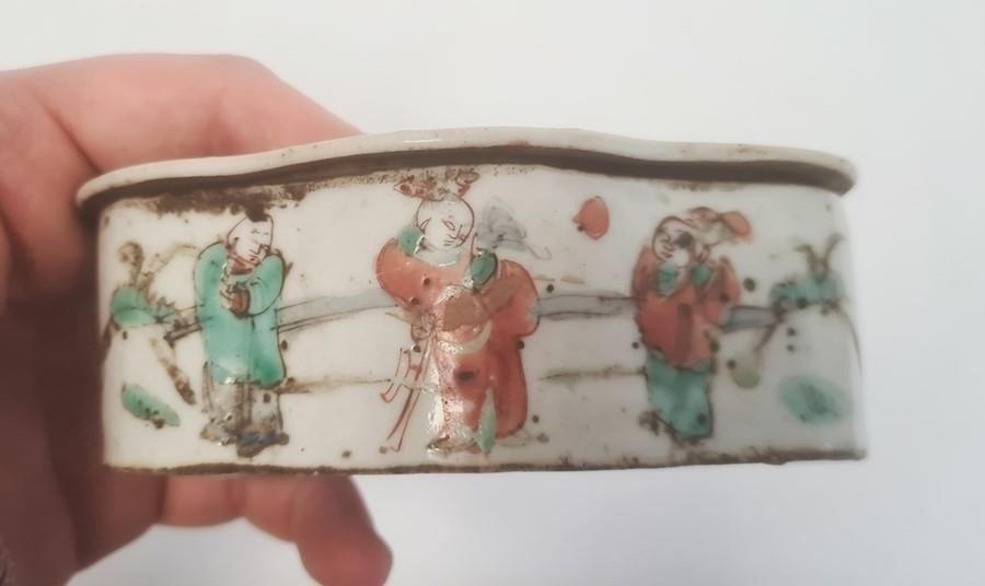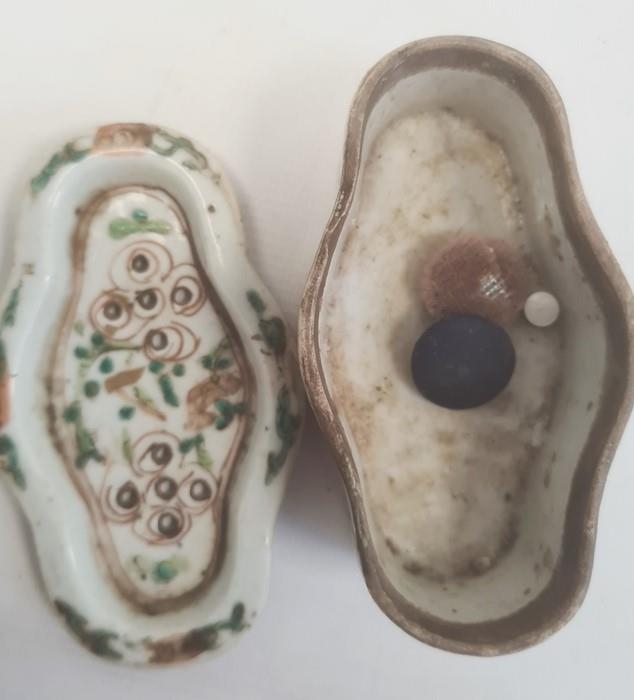 Chinese porcelain trinket box and pierced cover of elongated quatrefoil form, 12cm and a seated female figure, partly glazed, reclining on a rock, 23cm high (2)