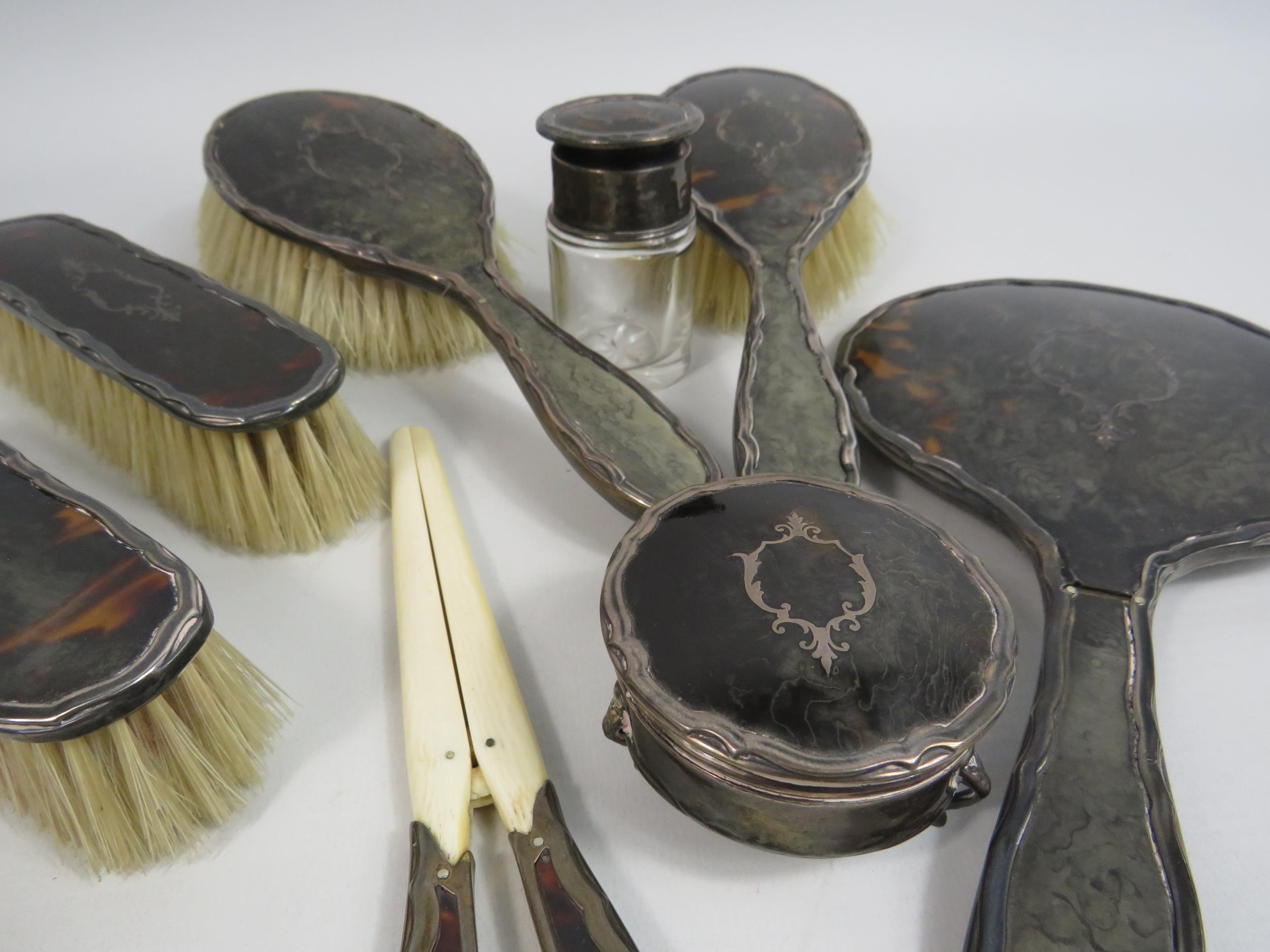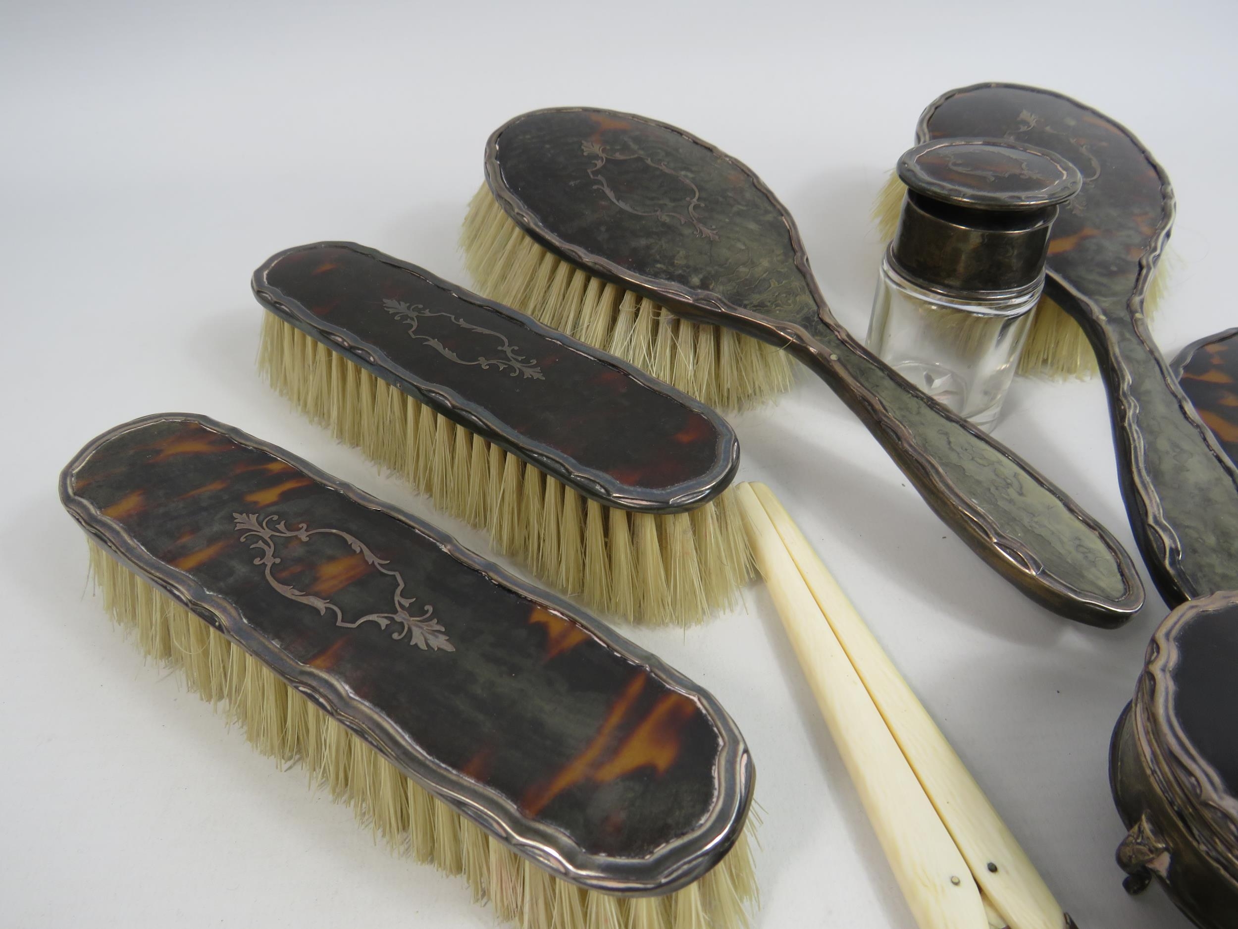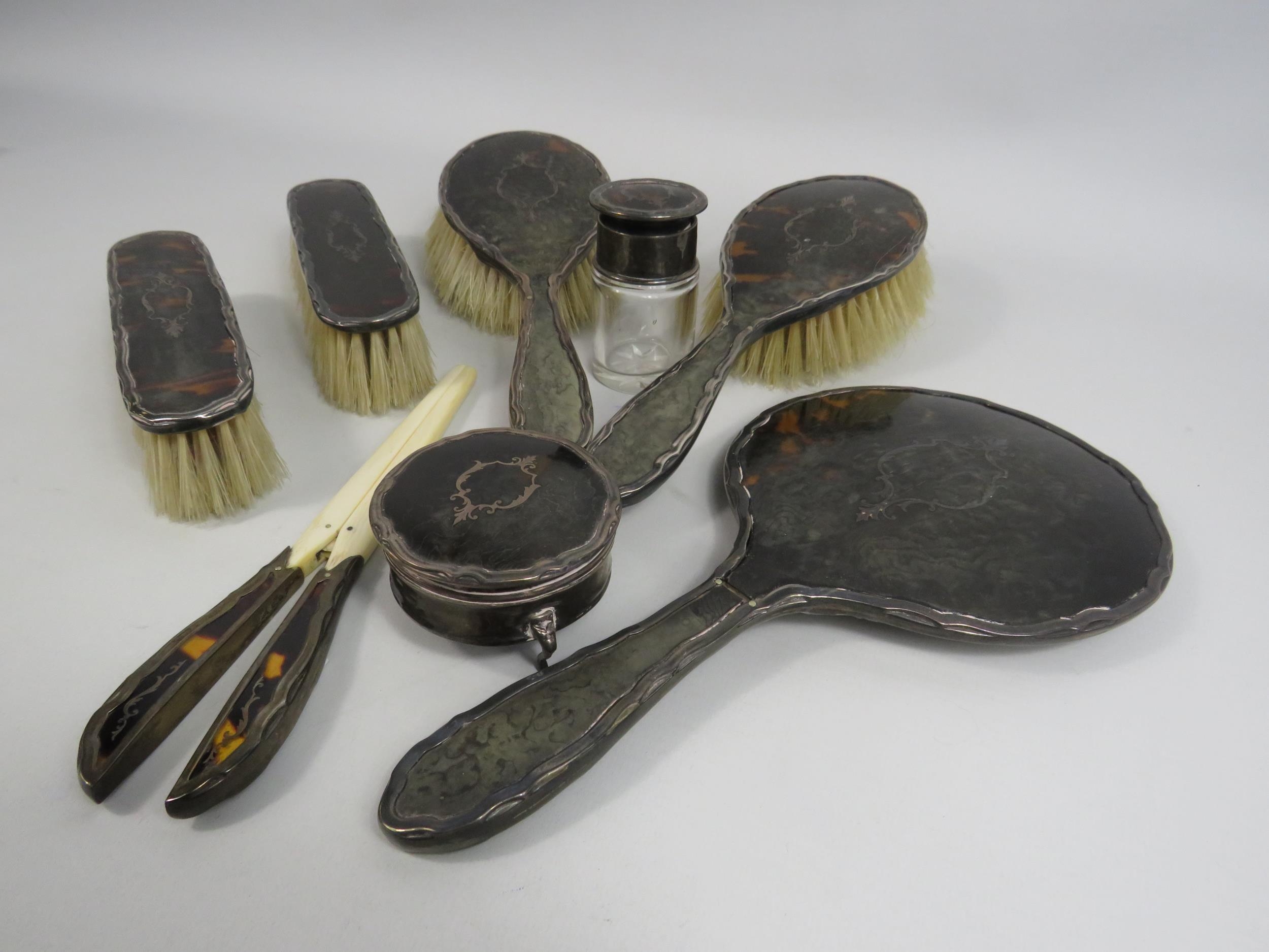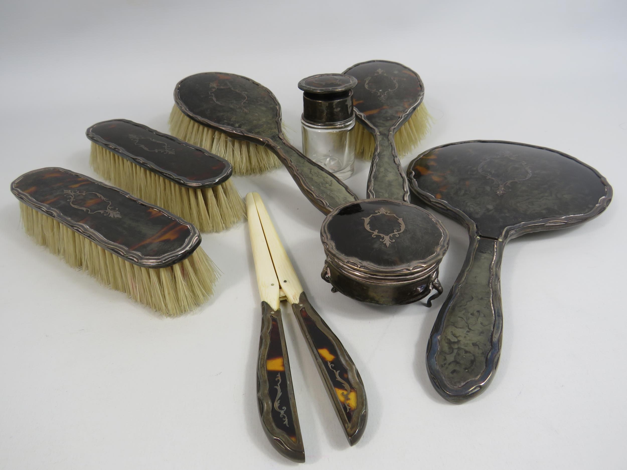 Walker and Hall Sheffield sterling silver and tortoiseshell vanity dressing table set.