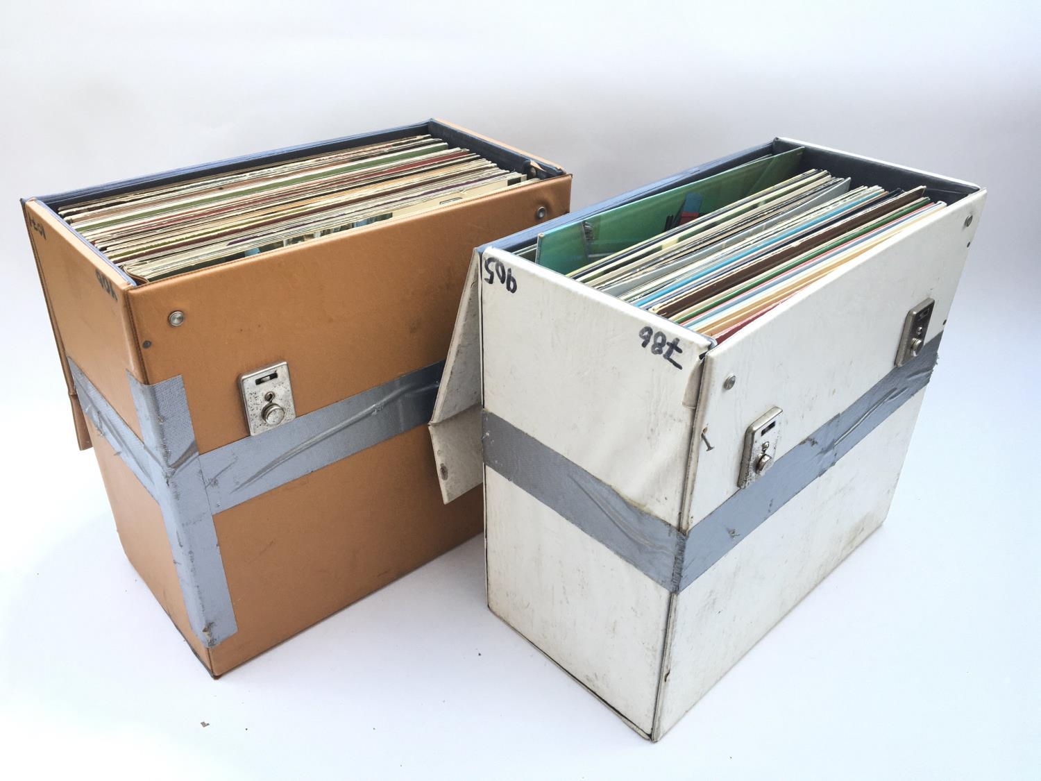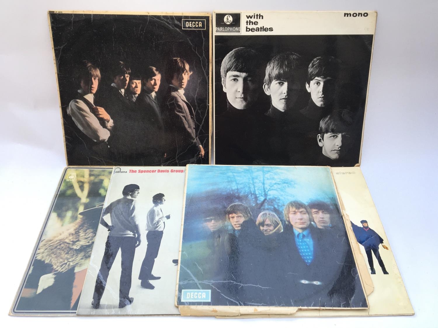 Two record boxes of various rock and pop LPs to include examples by The Beatles, The Rolling Stones, The Spencer Davis Group and Bob Dylan.