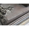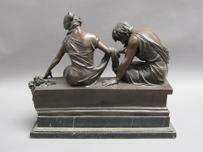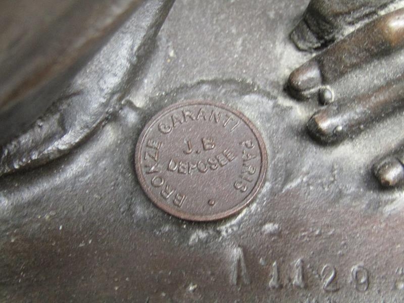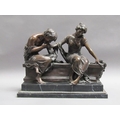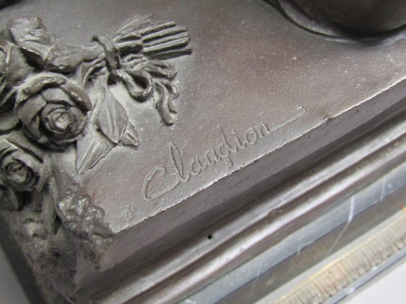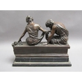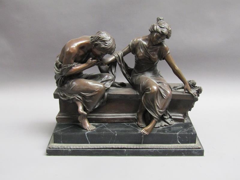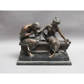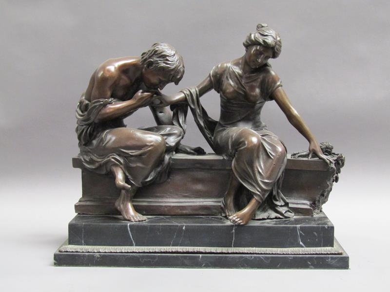 A 19c French bronze figure group inscribed 'After the original Claudion' with French seal of bronze 'Garanti of Paris, J.B Deposee' and impressed A1129, figure is two lovers seated on a wall, on veined marble base, 35cm h.