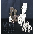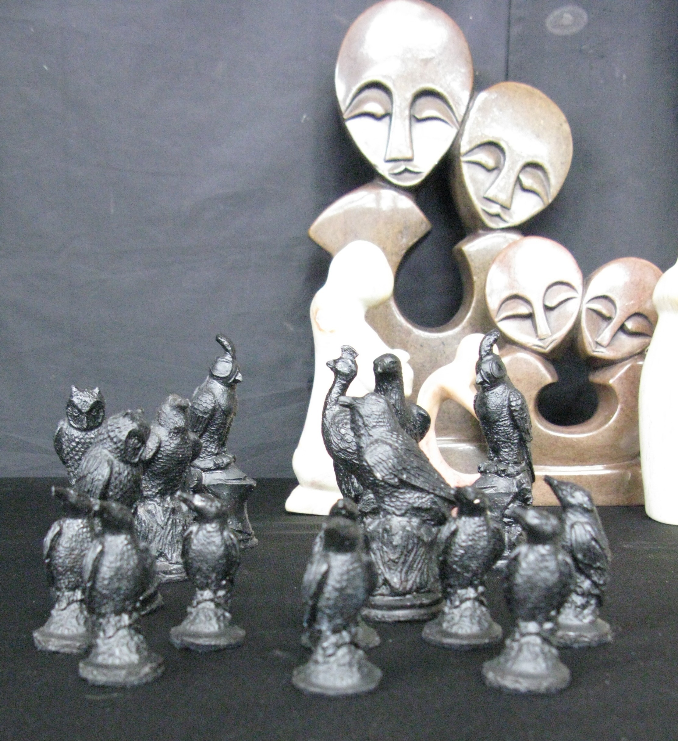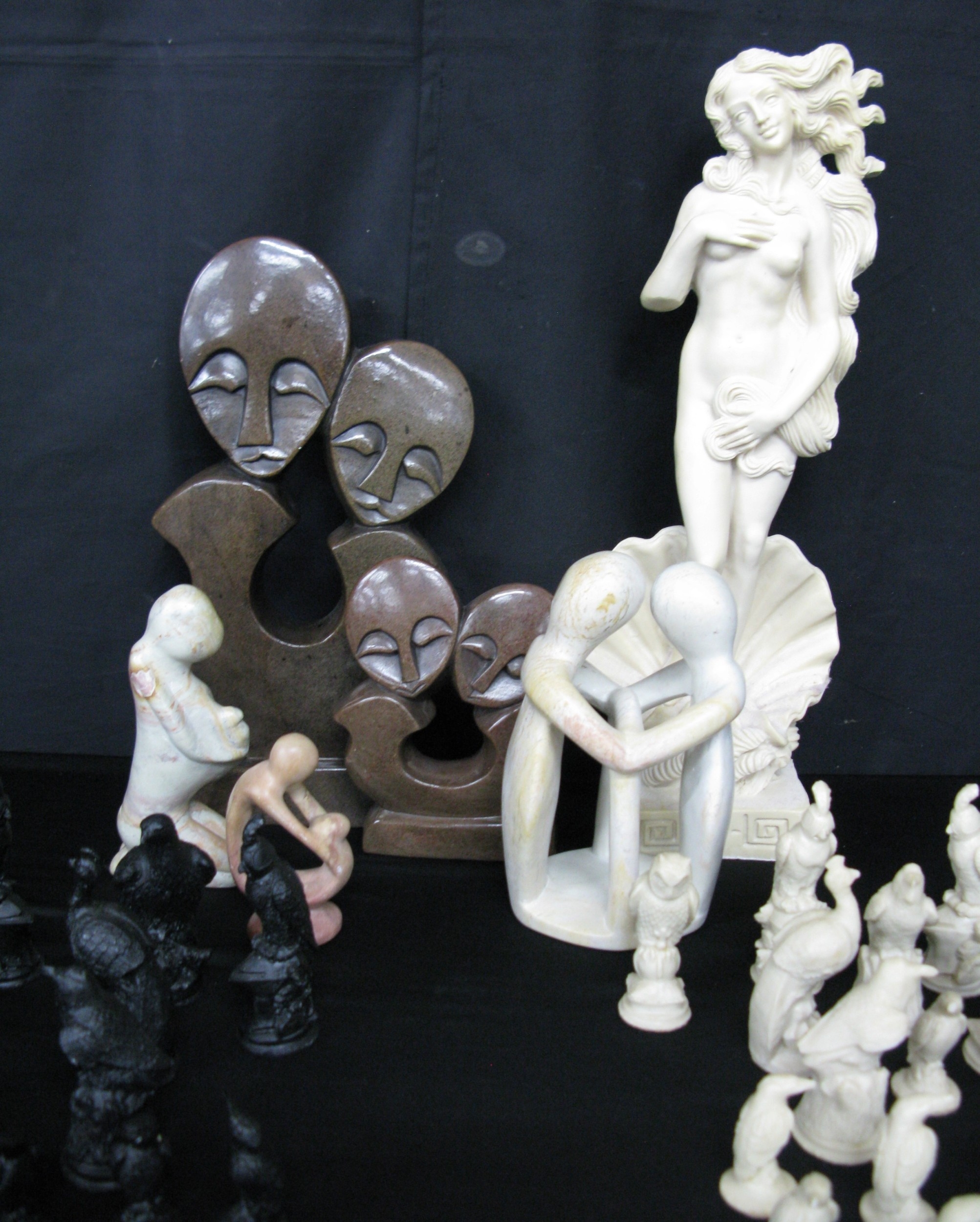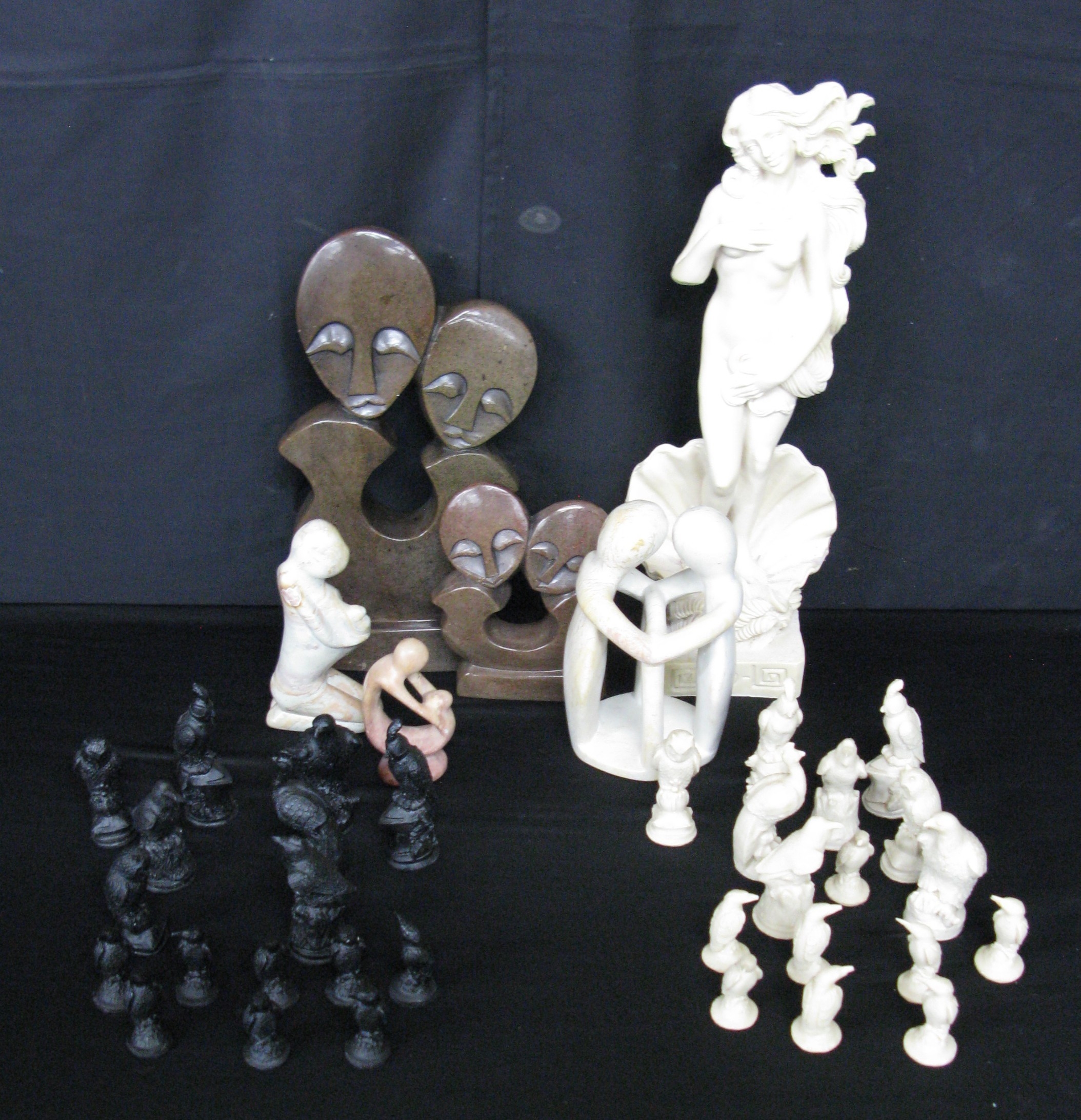 Two Shona style stone sculptures - 31.5cm and 16cm tall together with three soapstone sculptures - 10cm x 19cm tall, a modern Venus sculpture and resin black and cream chess pieces based on birds
