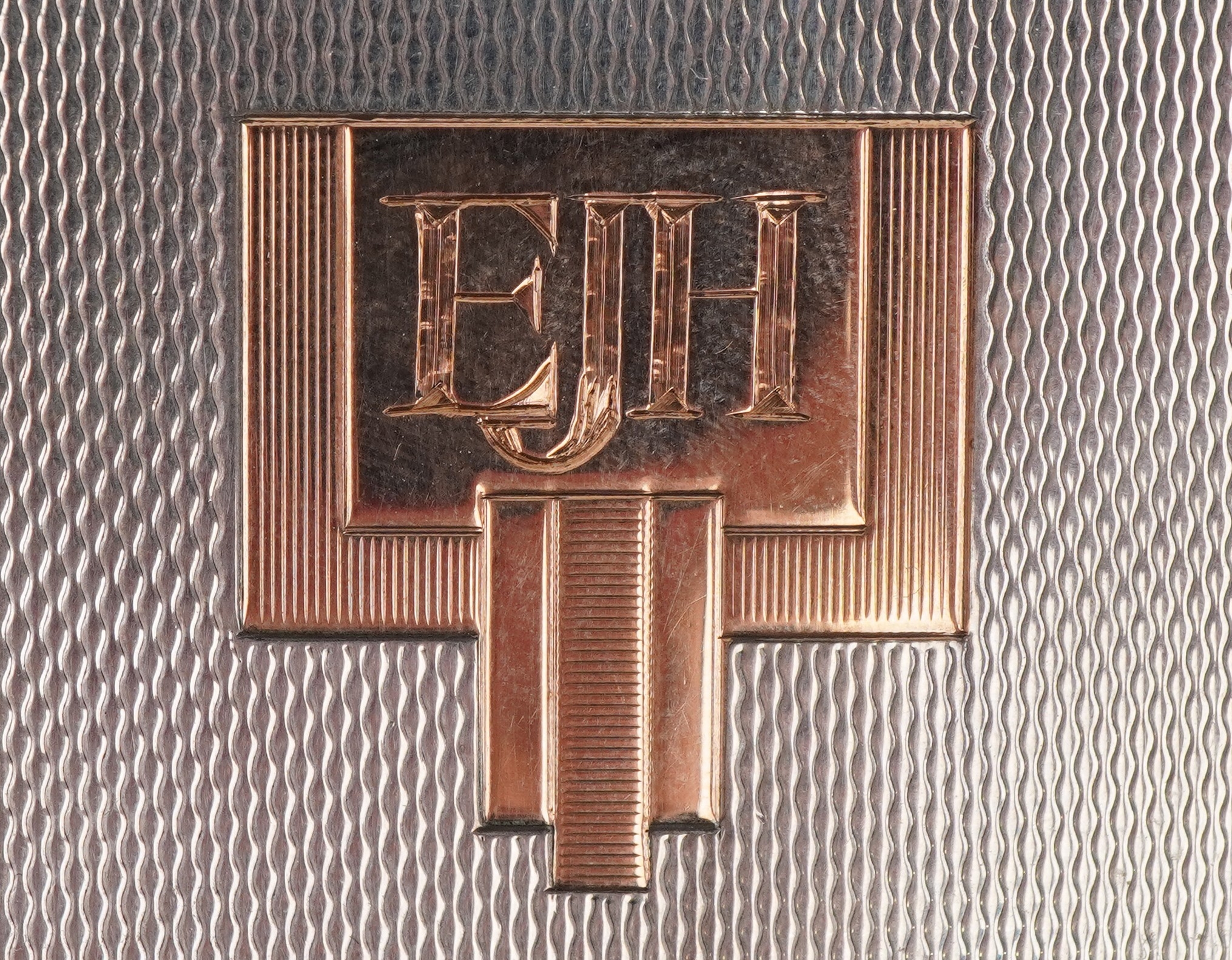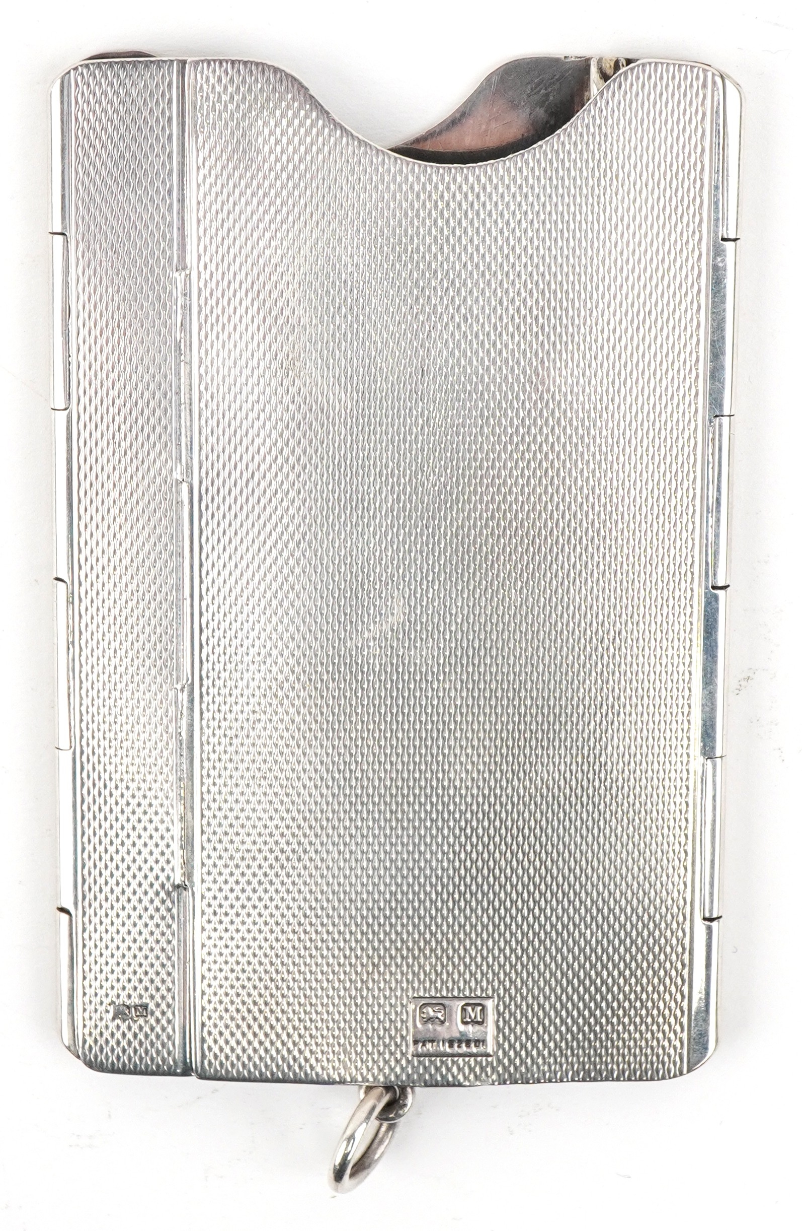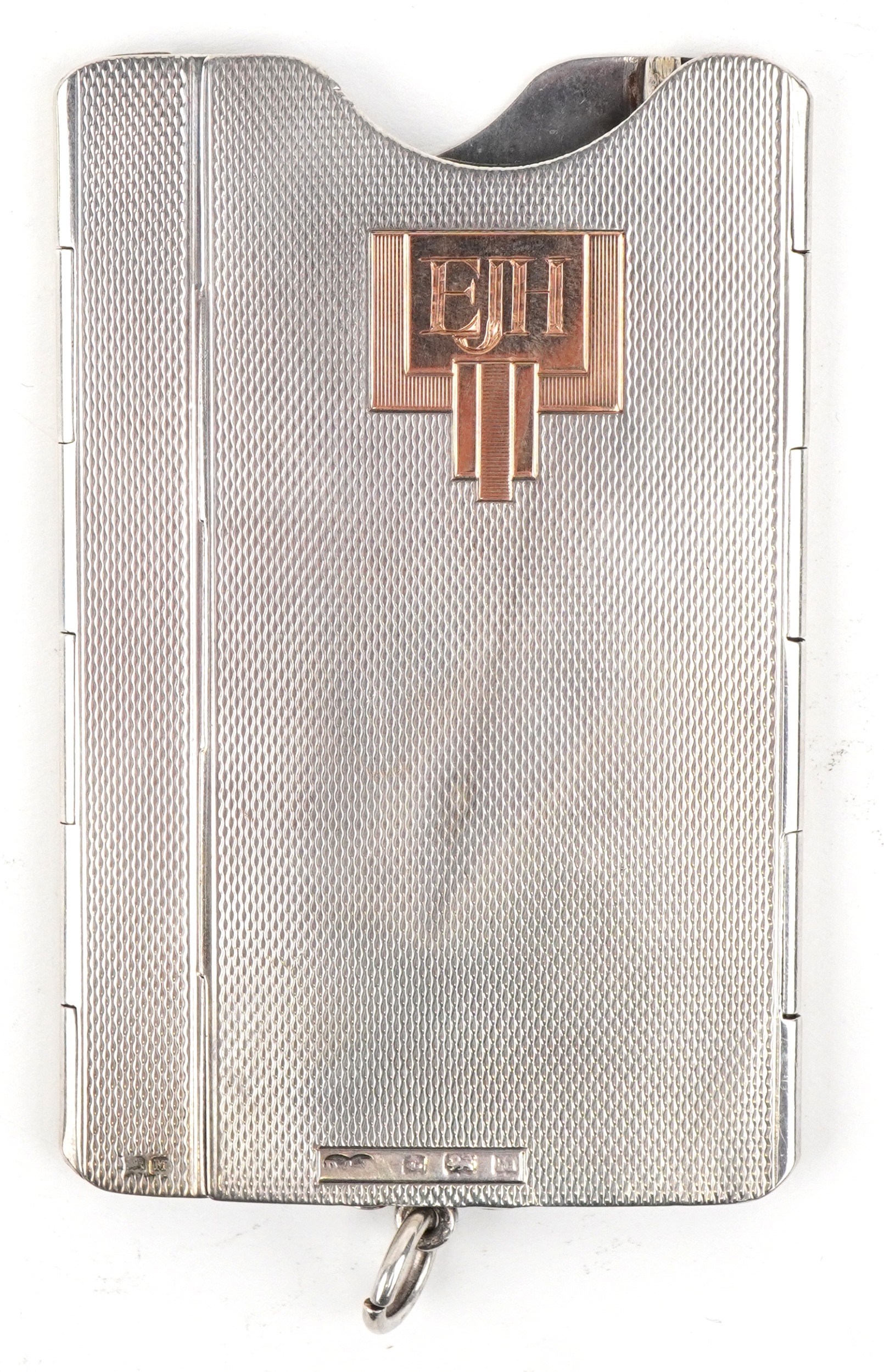 An unusual Art Deco engine turned silver folding card case with gold monogram, indistinct maker, Birmingham 1936, 8.5cm high, 63.2g