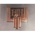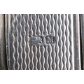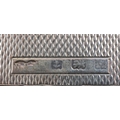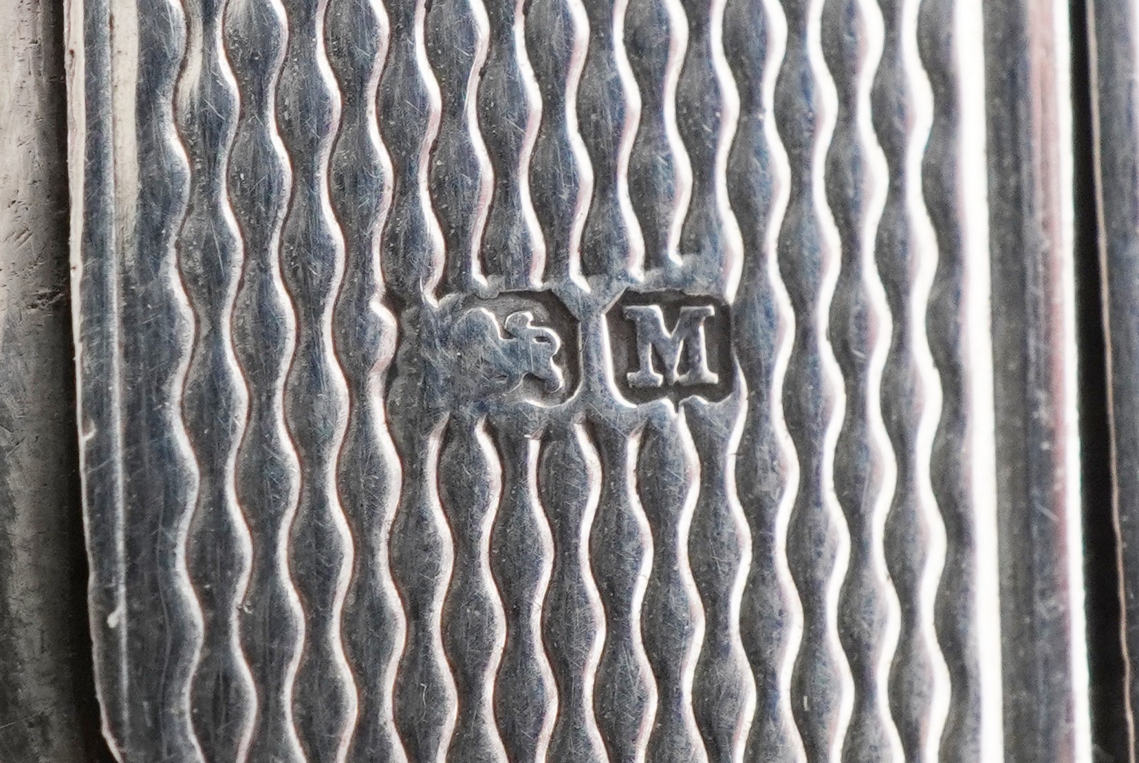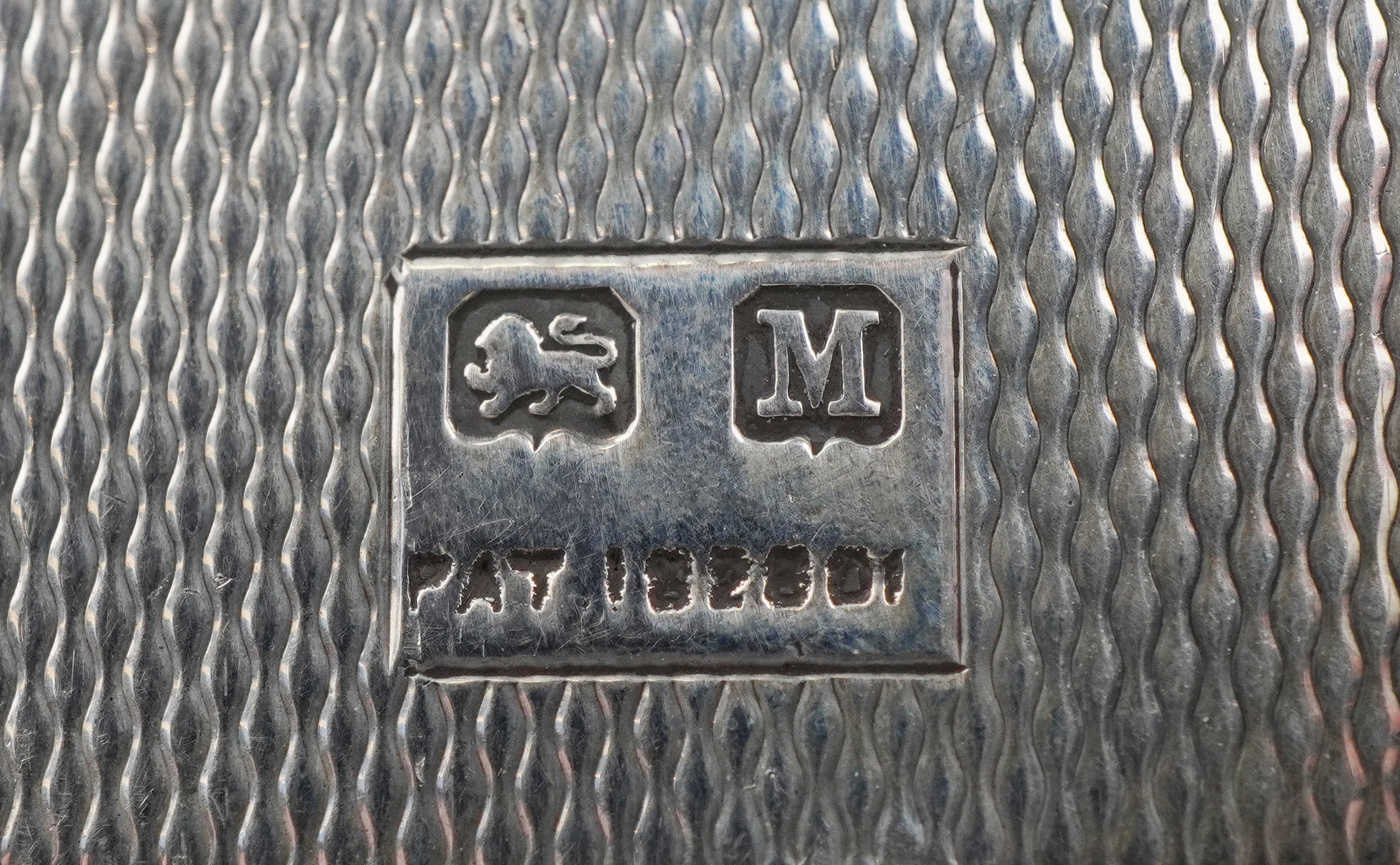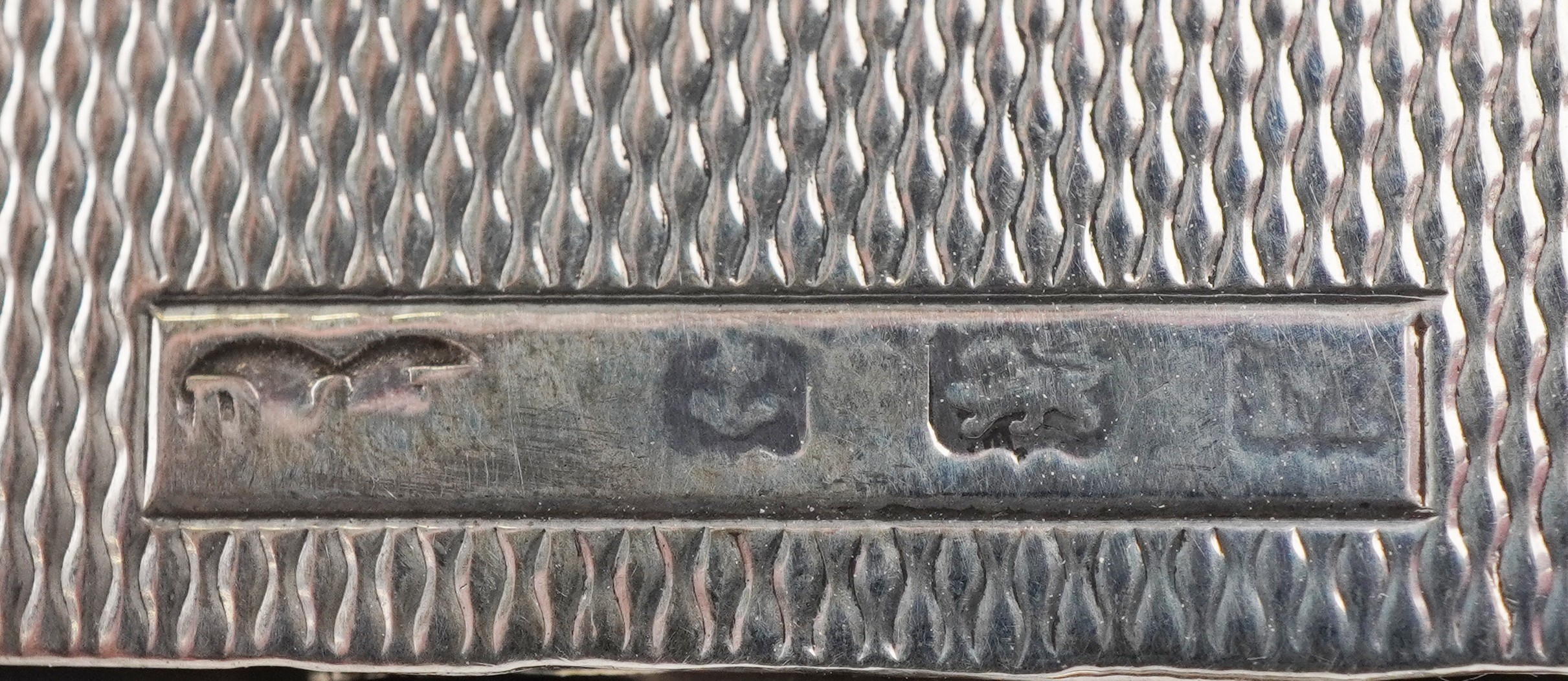 An unusual Art Deco engine turned silver folding card case with gold monogram, indistinct maker, Birmingham 1936, 8.5cm high, 63.2g