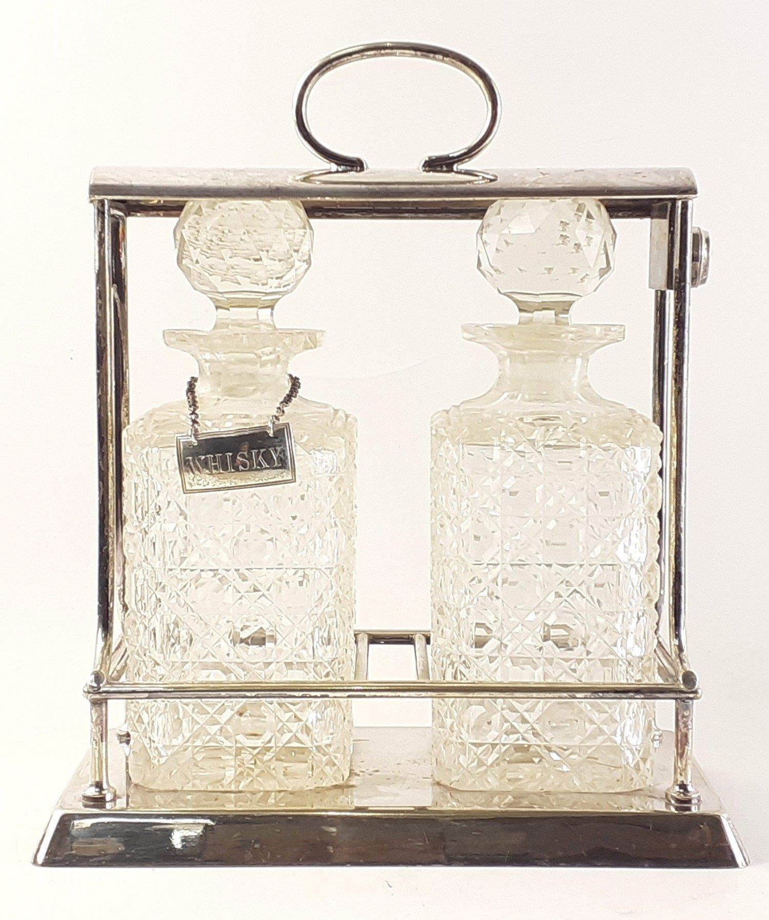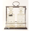 A silver plated TANTALUS with two decanters, neither with a label. Note the lid is locked and there is no key.