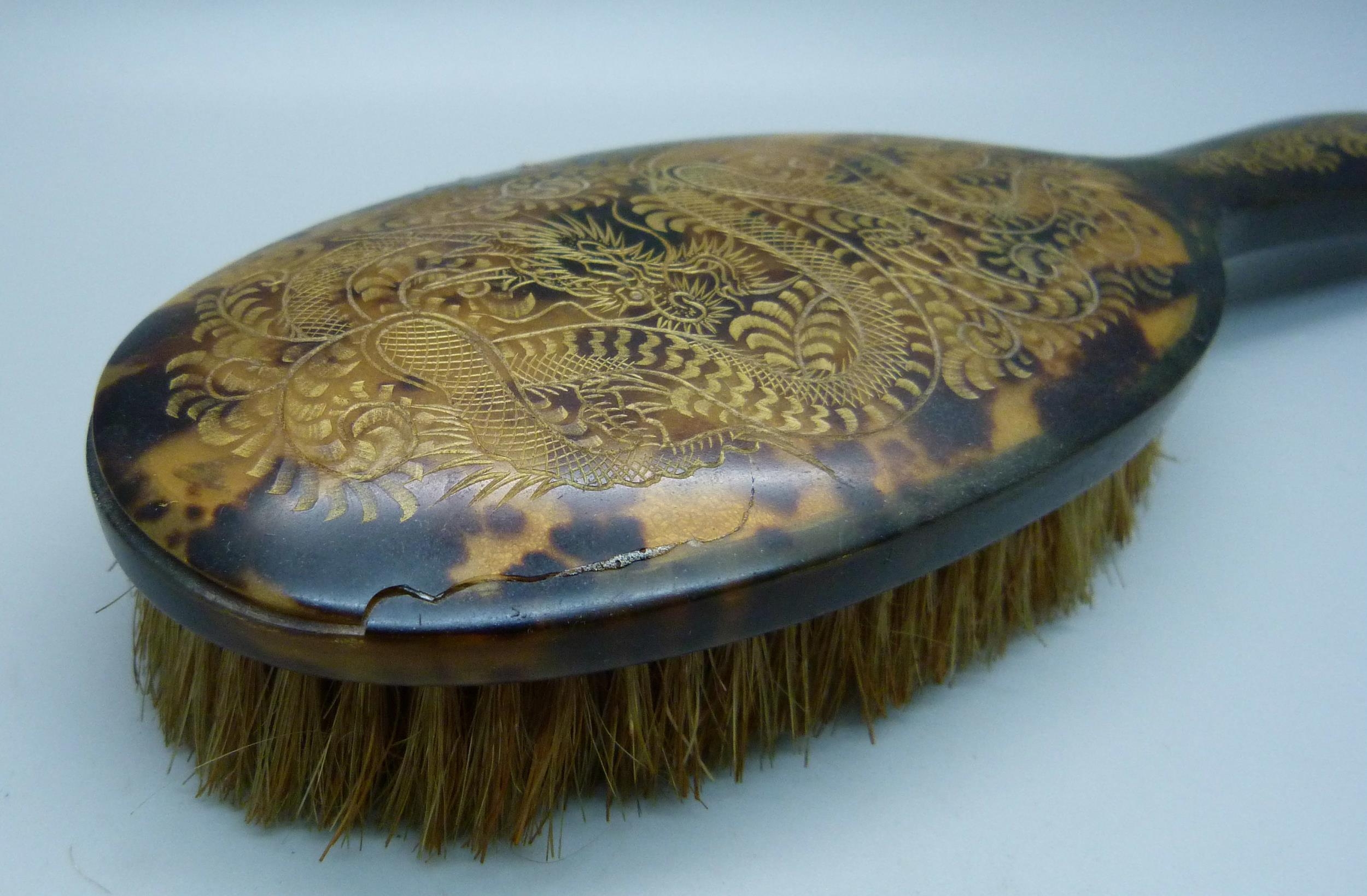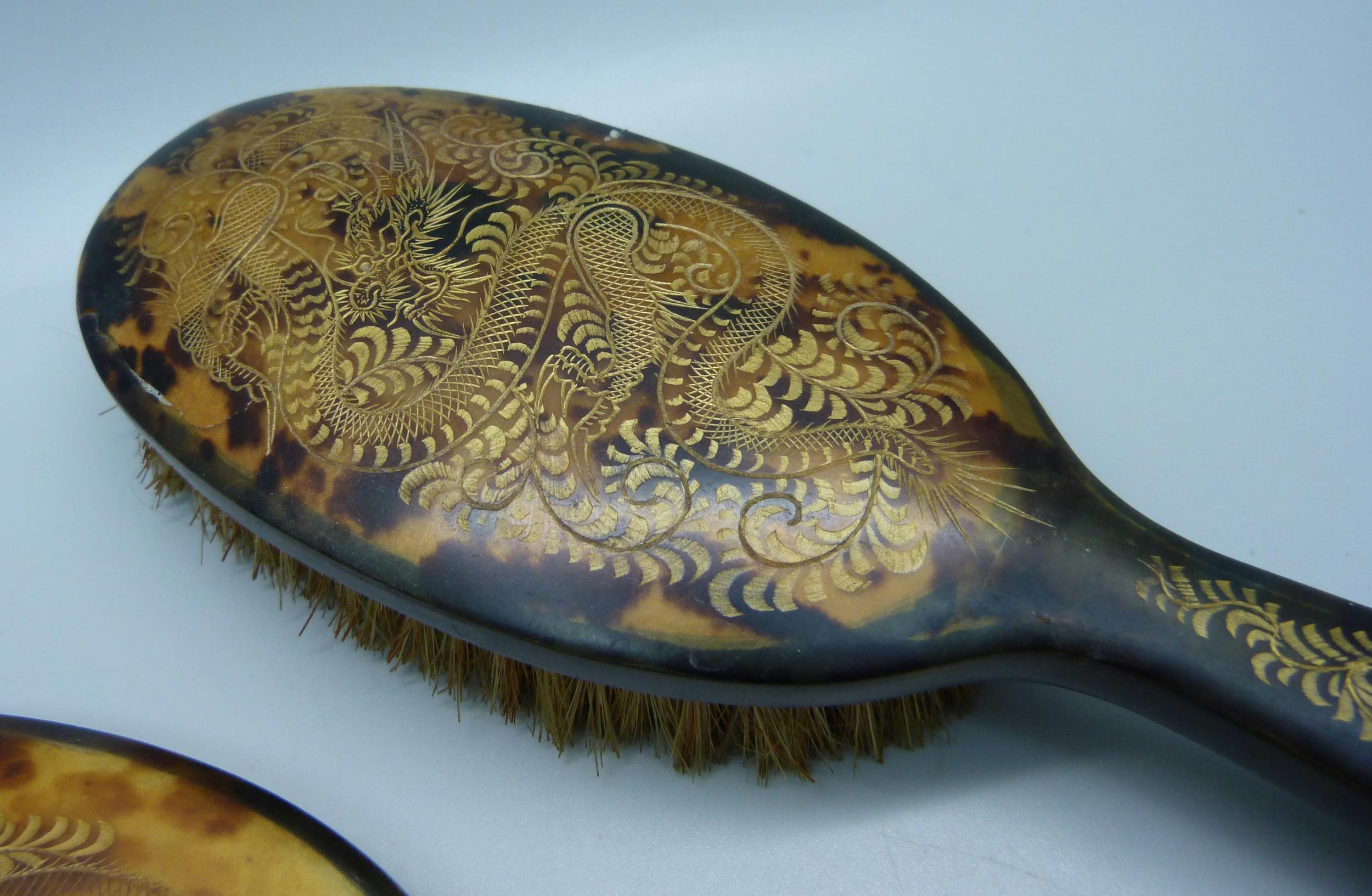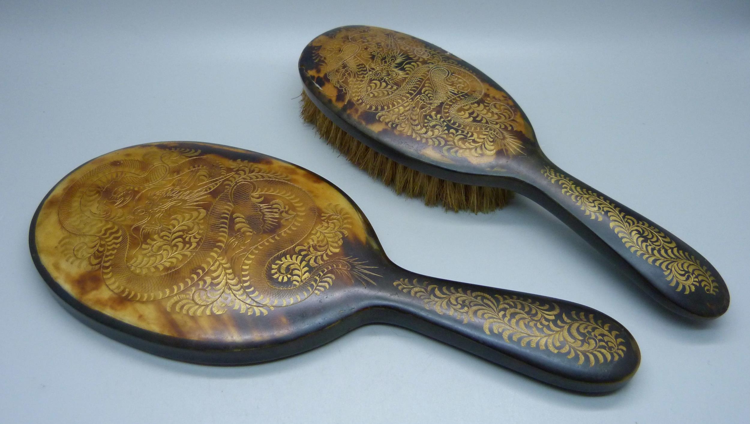 A hand mirror and brush, with carved oriental dragon detail, brush a/f