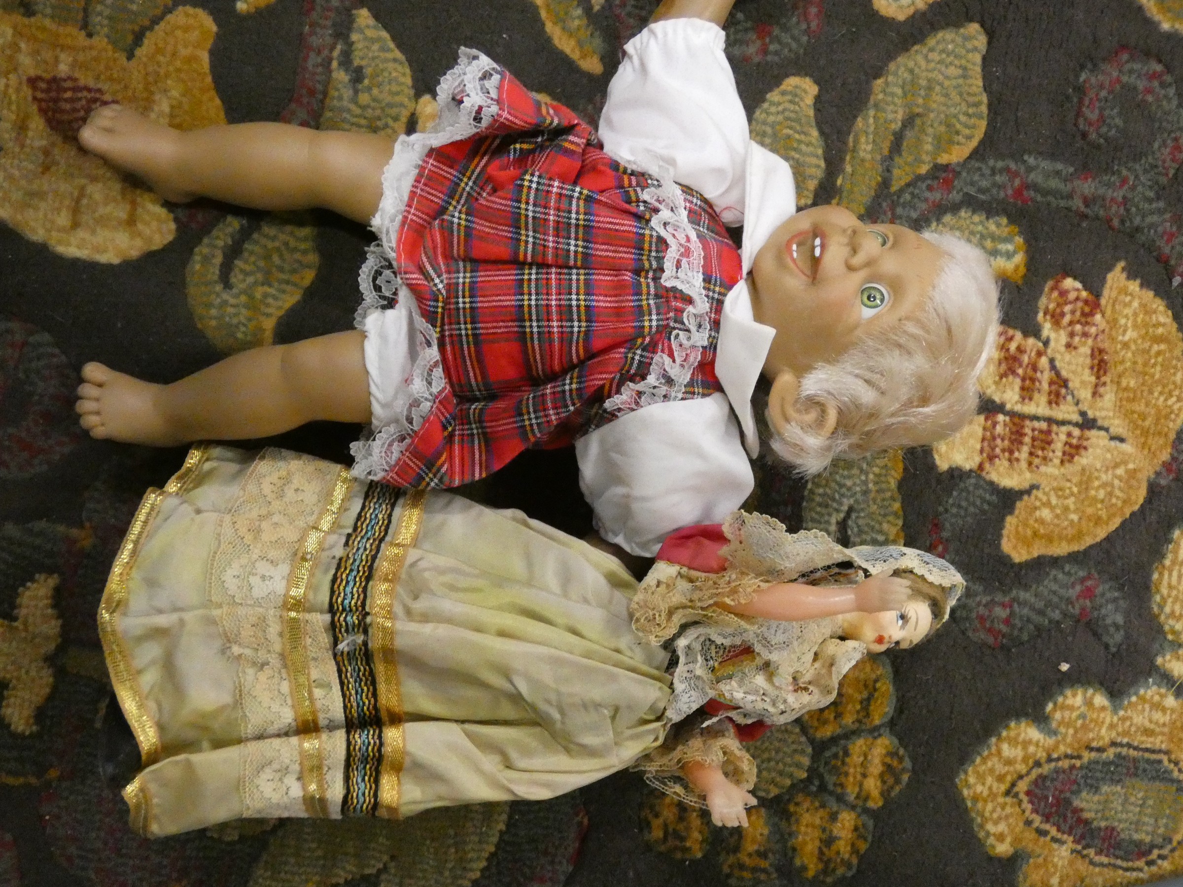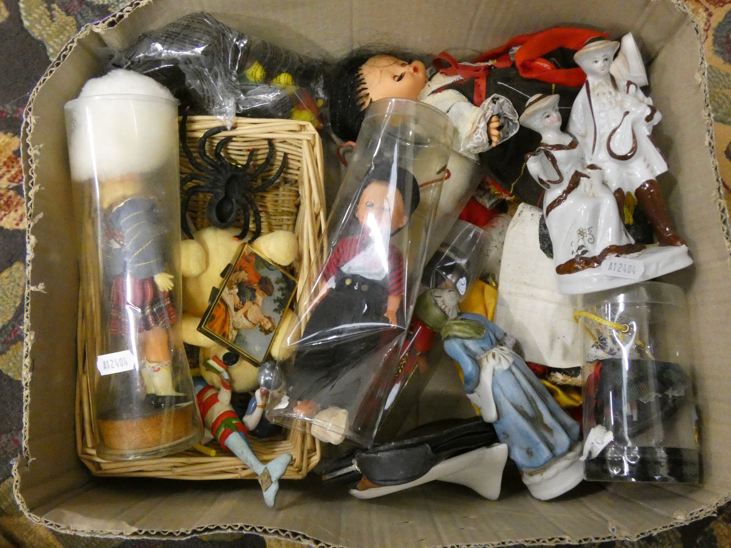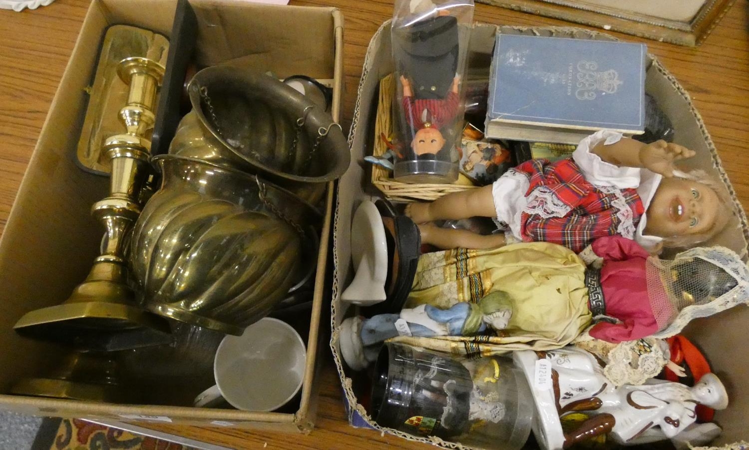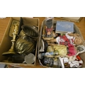 Two boxes of miscellaneous items to include dolls, brassware, etc.