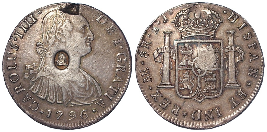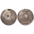 Dollar, George III oval countermark on a Spanish Peru silver 8 Reales 1796 LIMAE IJ, S.3765A, 27.15g, lightly toned VF-GVF with a flan flaw or ex-mount damage 12 o'clock.