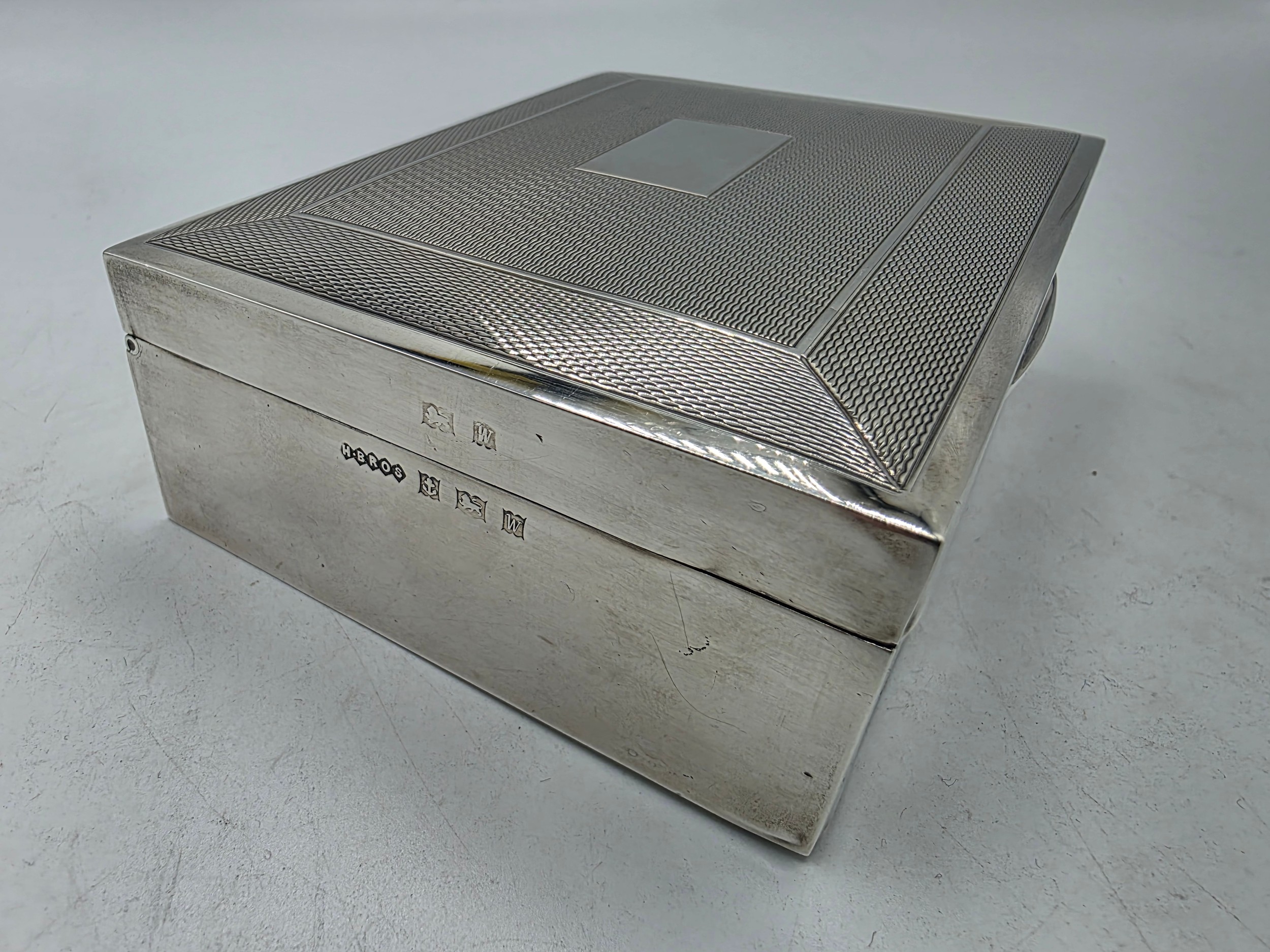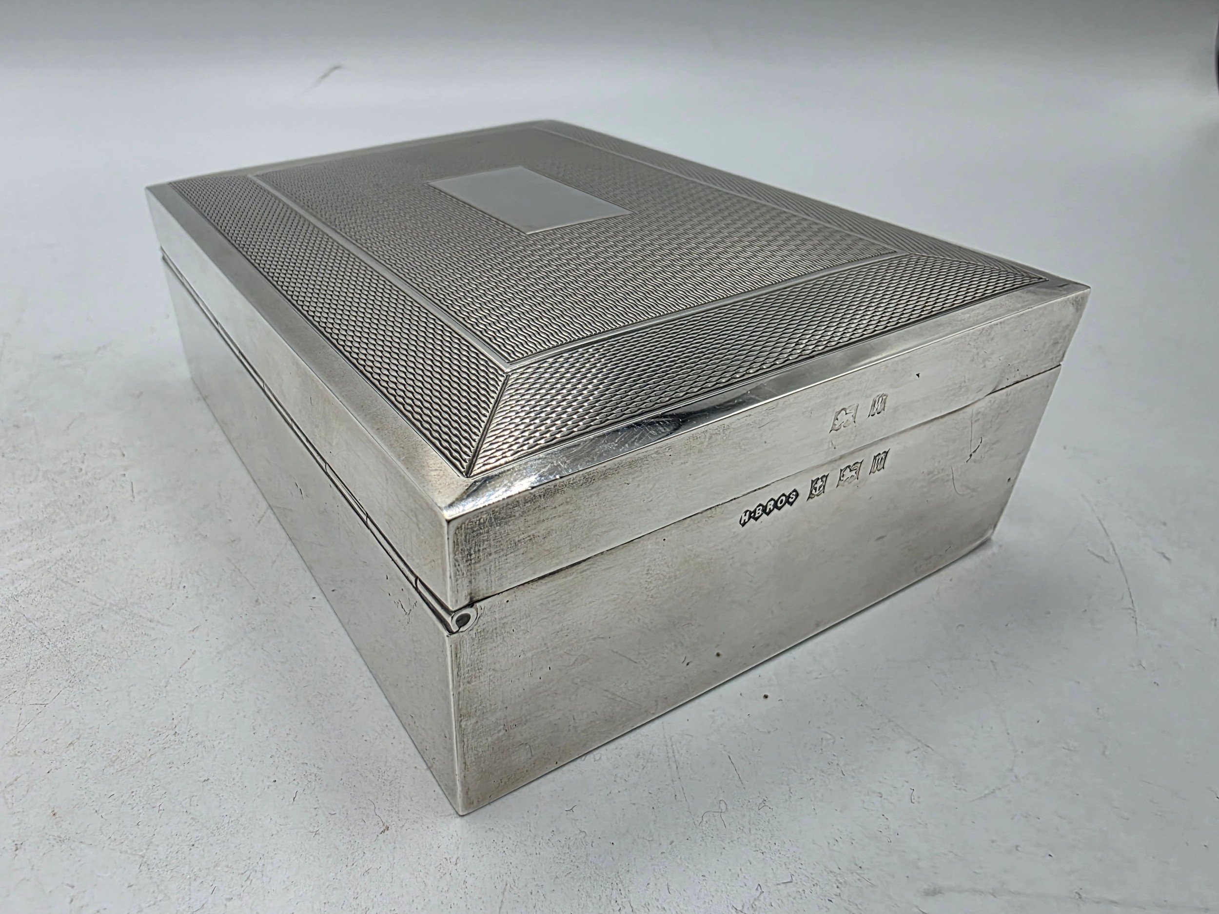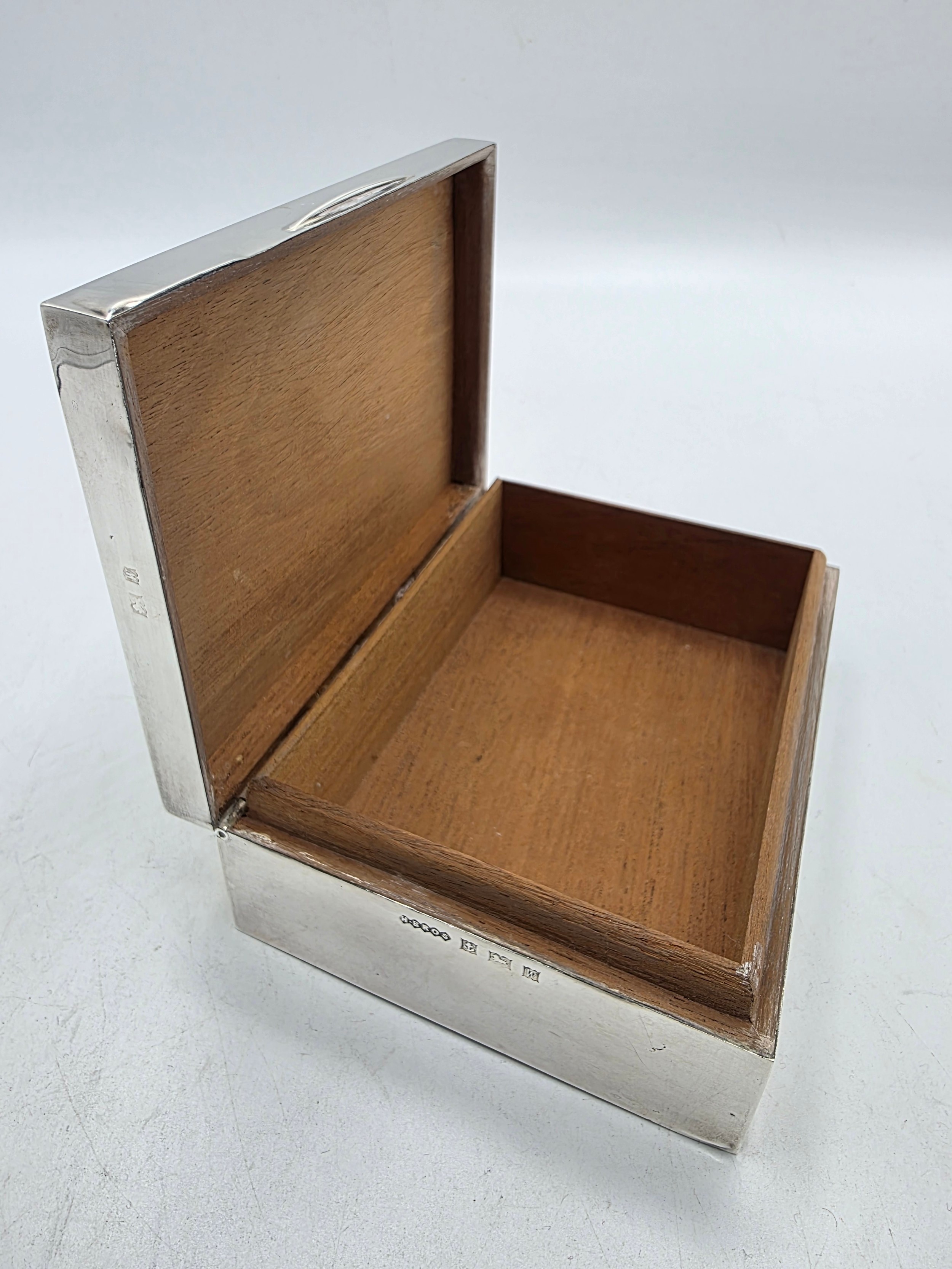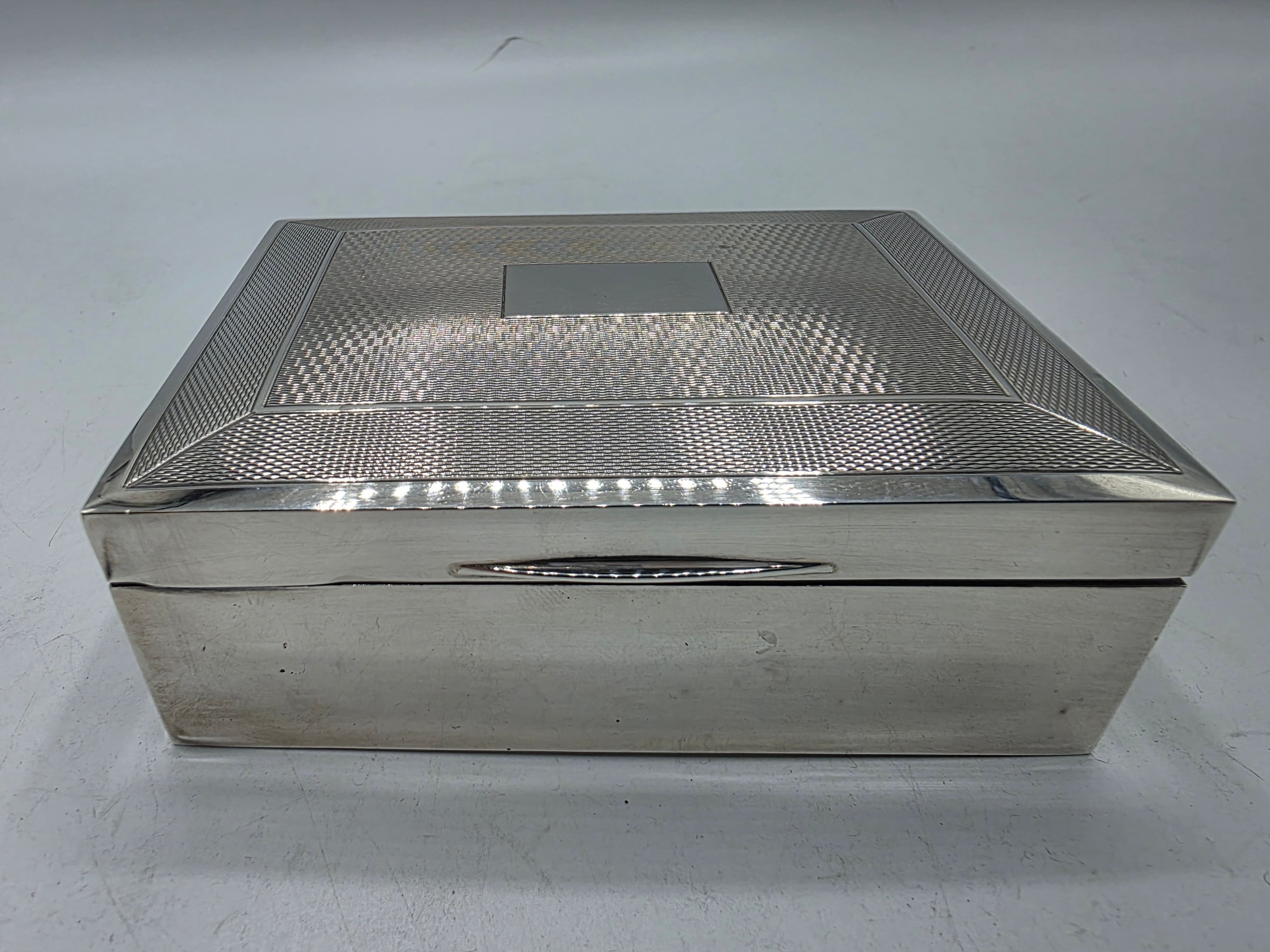 A sterling silver cedar lined cigarette box with engine turned decoration. Harman Brothers Birmingham 1971. Gross weight 330 g