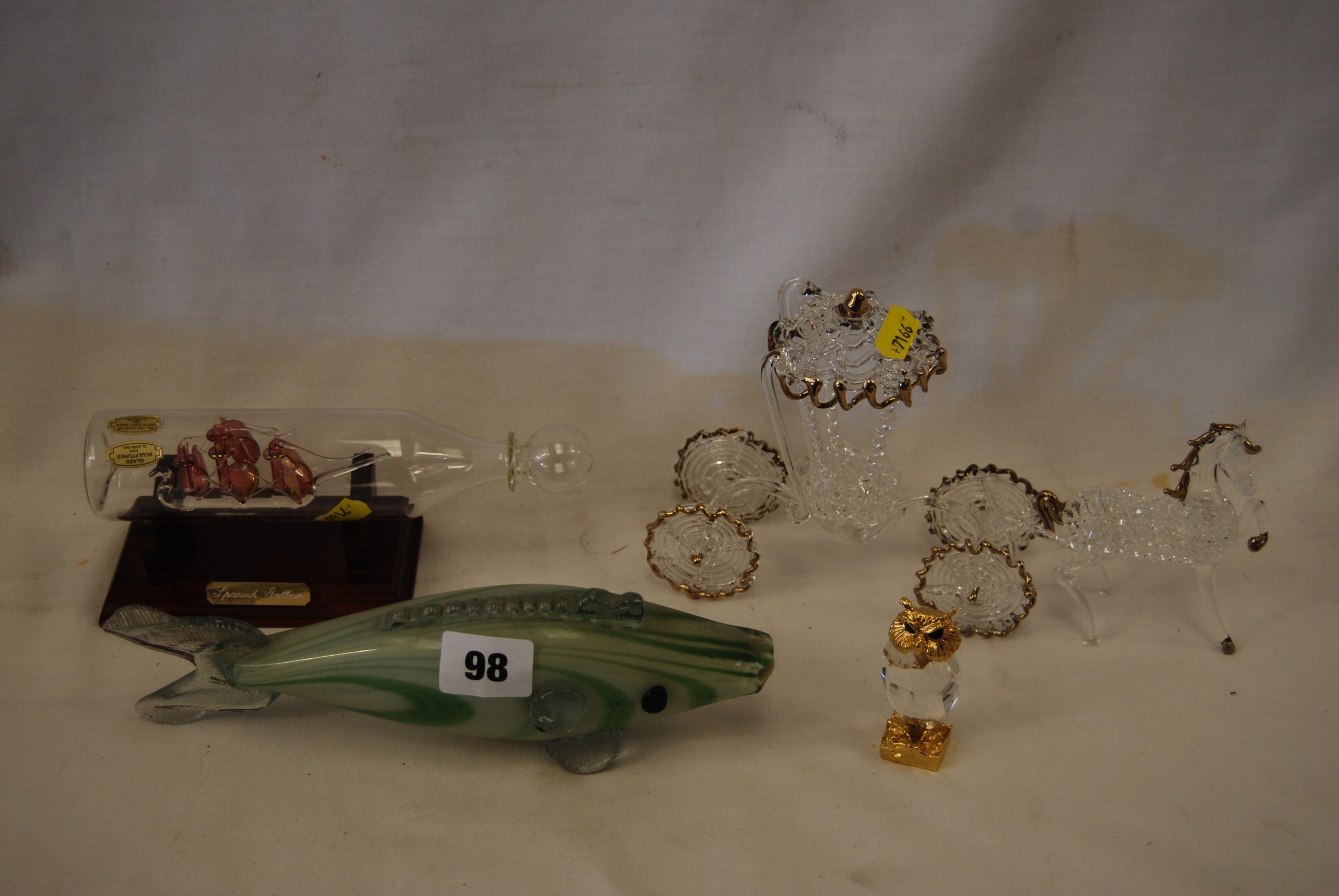 GLASS COACH & HORSES, GLASS SHIP IN A BOTTLE, GLASS FISH & GOLD PLATED CRYSTAL OWL