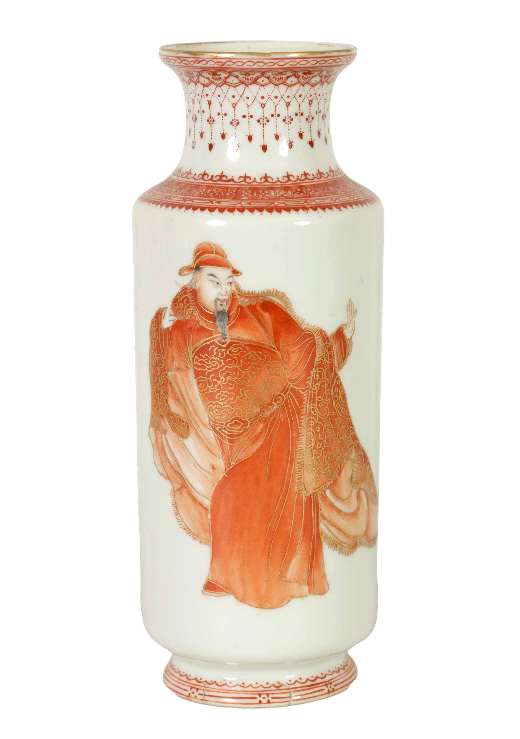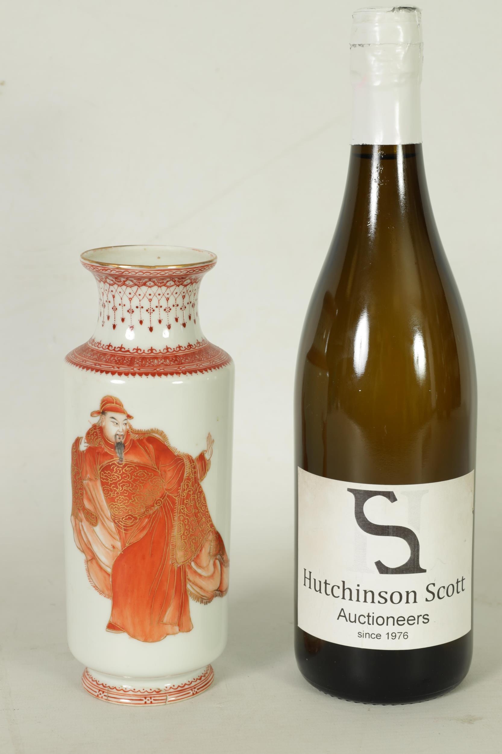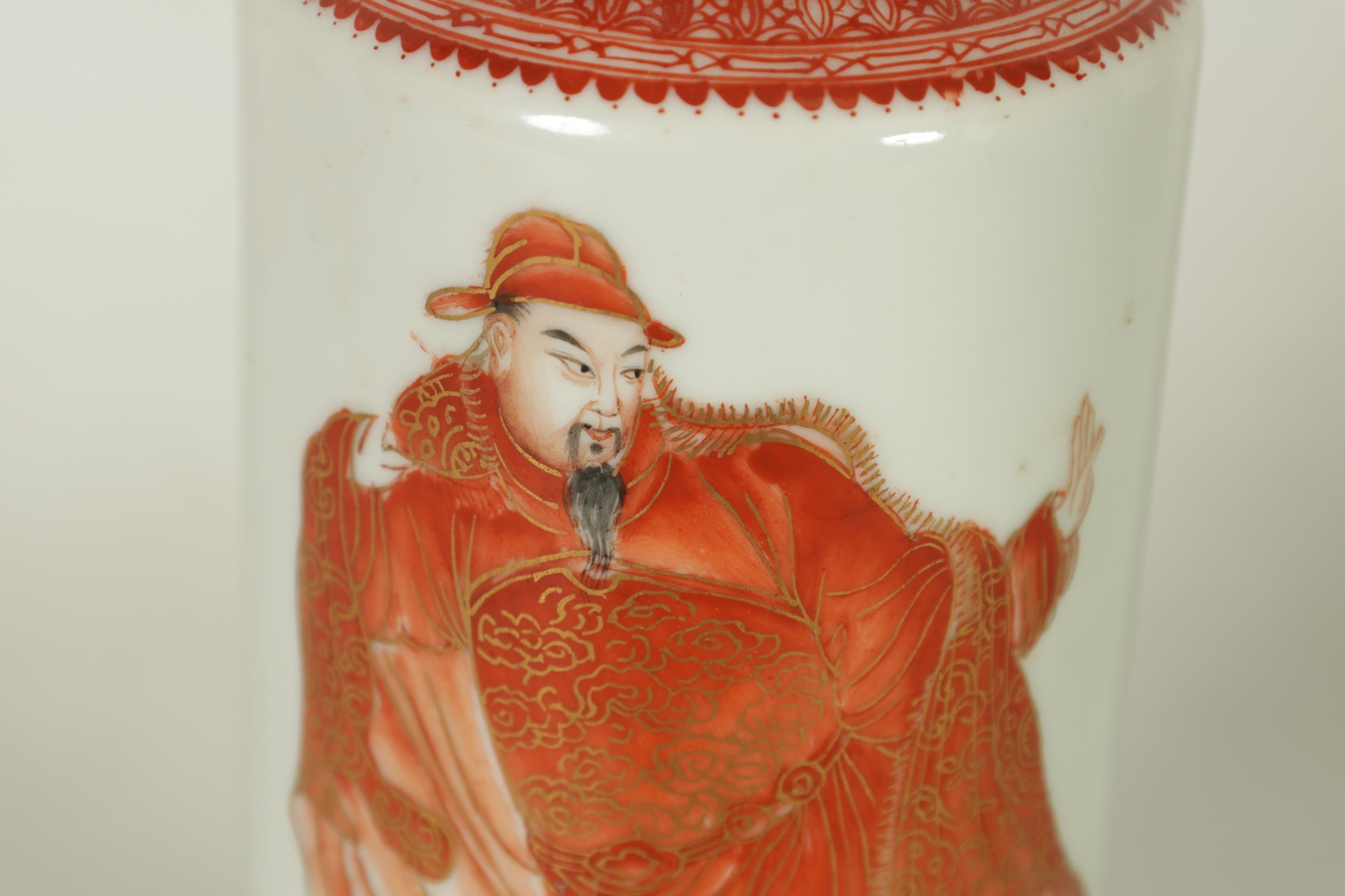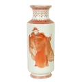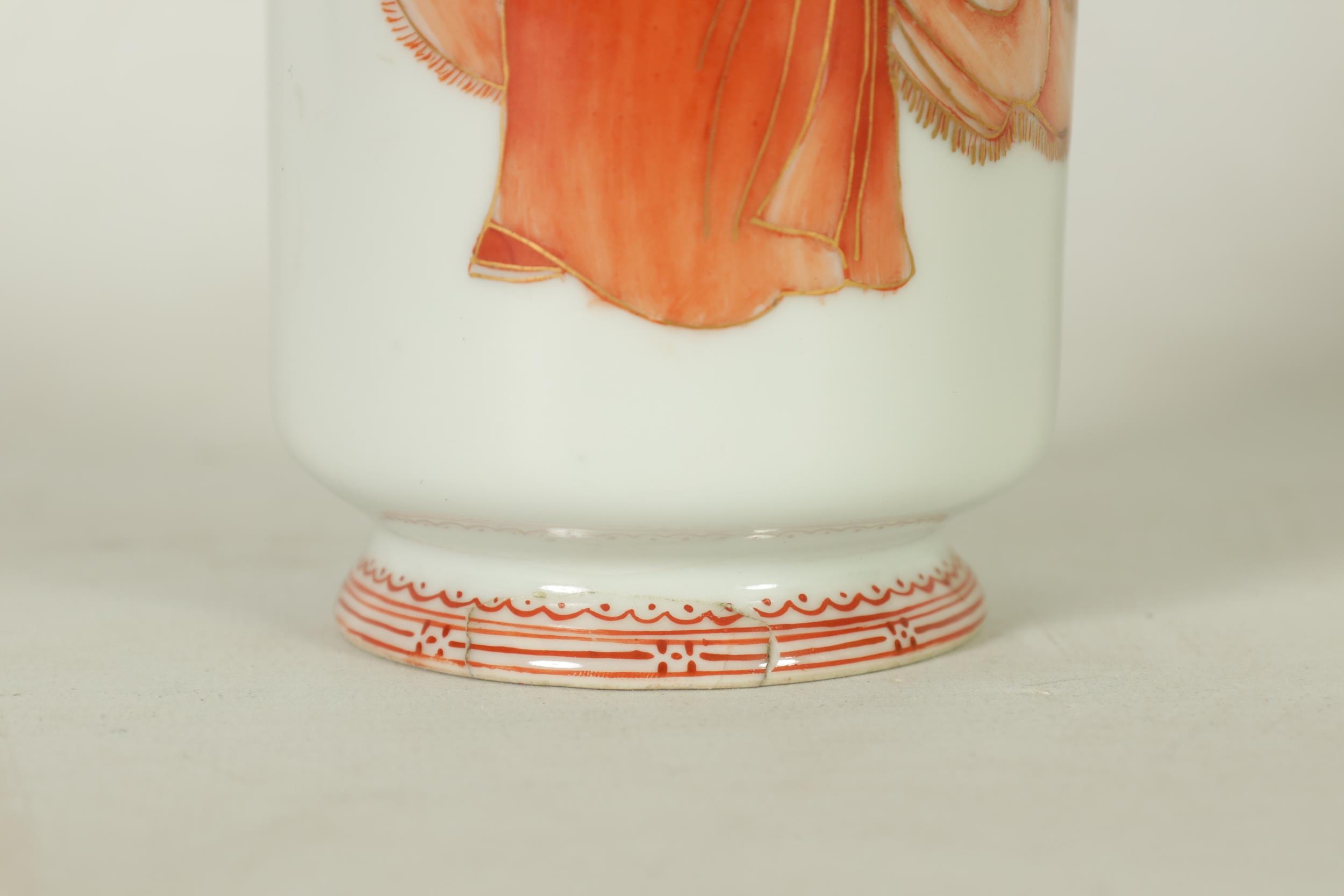 A CHINESE REPUBLIC PORCELAIN VASE with rust red and gilt work figural decoration, inscribed script to the reverse - square seal mark beneath (19cm high )