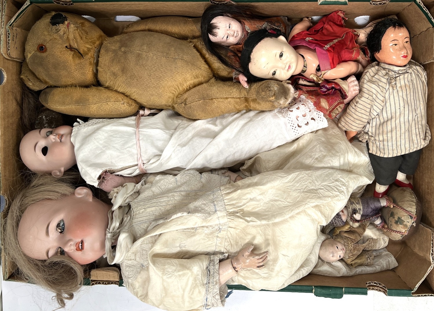 A German bisque porcelain head doll by Armand Marseille, A8M, jointed composition body, another doll, a vintage teddy bear and other dolls.