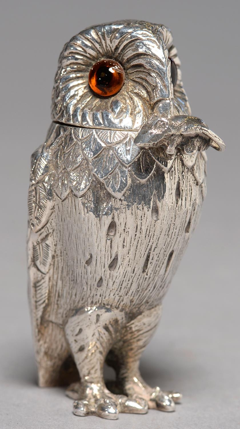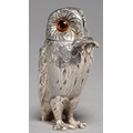 AN ELIZABETH II SILVER OWL NOVELTY SALT CELLAR AND SPOON WITH MOUSE TERMINAL, AMBER COLOURED EYES, 7CM H, BY W. COMYNS & SONS LTD, LONDON 1960, STAMPED UNDER FOOT 3, SPOON UNMARKED 4 OZ 2 DWT
